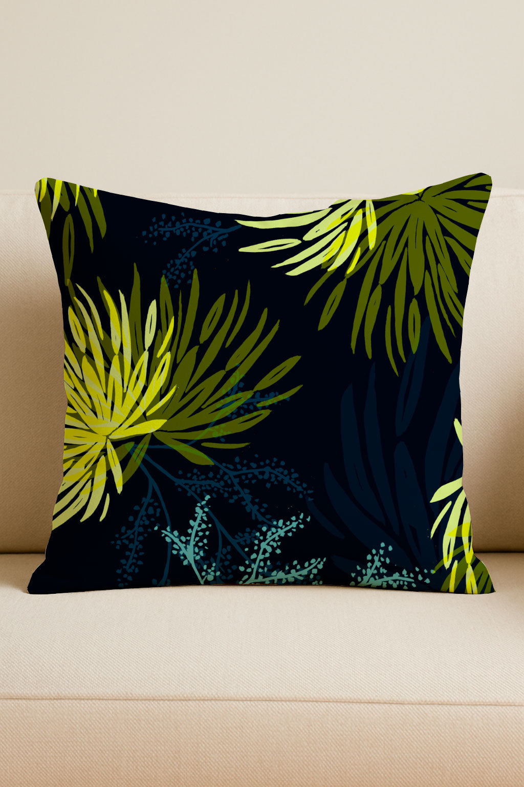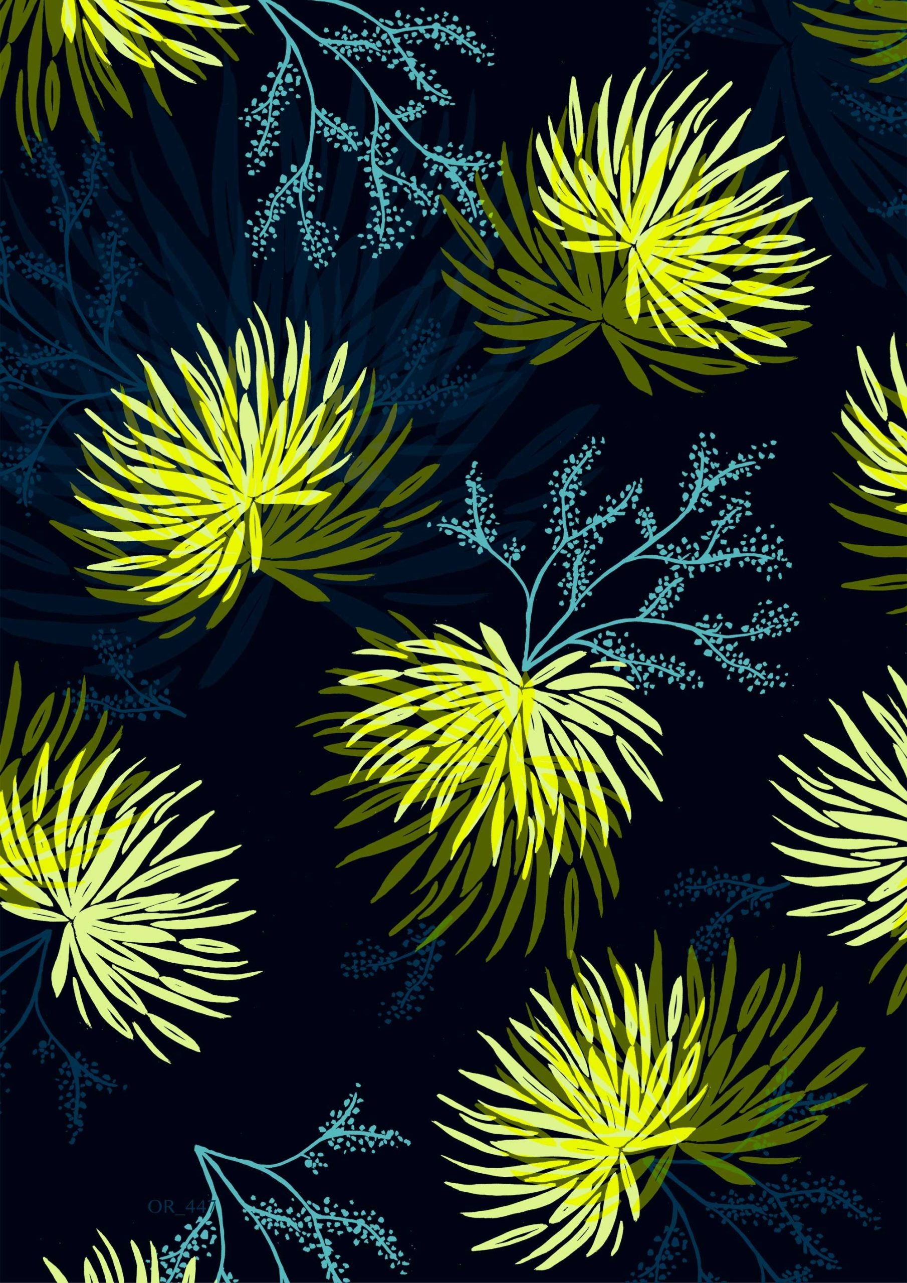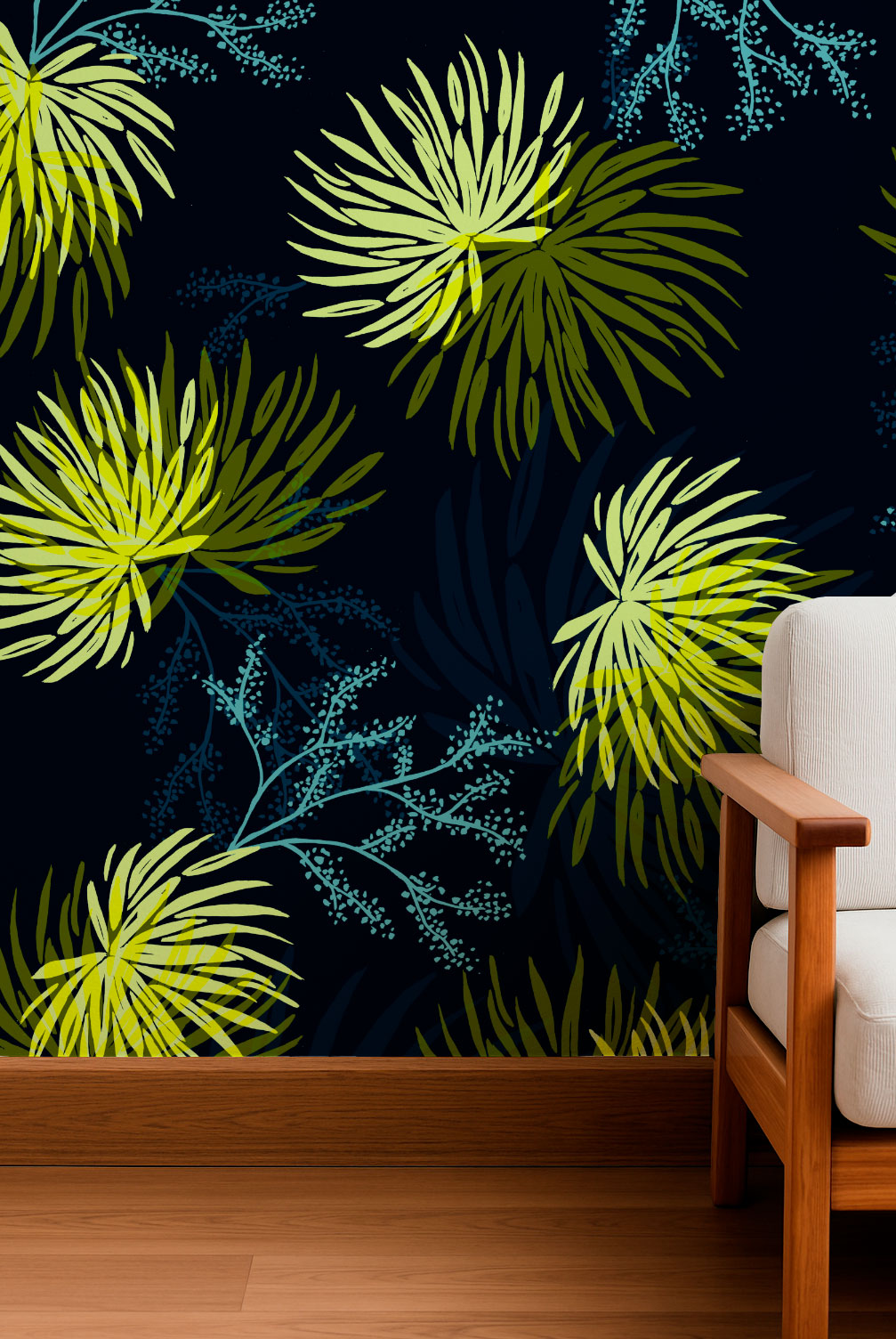El llamativo estampado botánico presenta grandes flores radiales en vibrantes tonos lima y verde chartreuse, que recuerdan a los fuegos artificiales.
