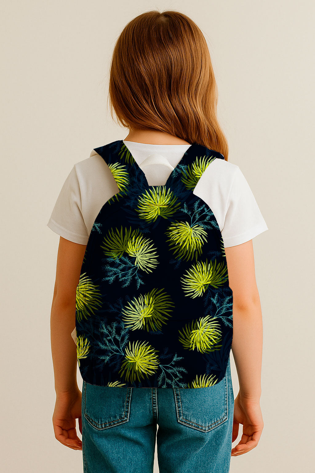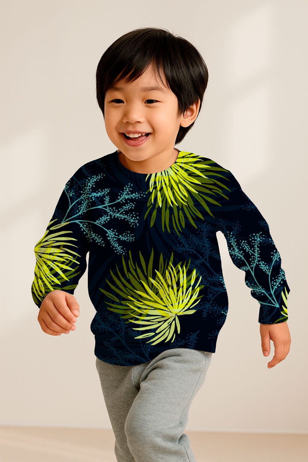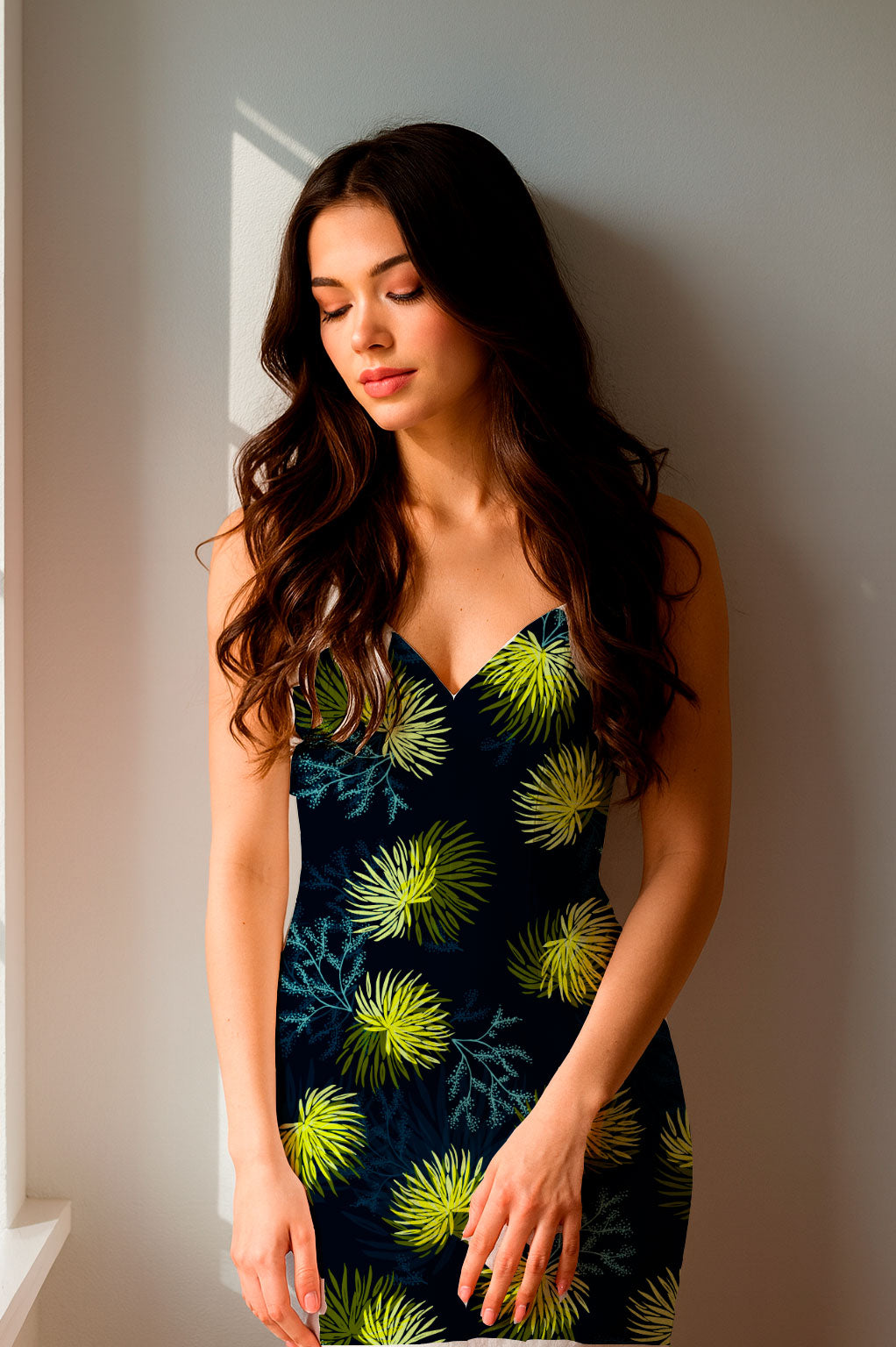El llamativo estampado botánico presenta grandes flores radiales en vibrantes tonos lima y verde chartreuse, que recuerdan a los fuegos artificiales.
