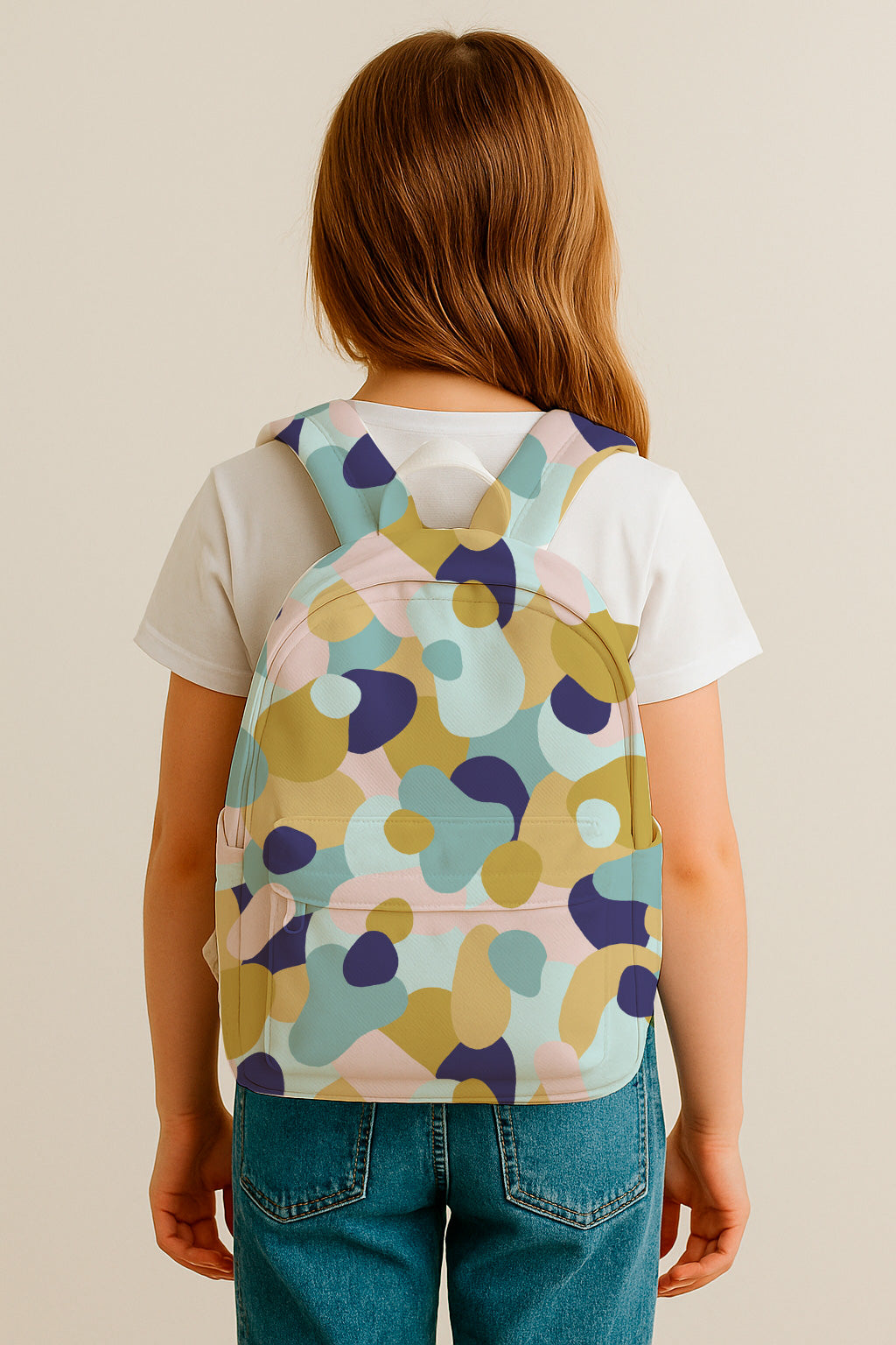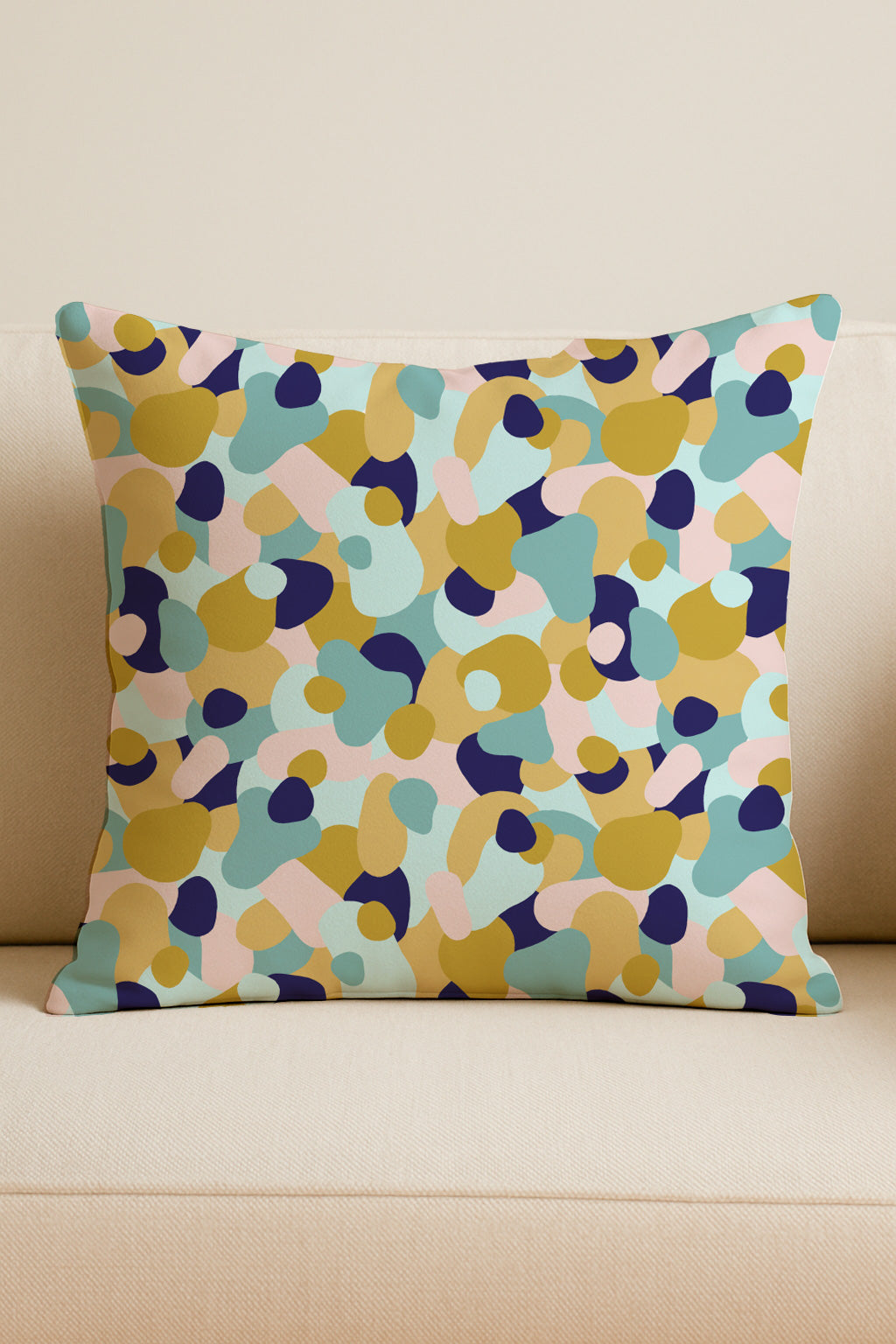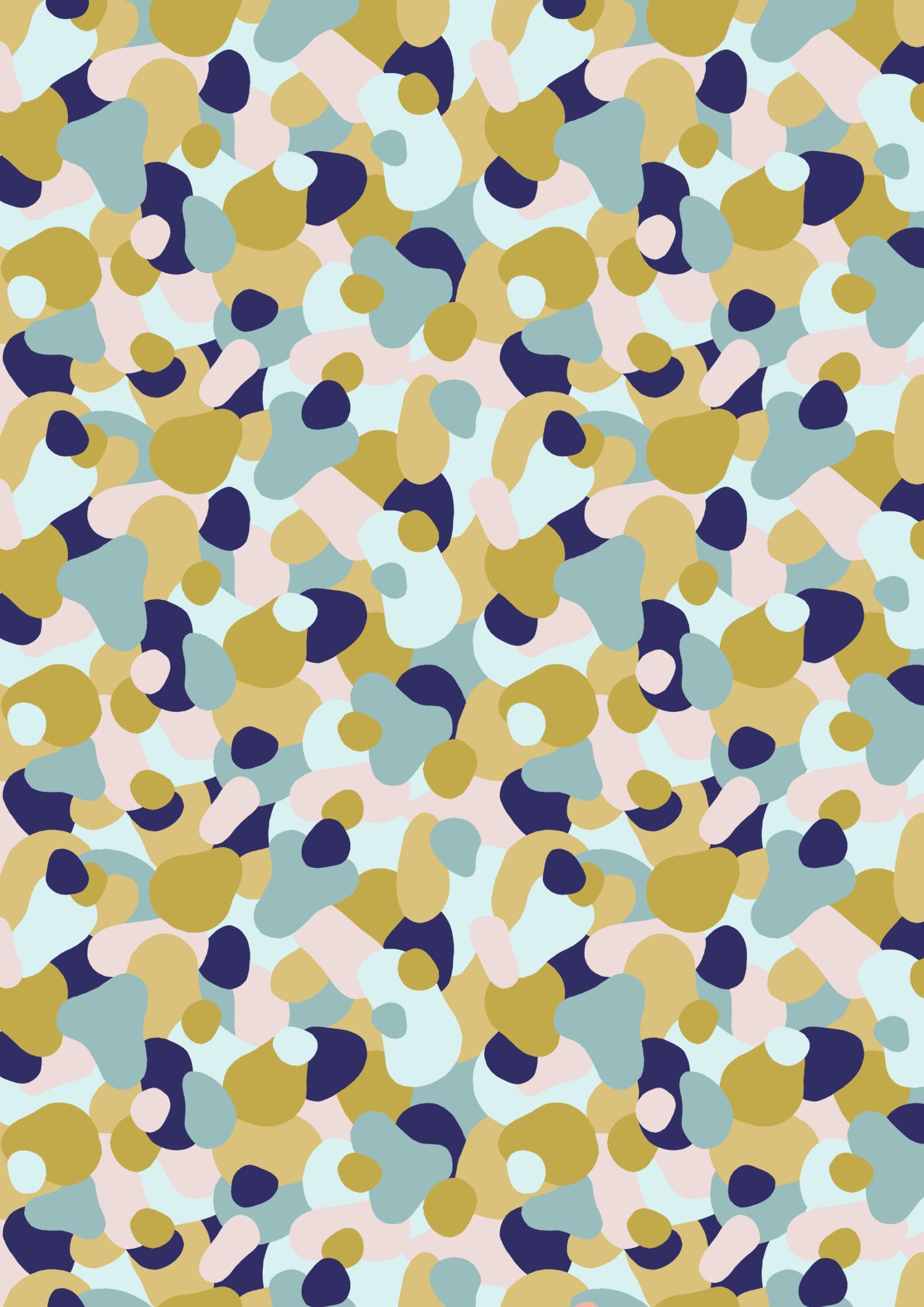 Playful abstract pattern of rounded pebble-like shapes in mustard yellow, navy, pastel pink and teal, scattered organically across a white background.