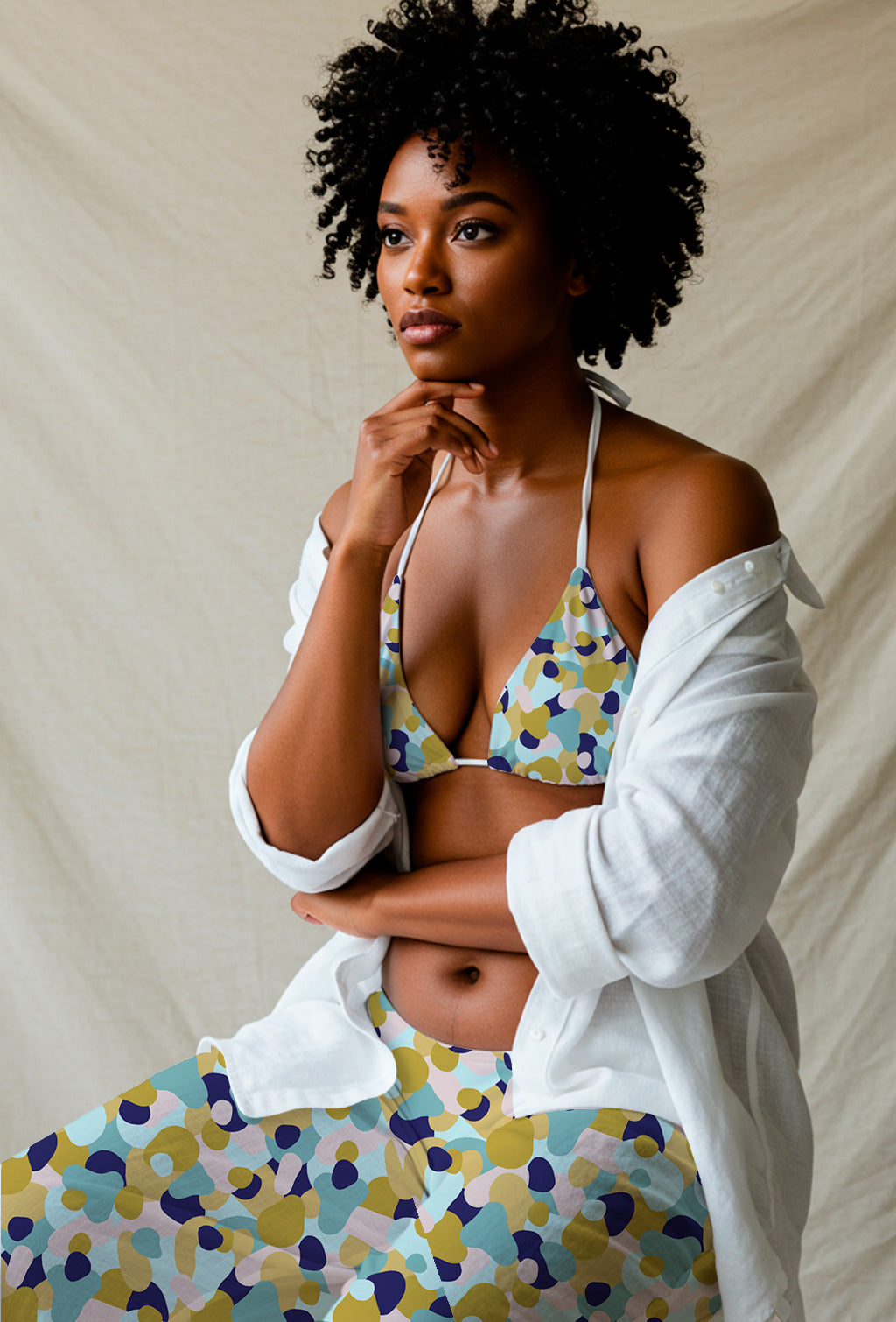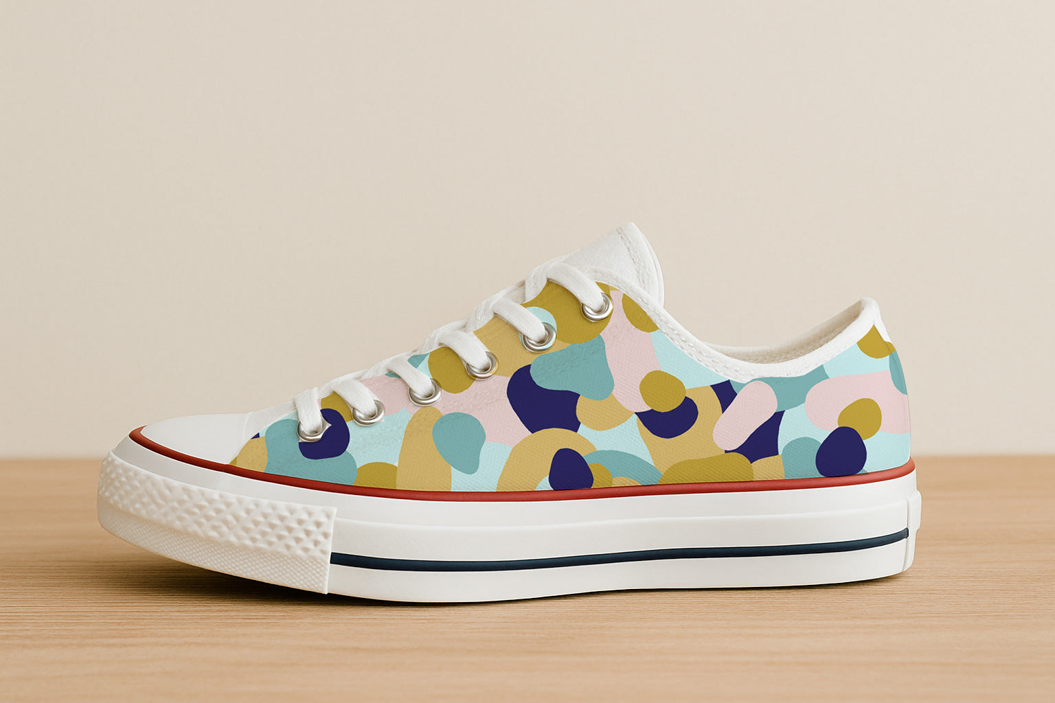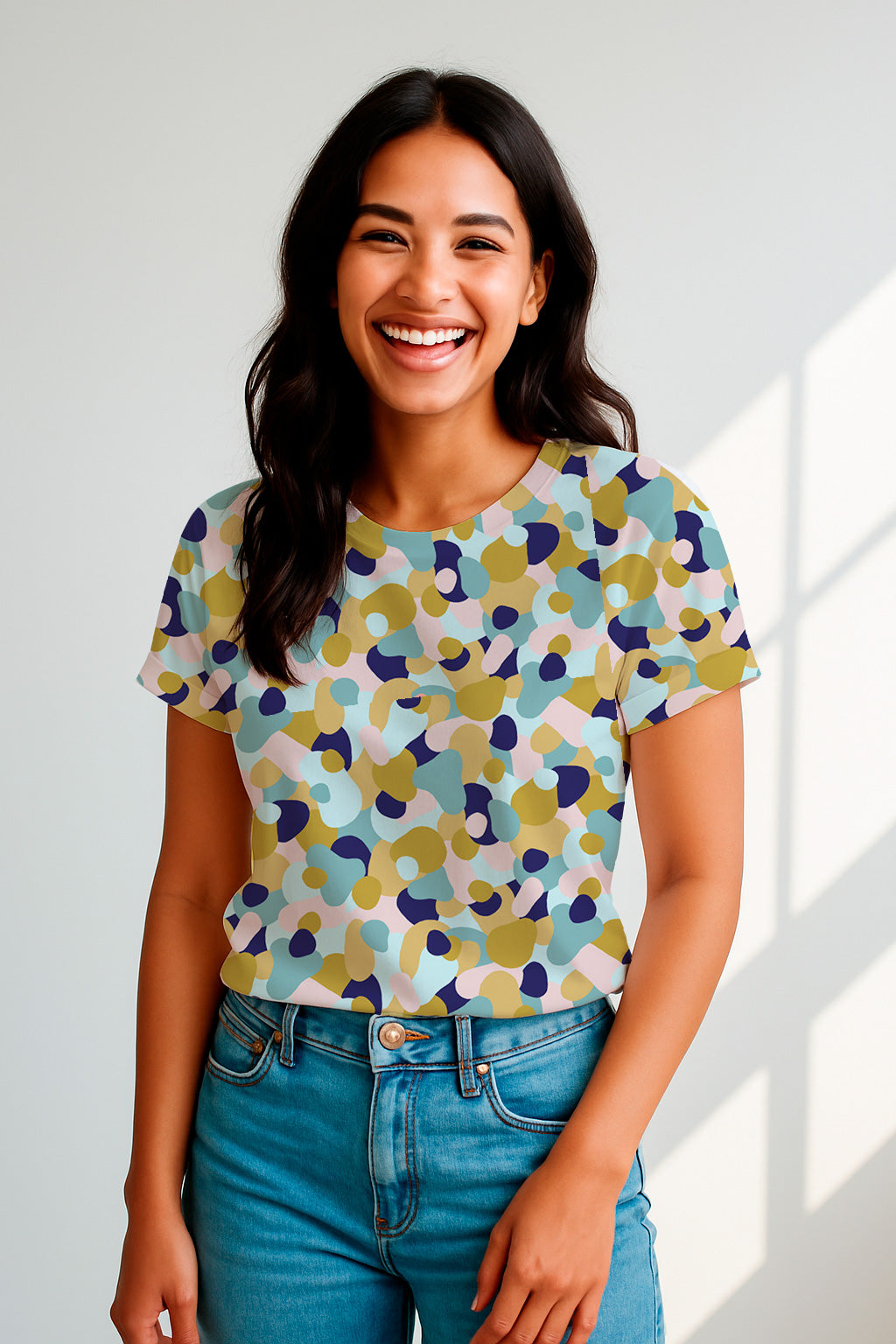 Playful abstract pattern of rounded pebble-like shapes in mustard yellow, navy, pastel pink and teal, scattered organically across a white background.