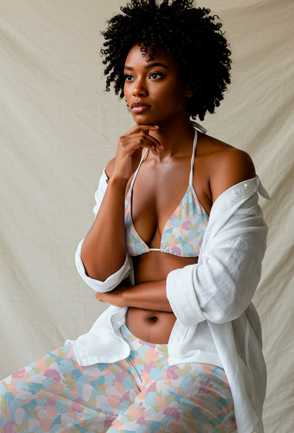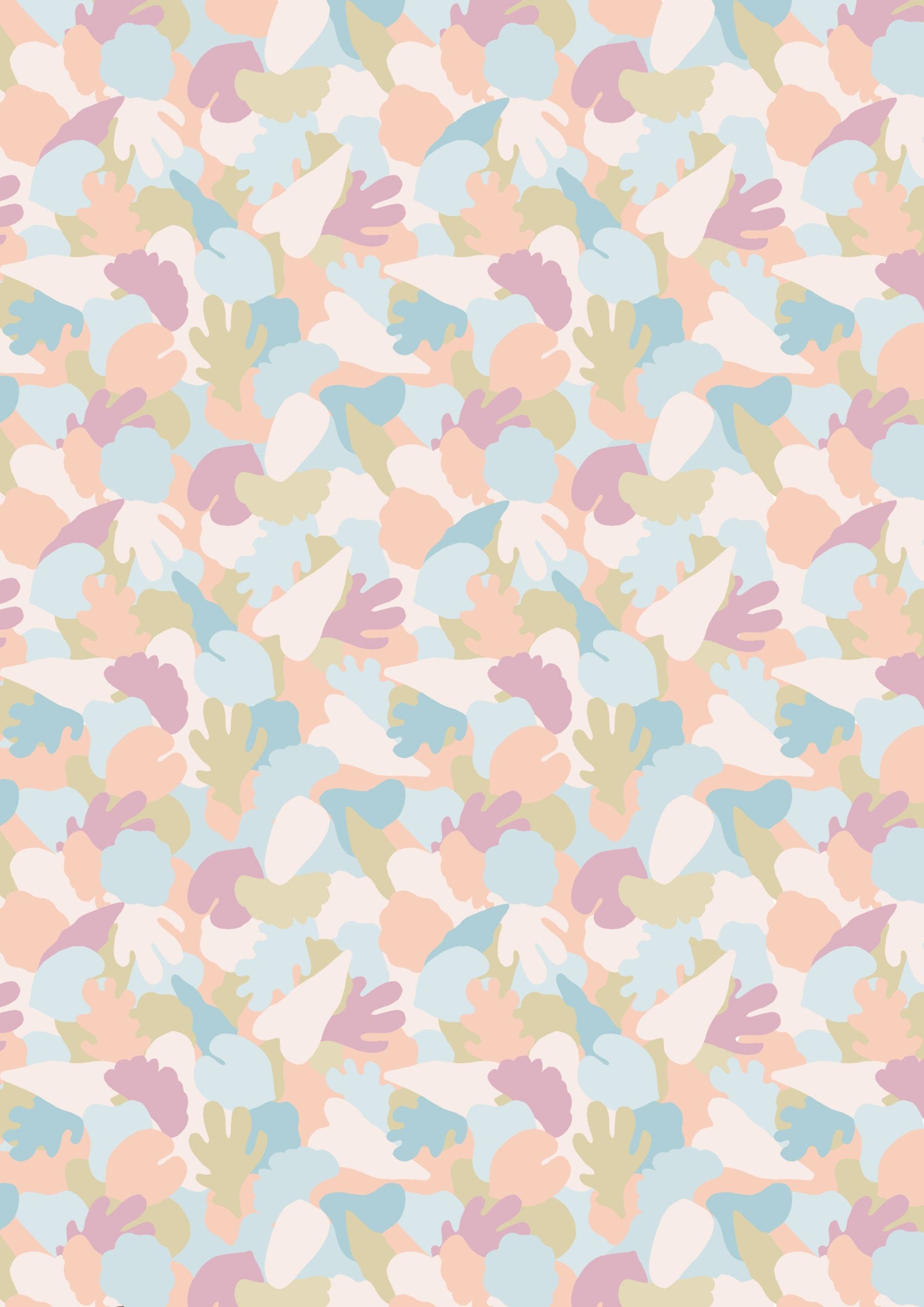 Soft and gentle pattern with overlapping pastel shapes reminiscent of coral and foliage. A calming composition of light blues, pinks, and greens.