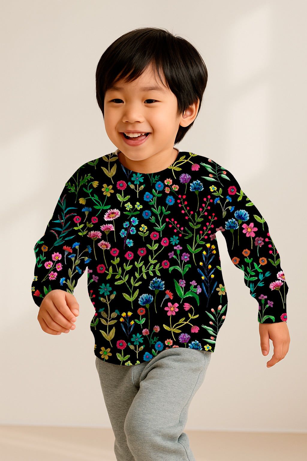 Multicolored embroidered flowers in vibrant hues bloom over a black background in this cheerful floral tapestry.