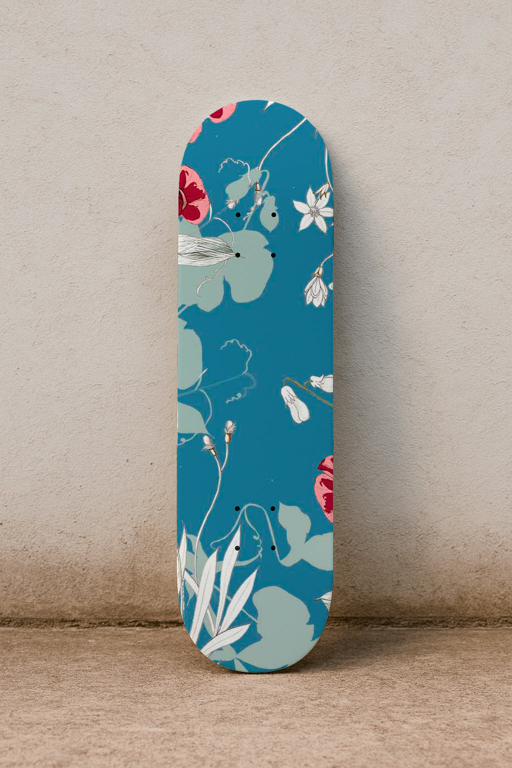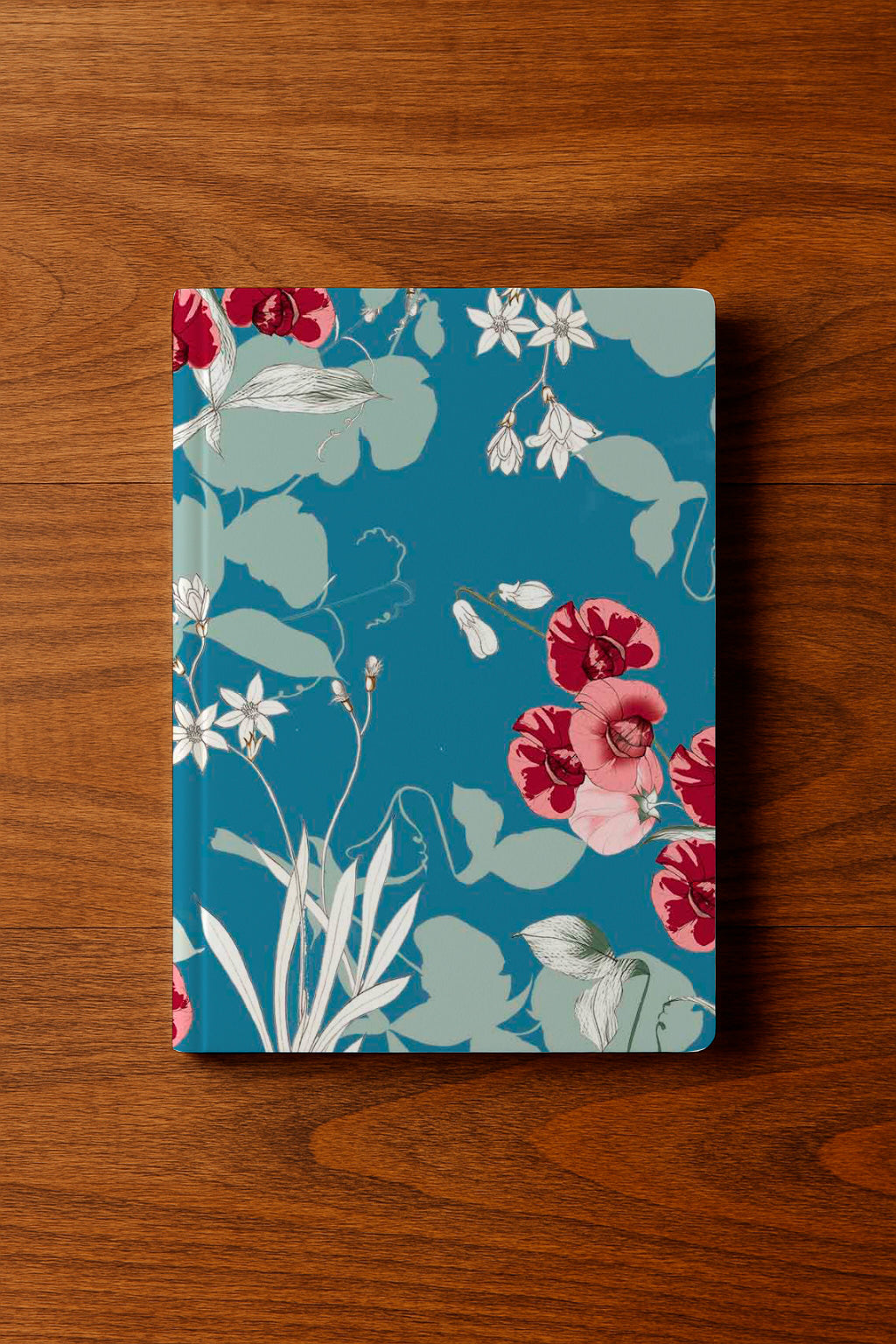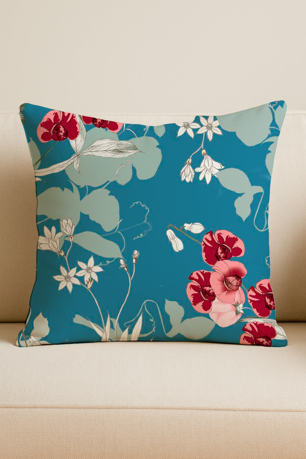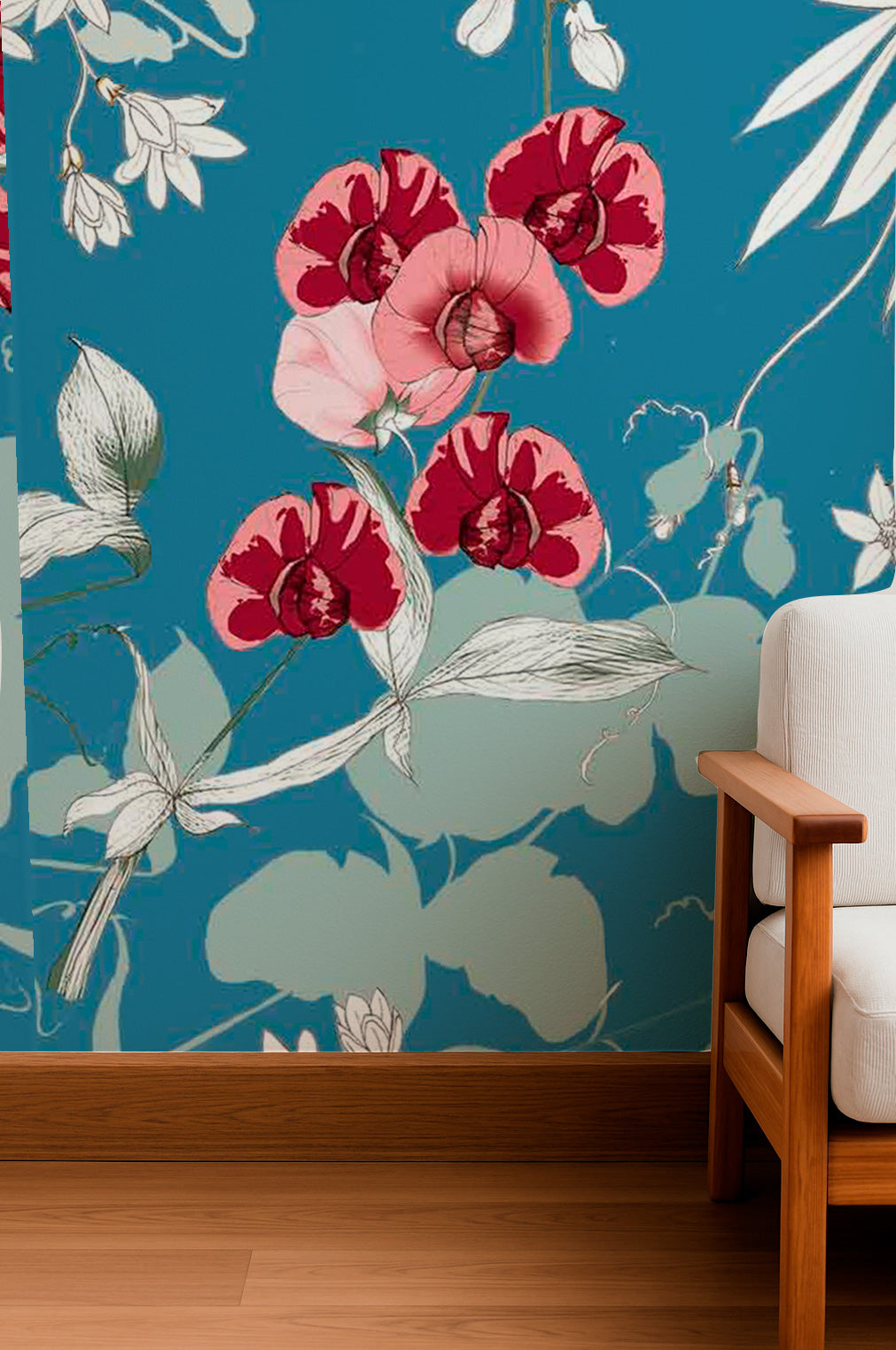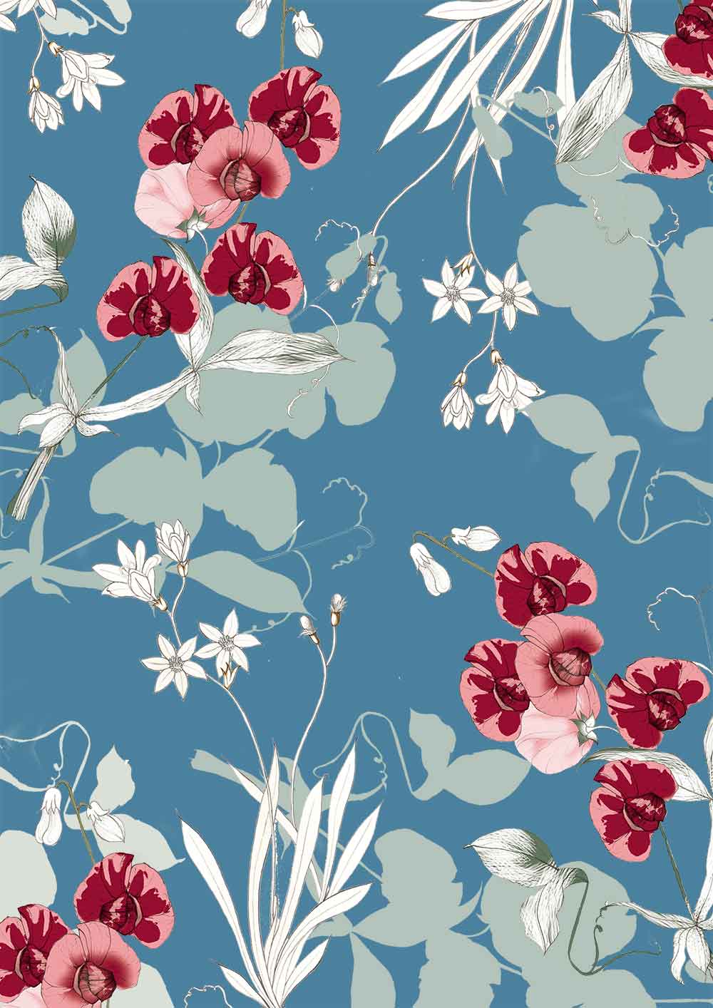 Bold red orchids and soft white flowers trail across a denim-blue background with minimalist vines and blossoms.