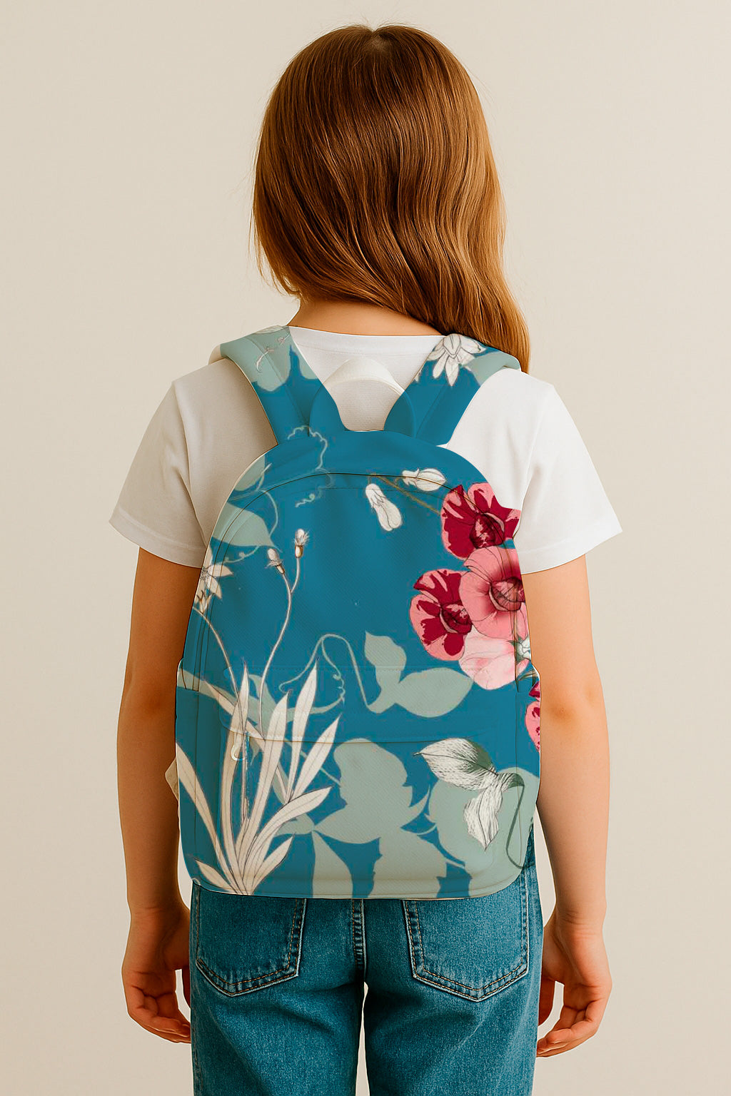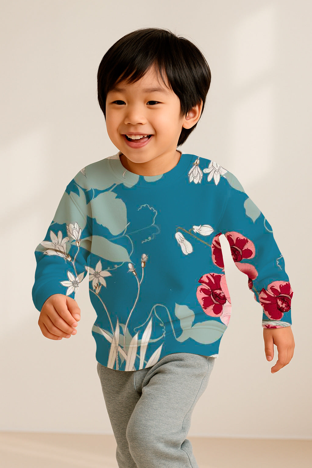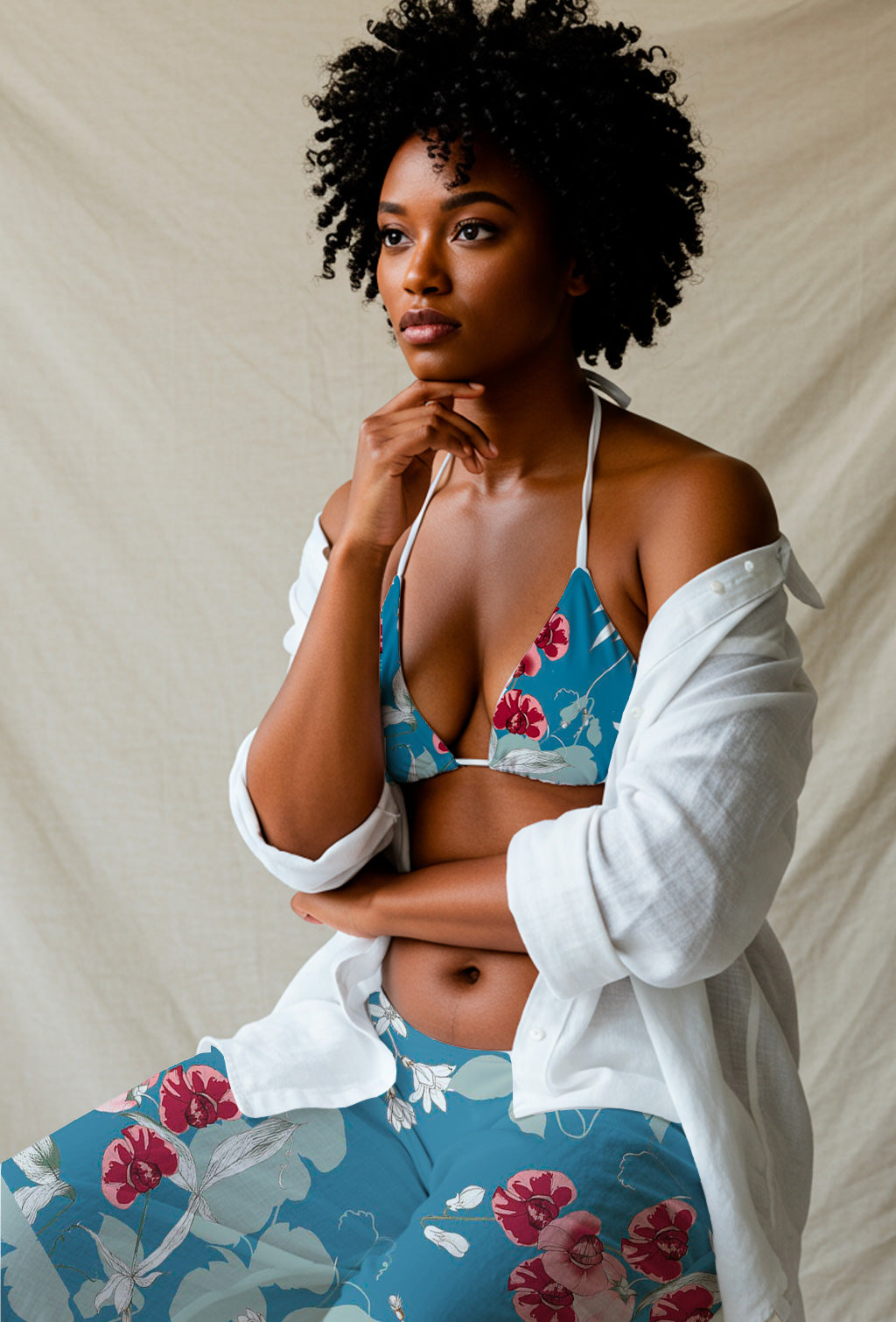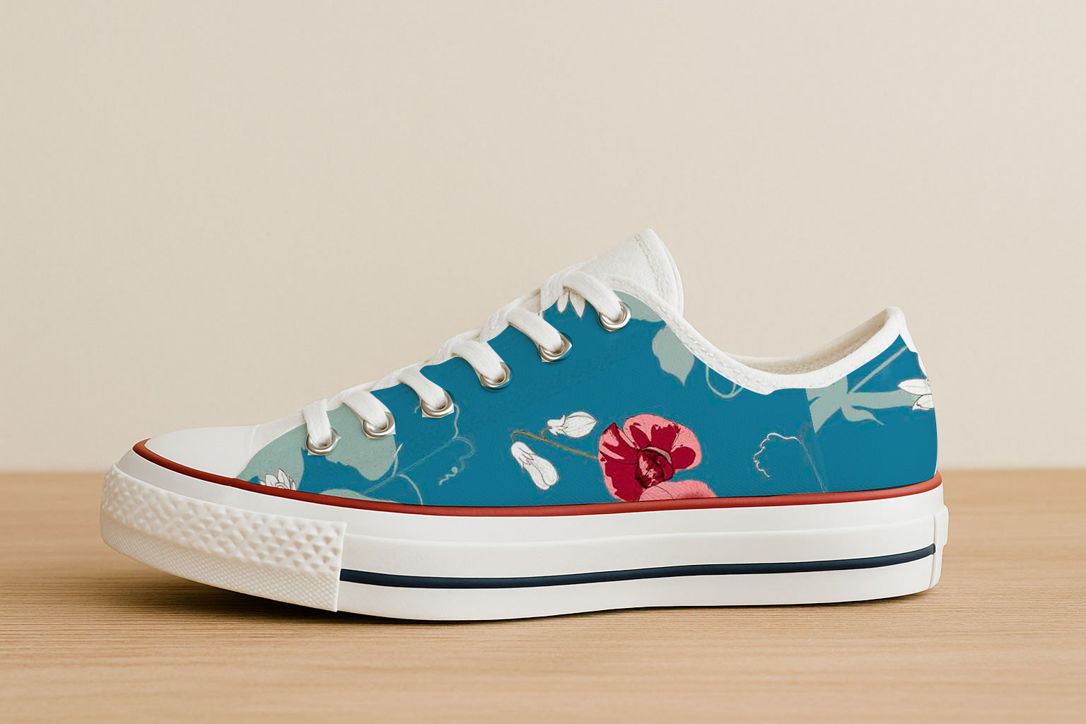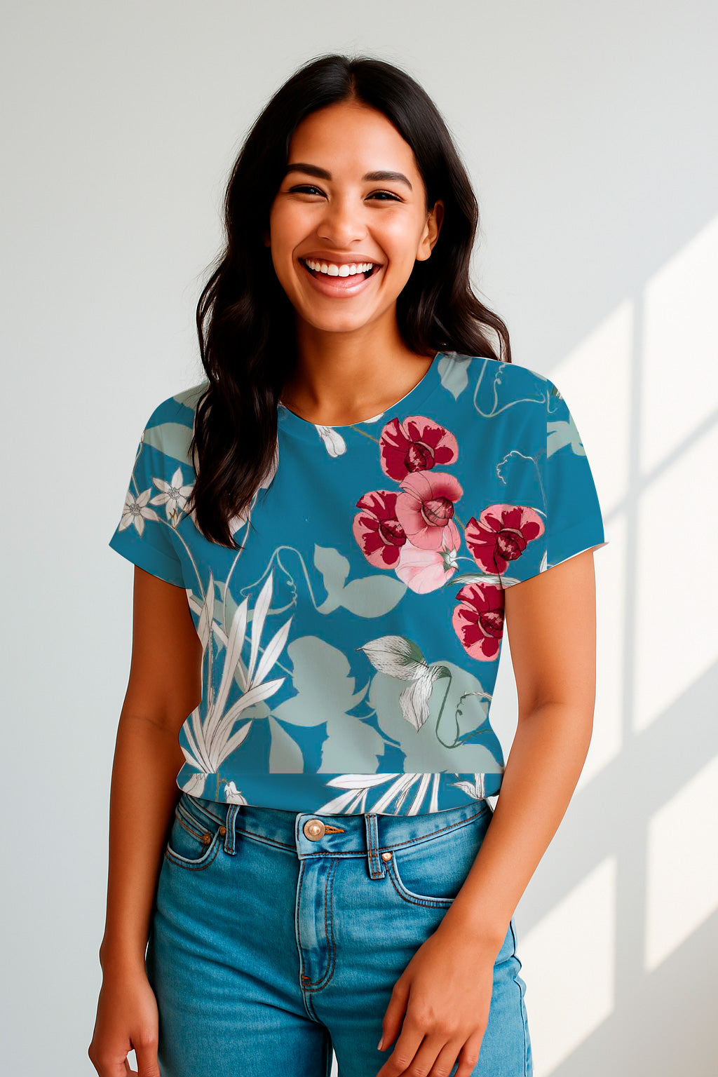 Bold red orchids and soft white flowers trail across a denim-blue background with minimalist vines and blossoms.