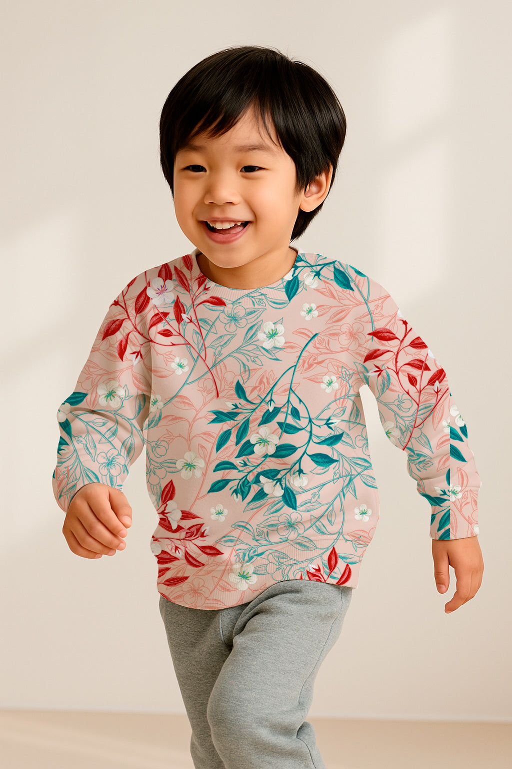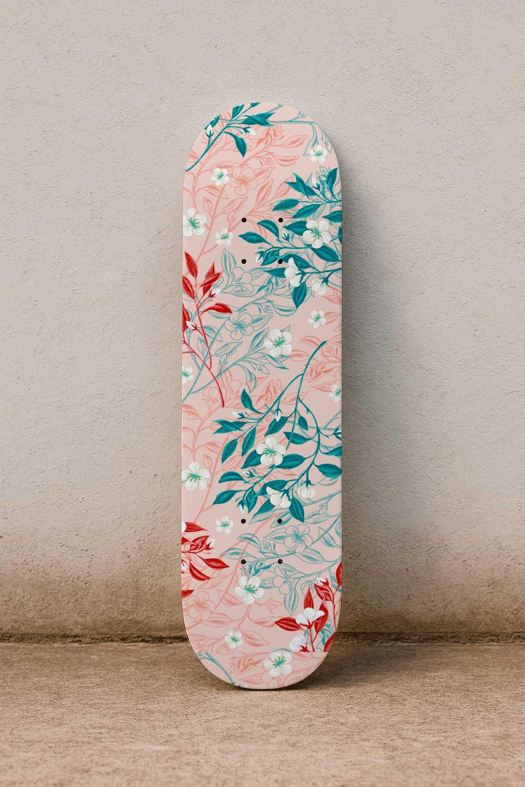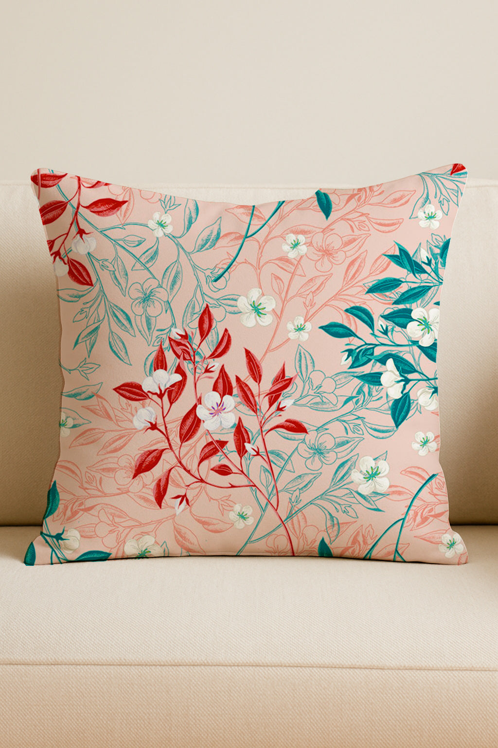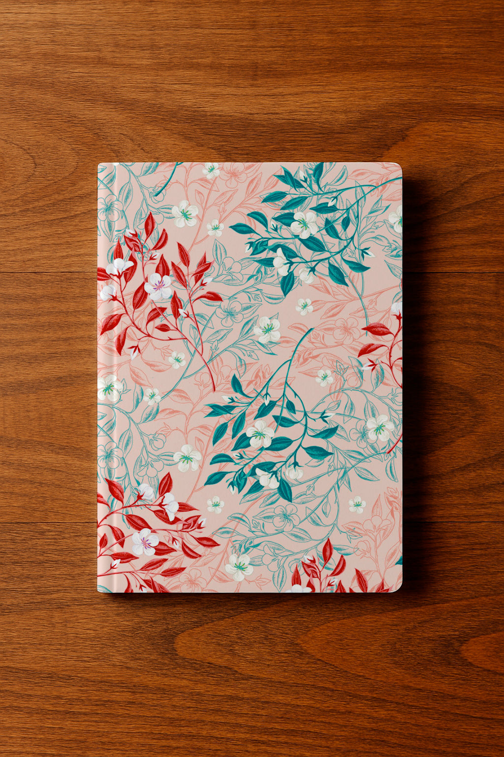 Branches and flowers in turquoise and crimson intertwined over a dusty pink base, forming a romantic and flowing design.