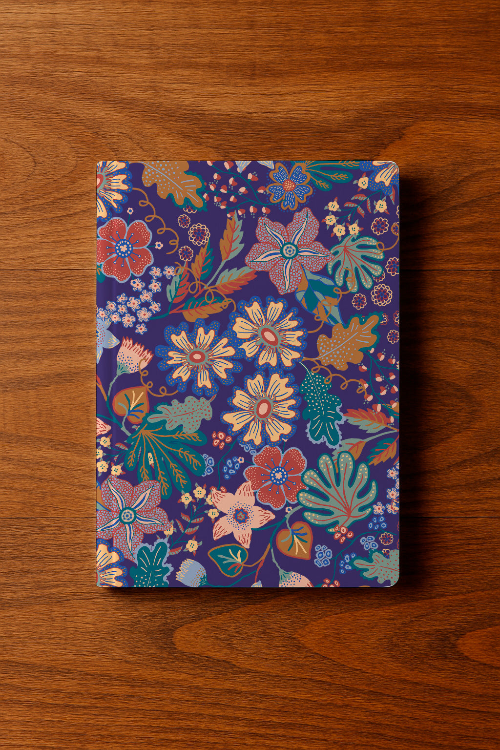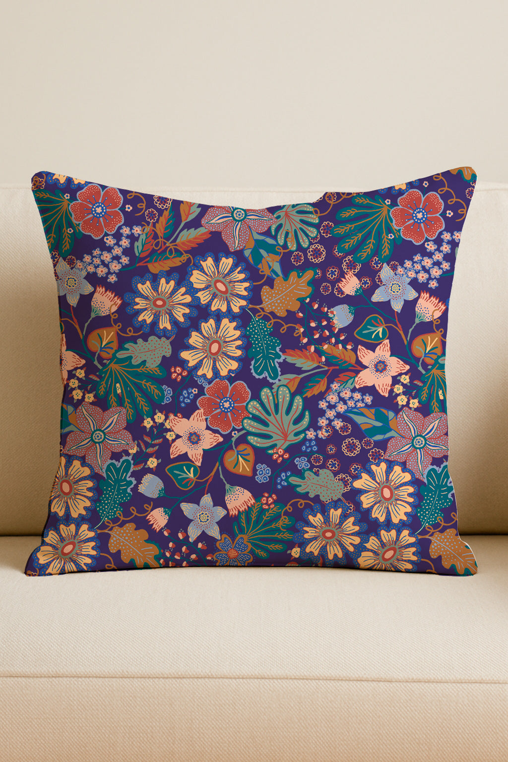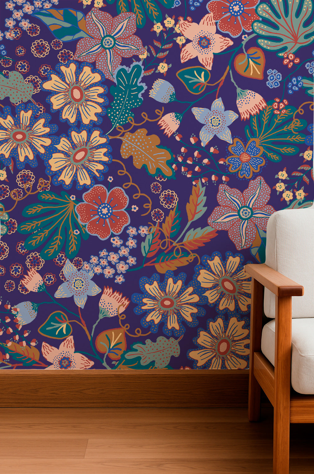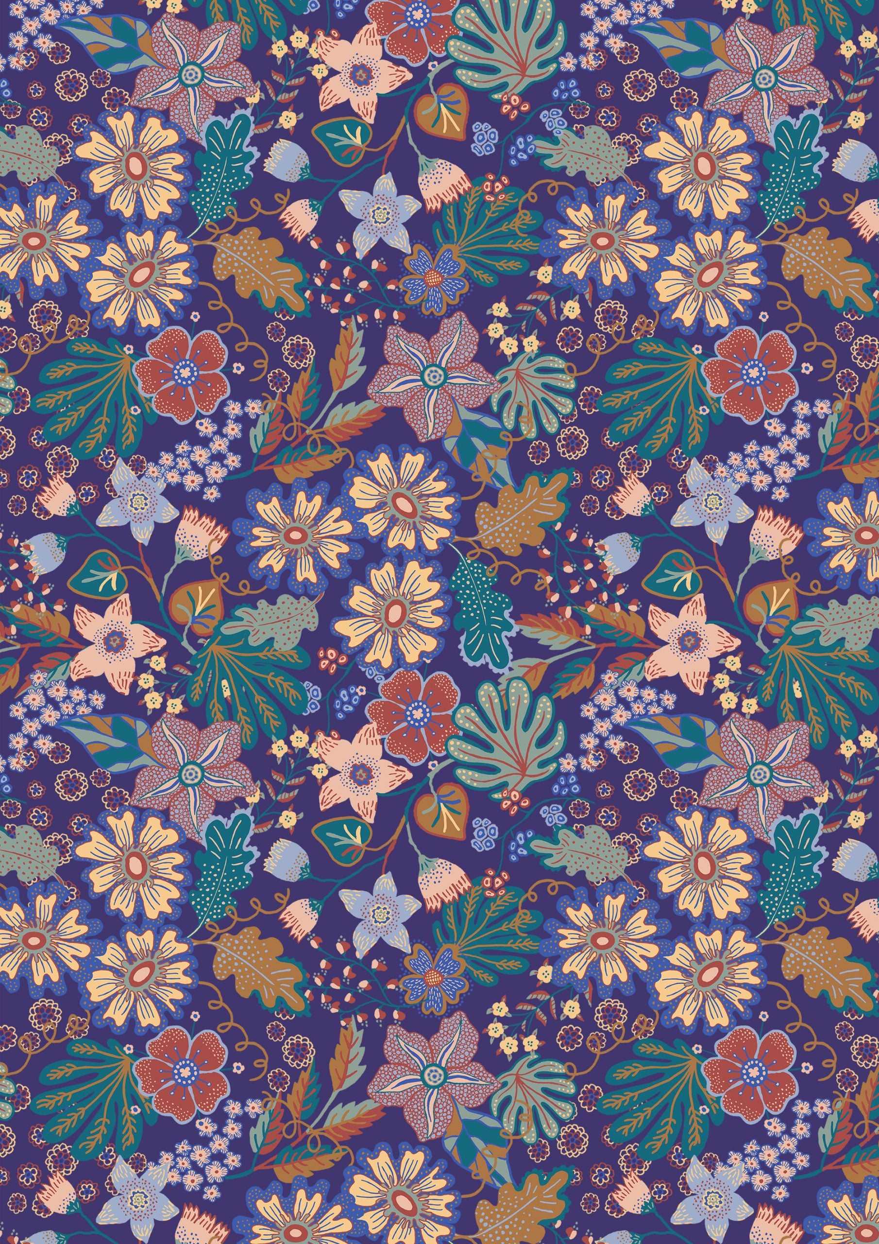 A vibrant floral pattern featuring large folk-art-style flowers in warm colors over a deep blue base. Rich and decorative.