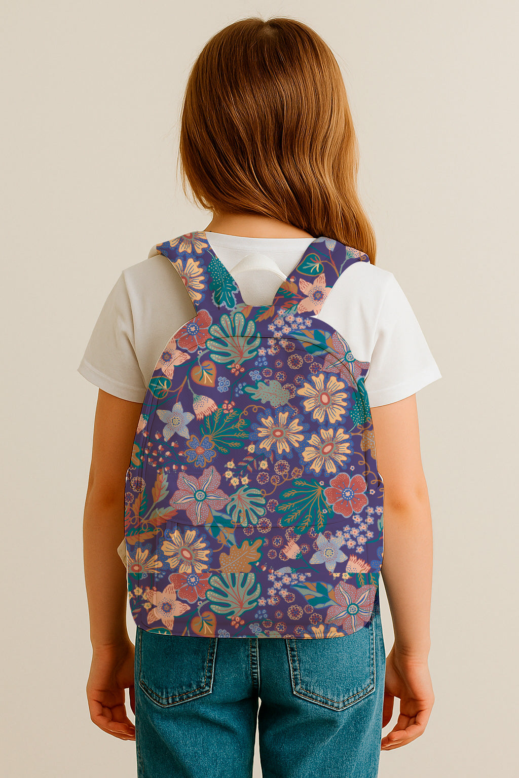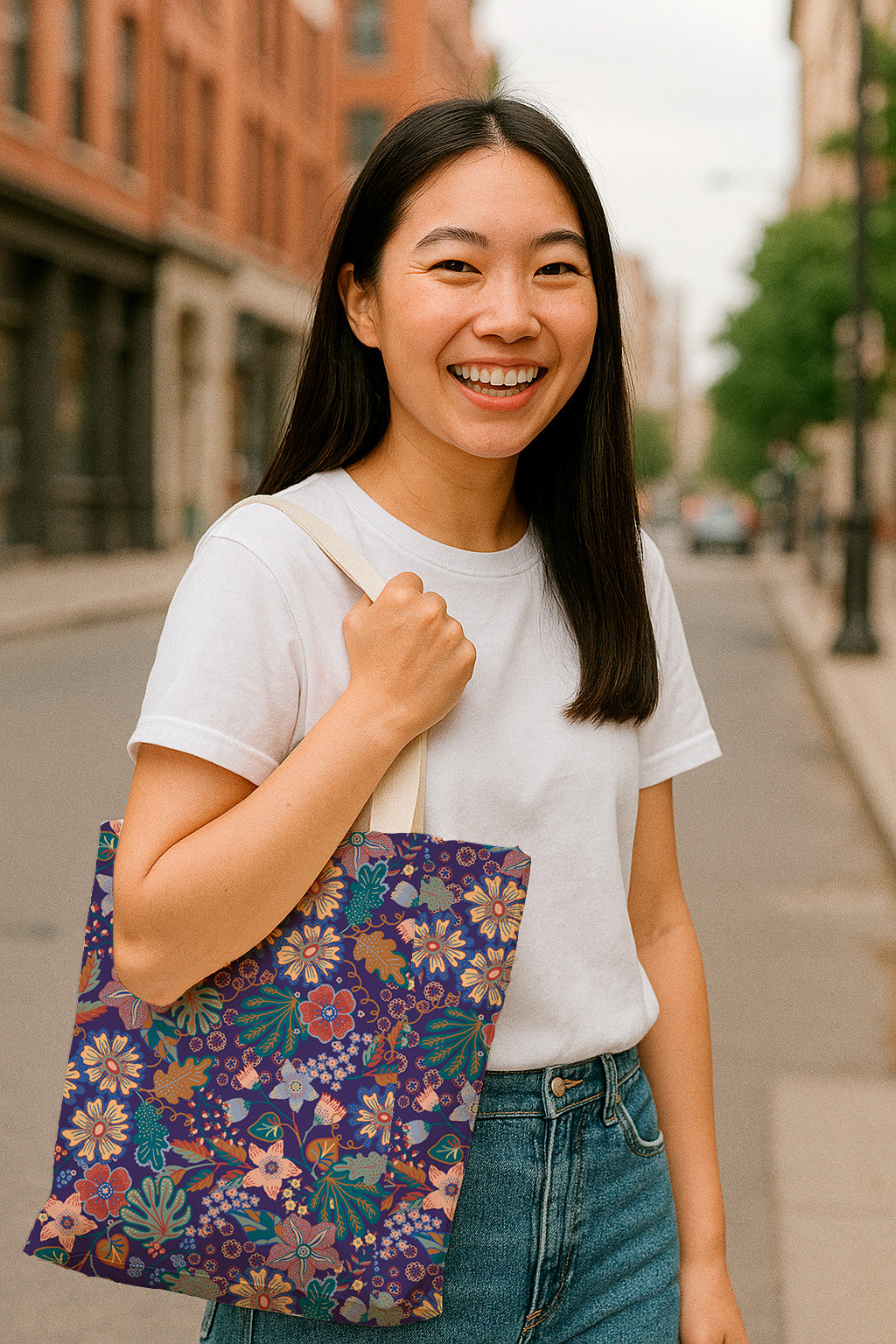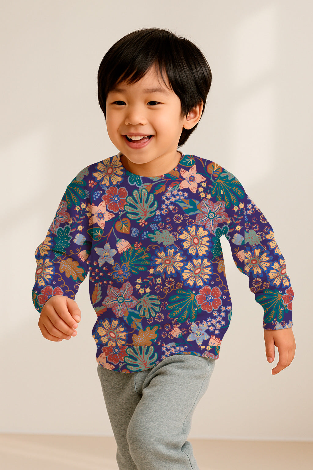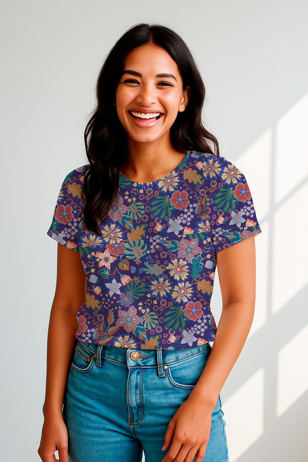 A vibrant floral pattern featuring large folk-art-style flowers in warm colors over a deep blue base. Rich and decorative.