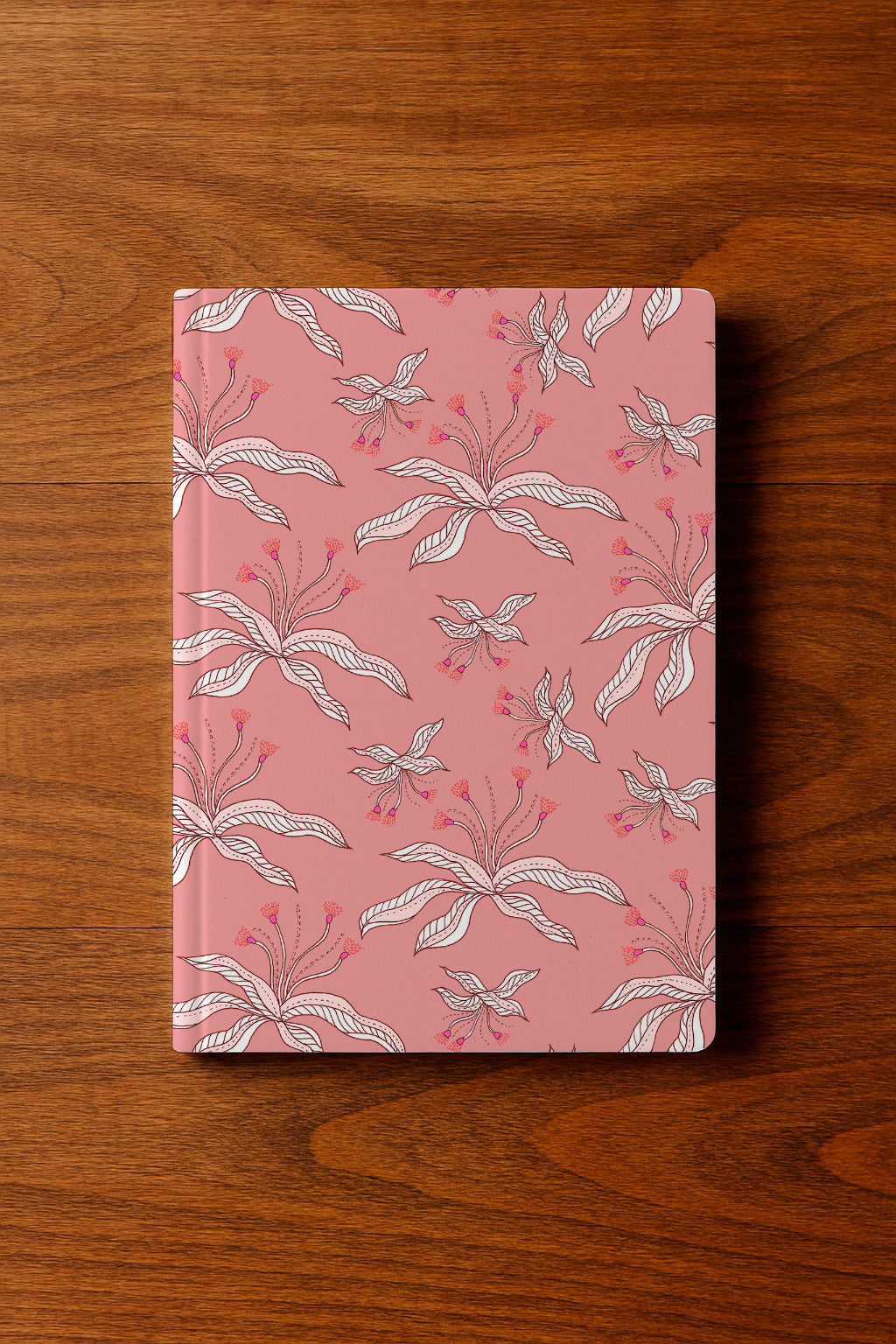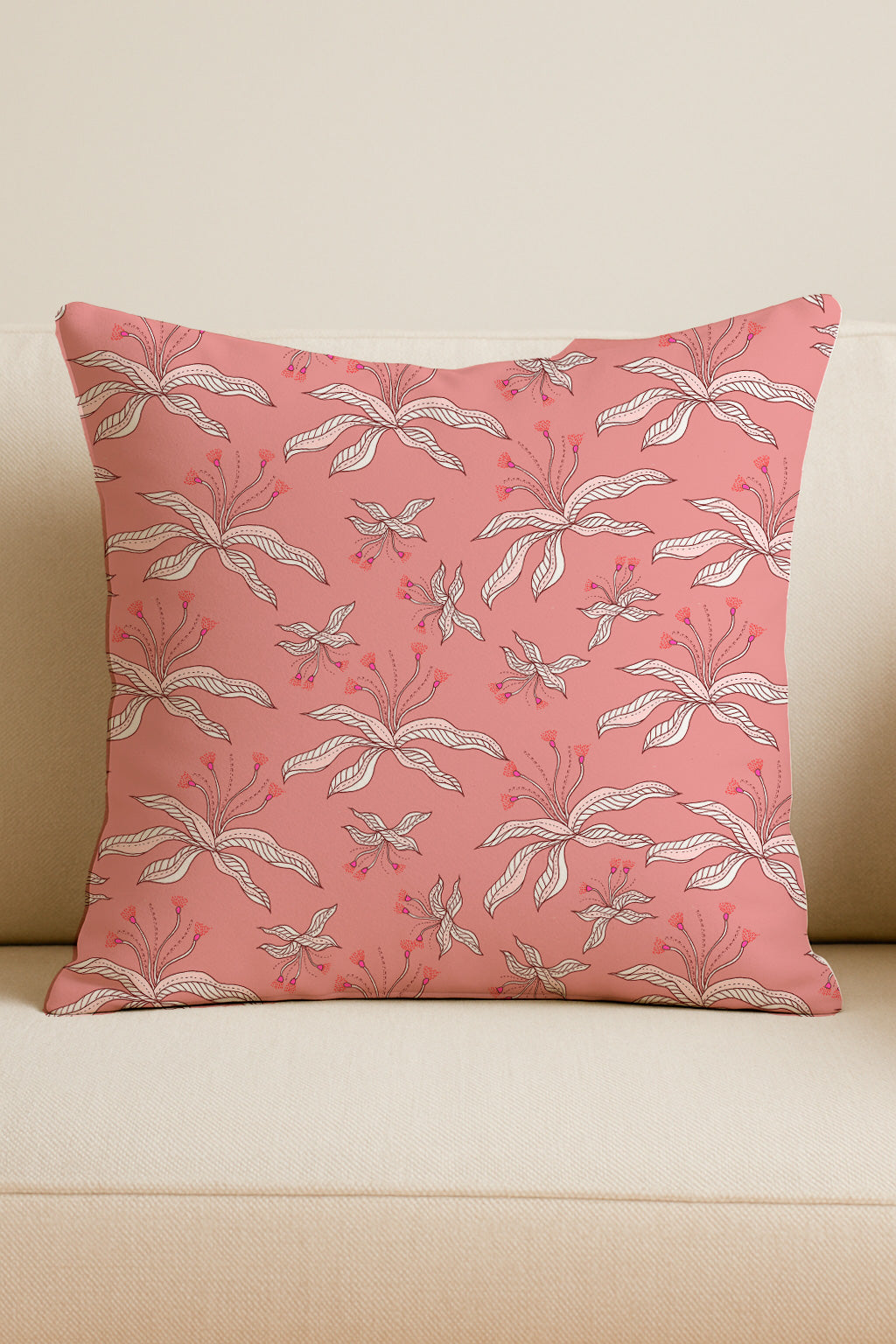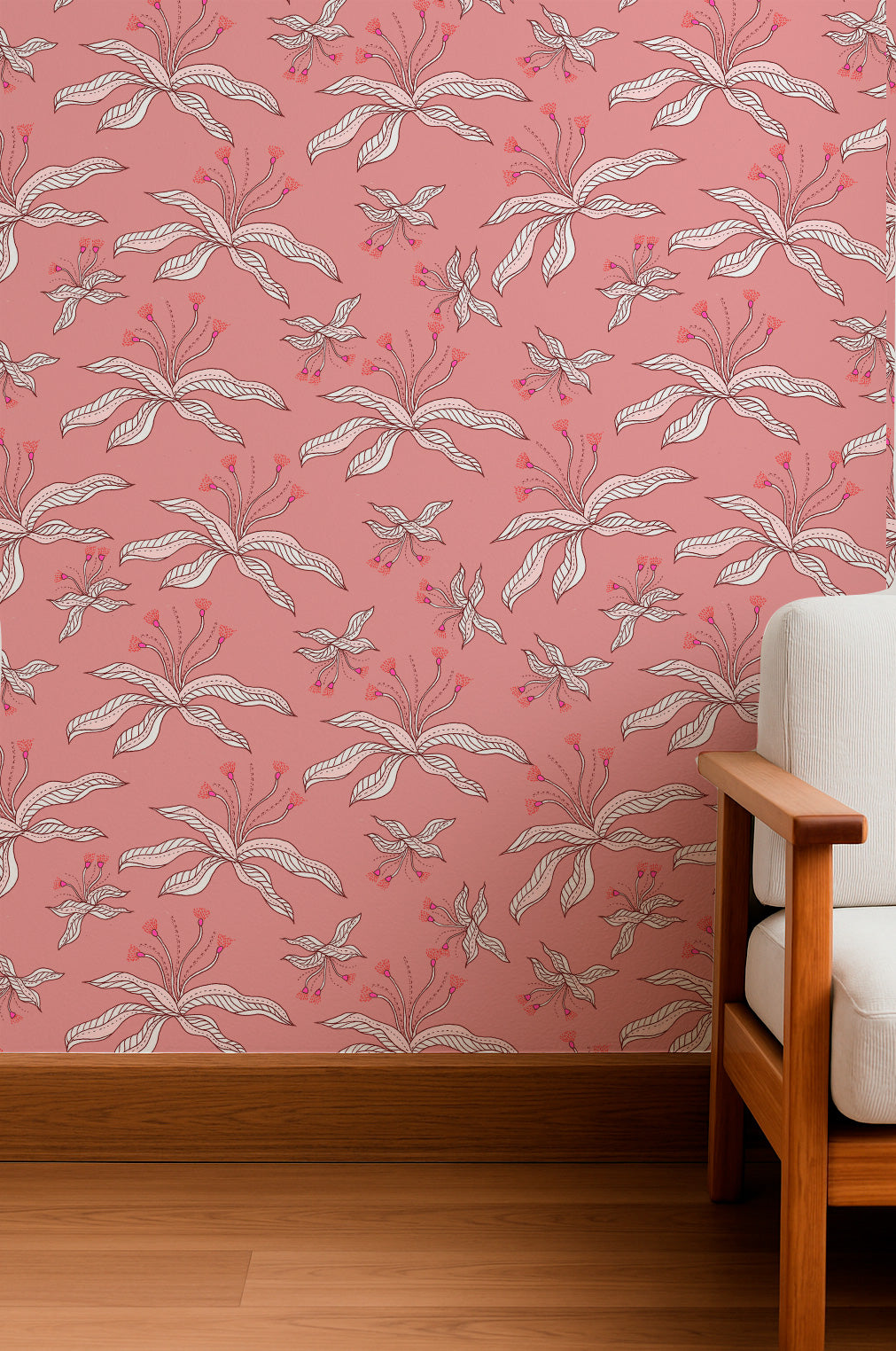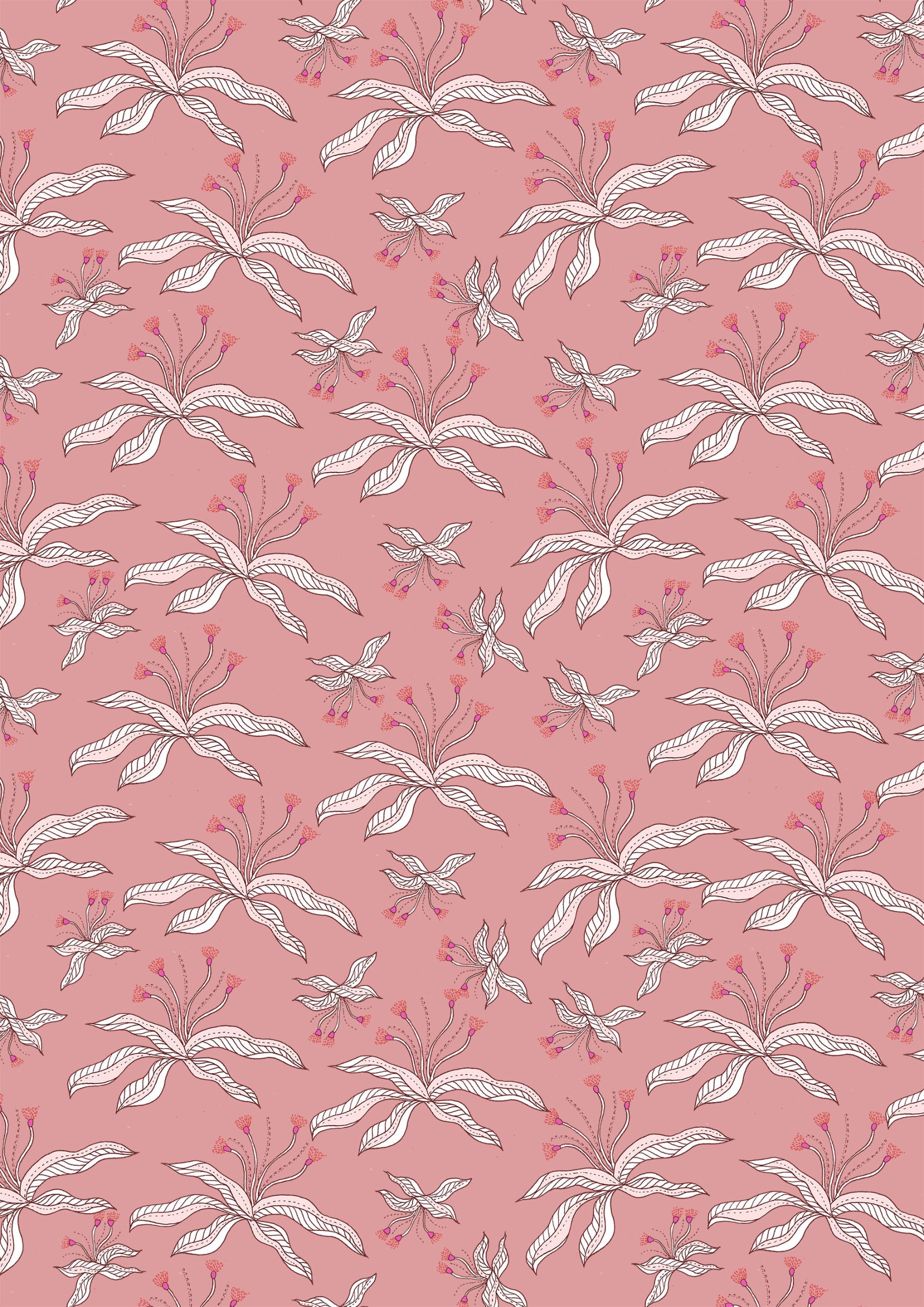 Soft pink background adorned with white and pink abstract flowers and slender leaves.