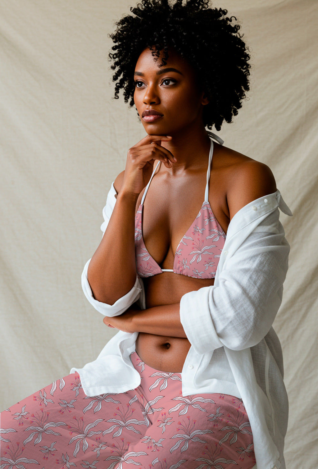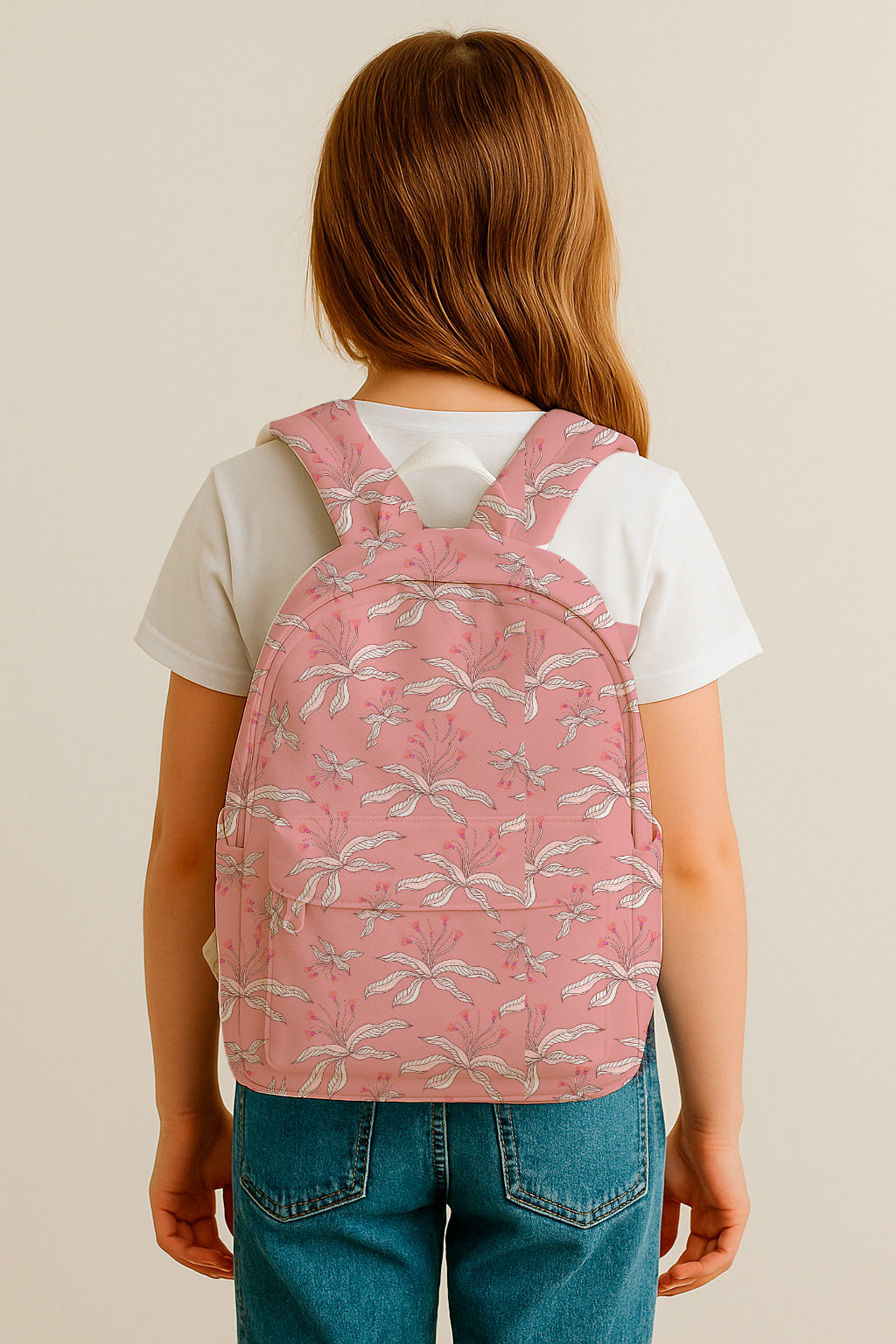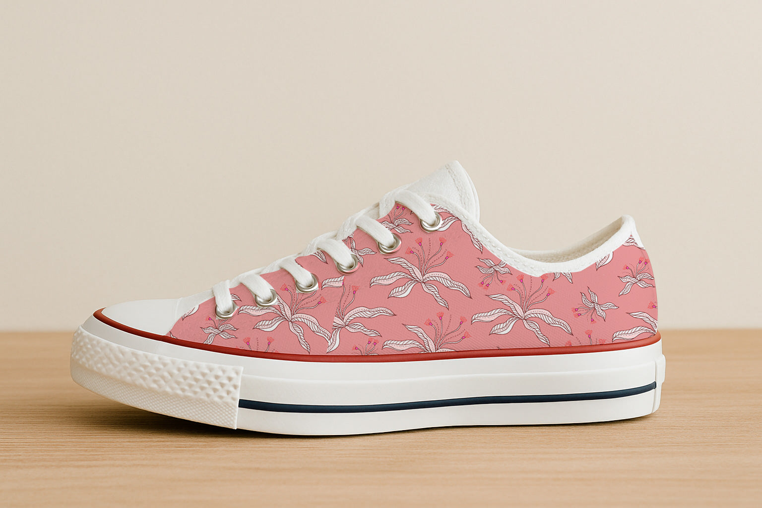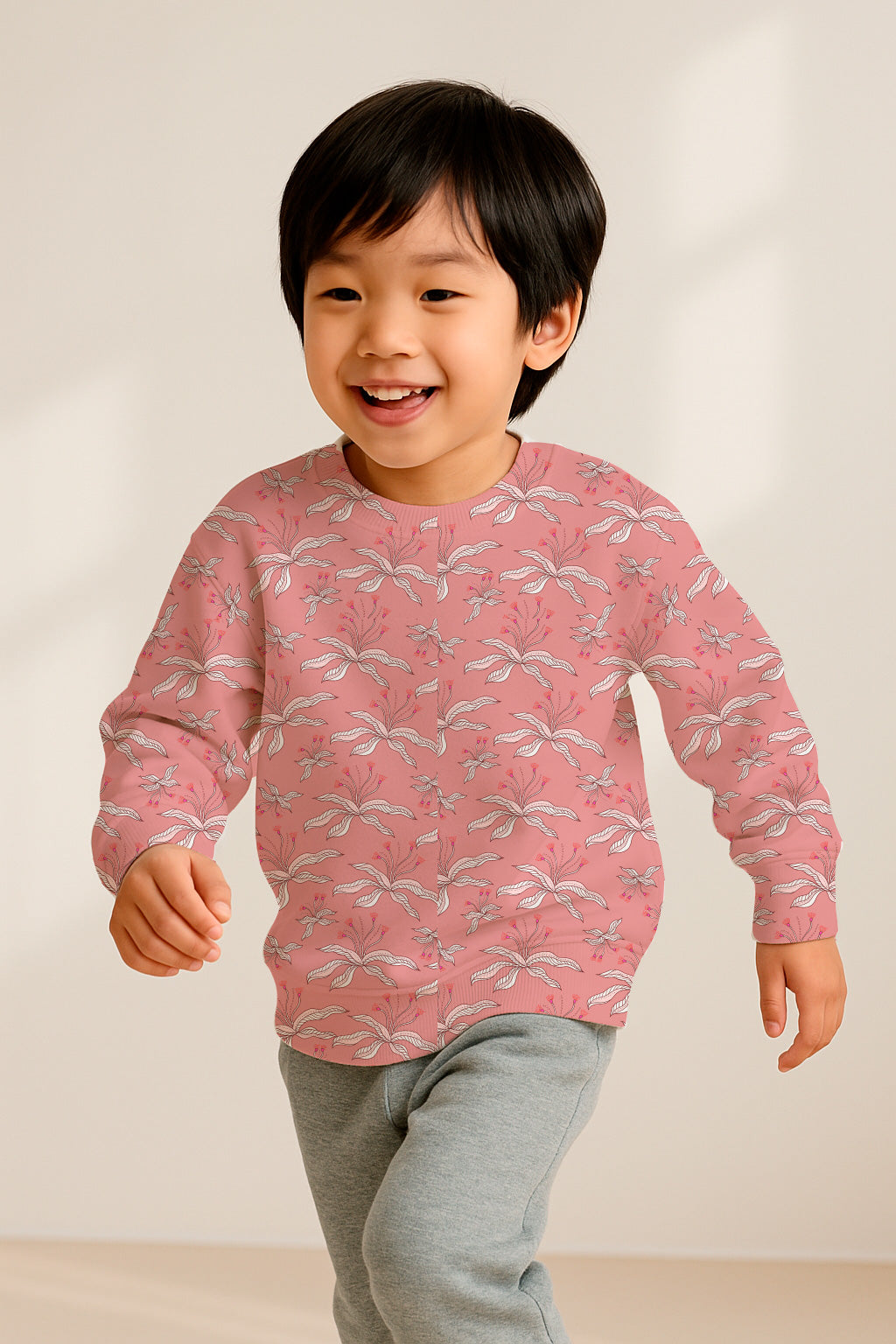 Soft pink background adorned with white and pink abstract flowers and slender leaves.