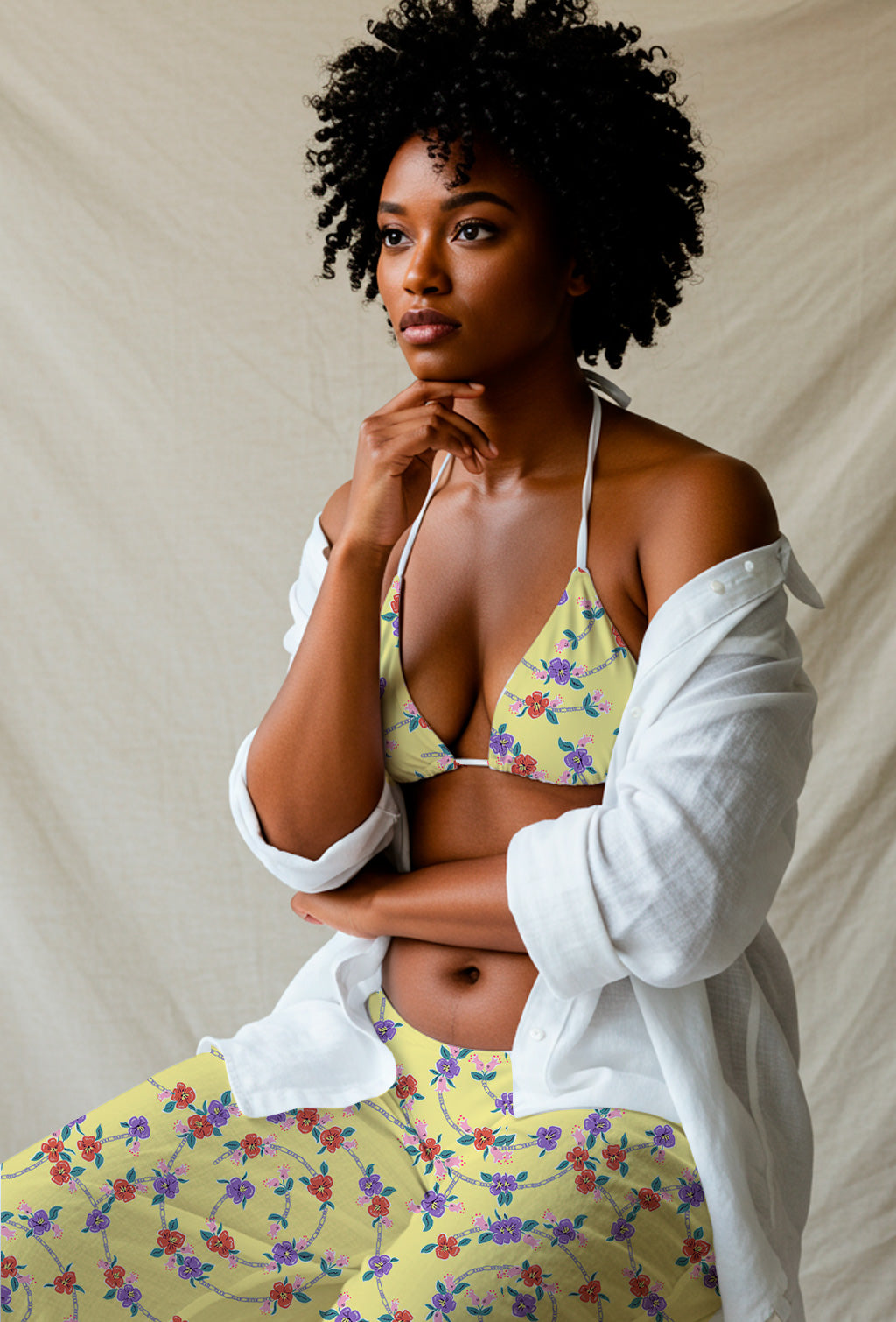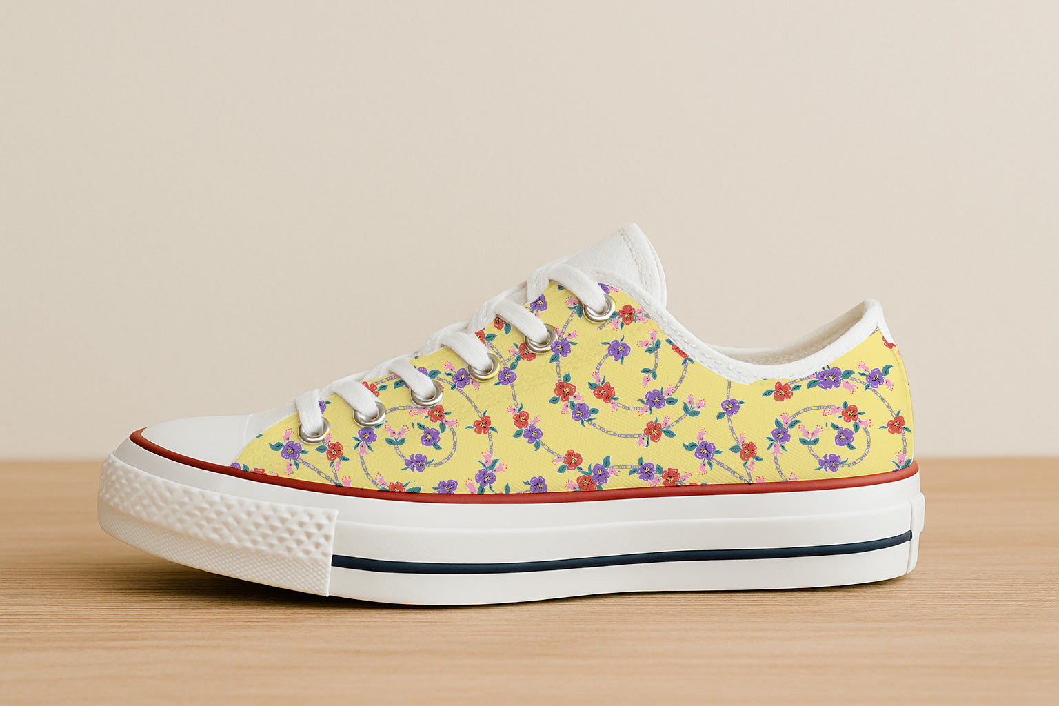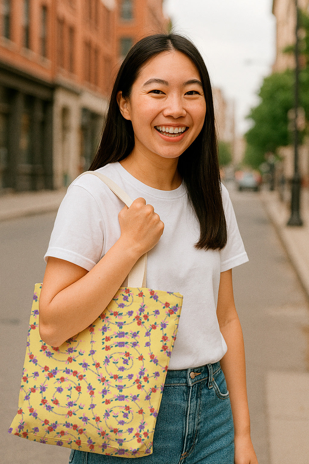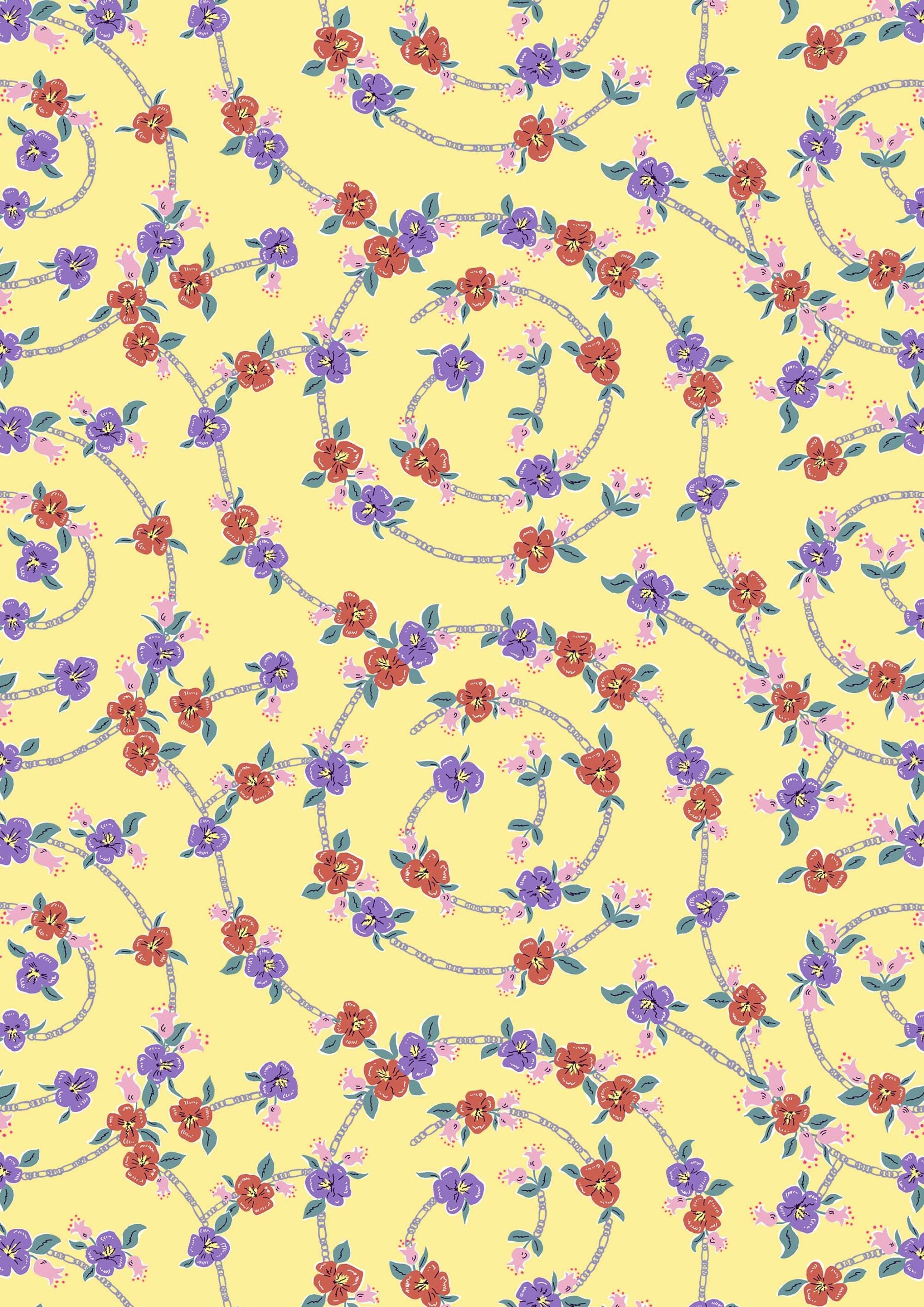 Delicate floral spirals with red and purple flowers twirl across a pale yellow background, forming a charming and whimsical pattern.