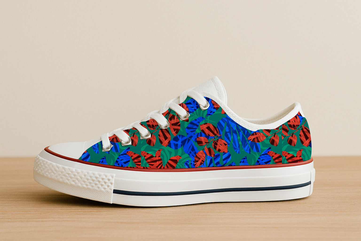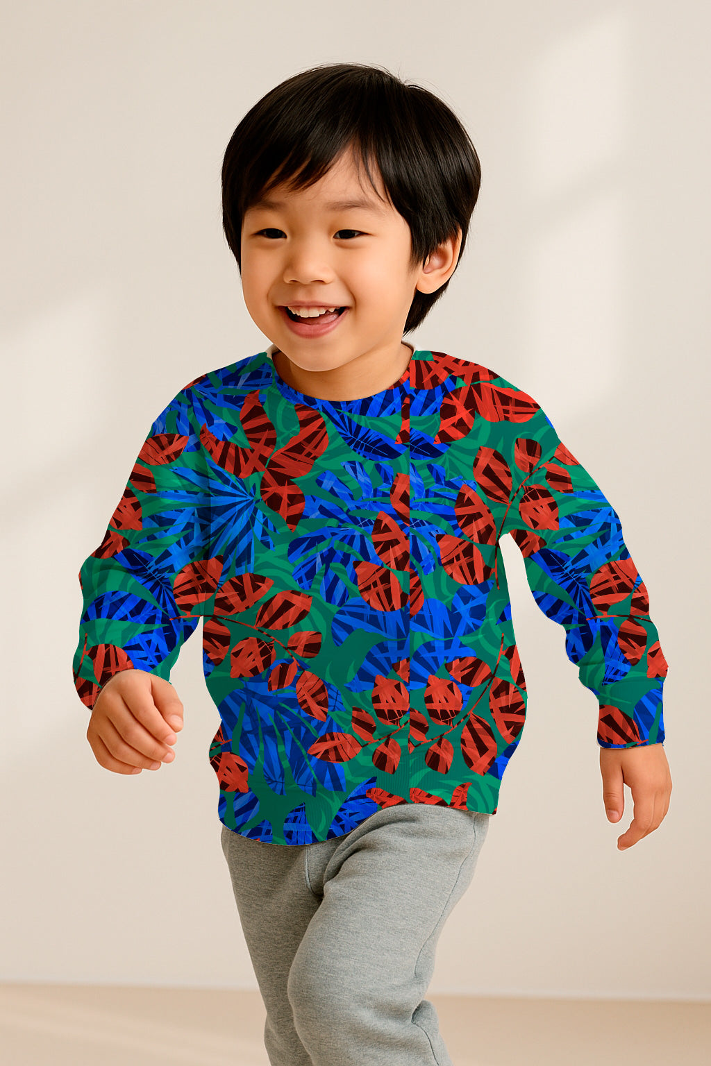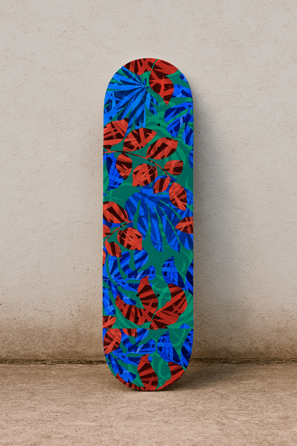 A contemporary layered collage of abstract red and blue leaves on a green base, evoking a tropical and graphic composition.