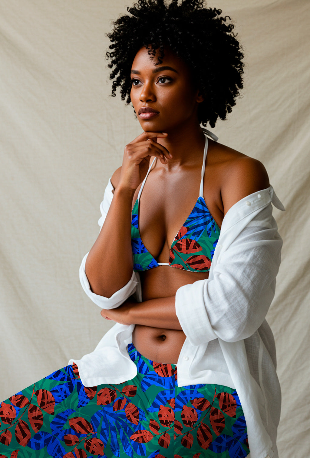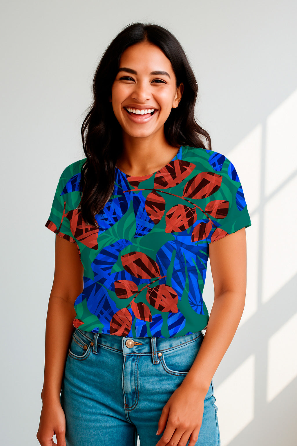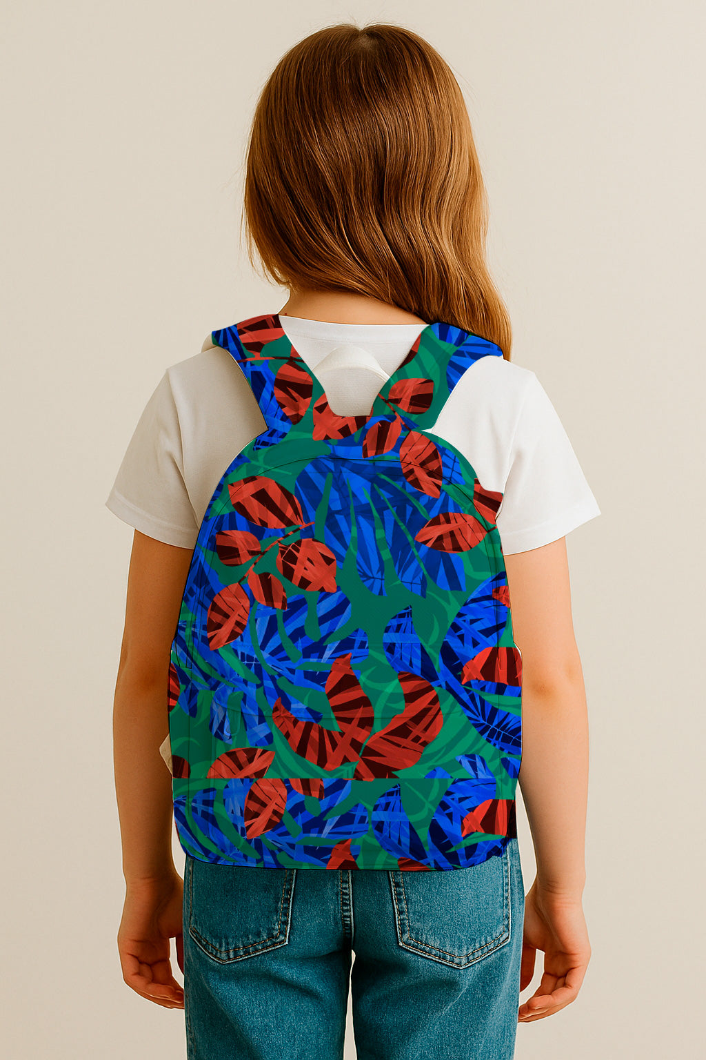 A contemporary layered collage of abstract red and blue leaves on a green base, evoking a tropical and graphic composition.