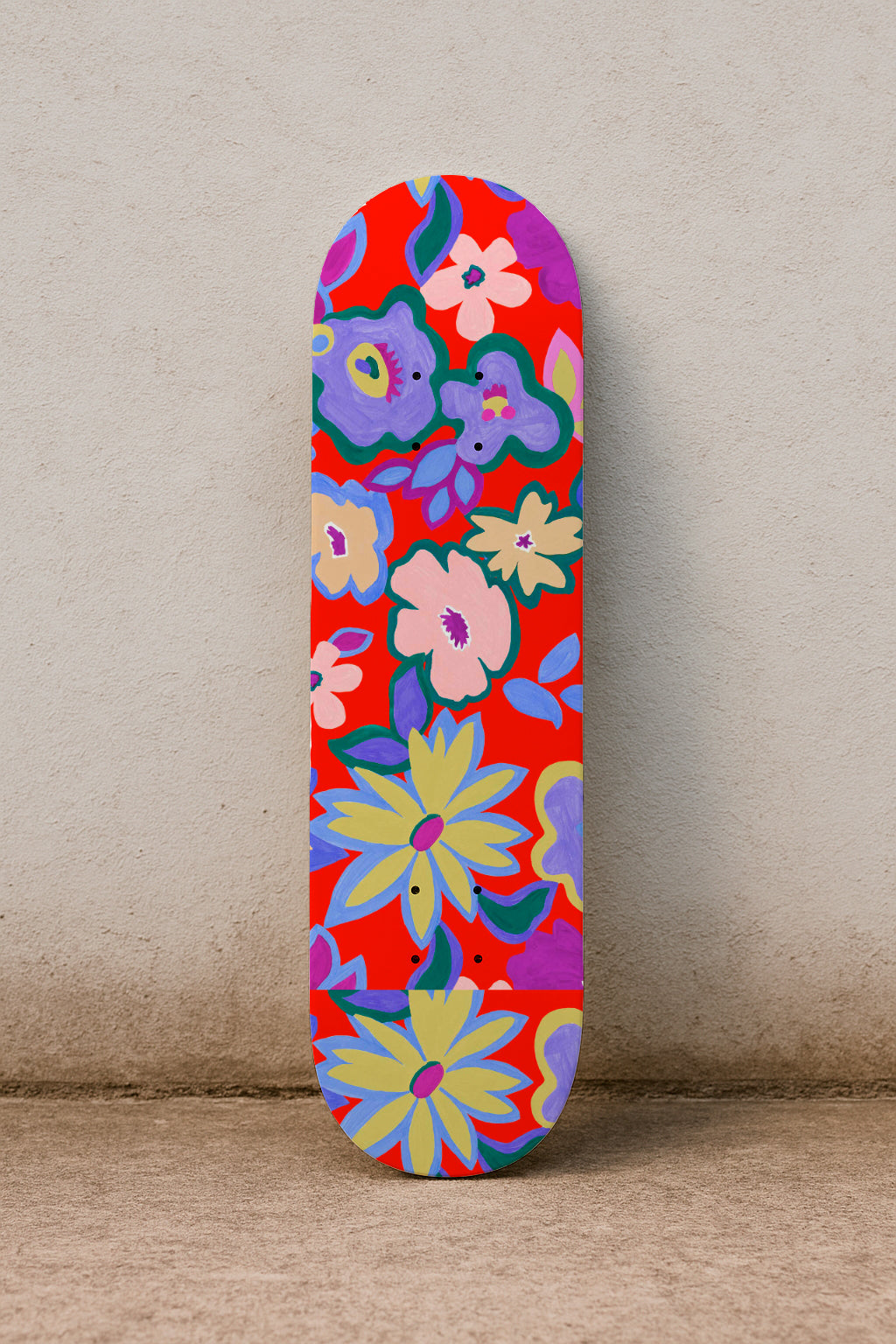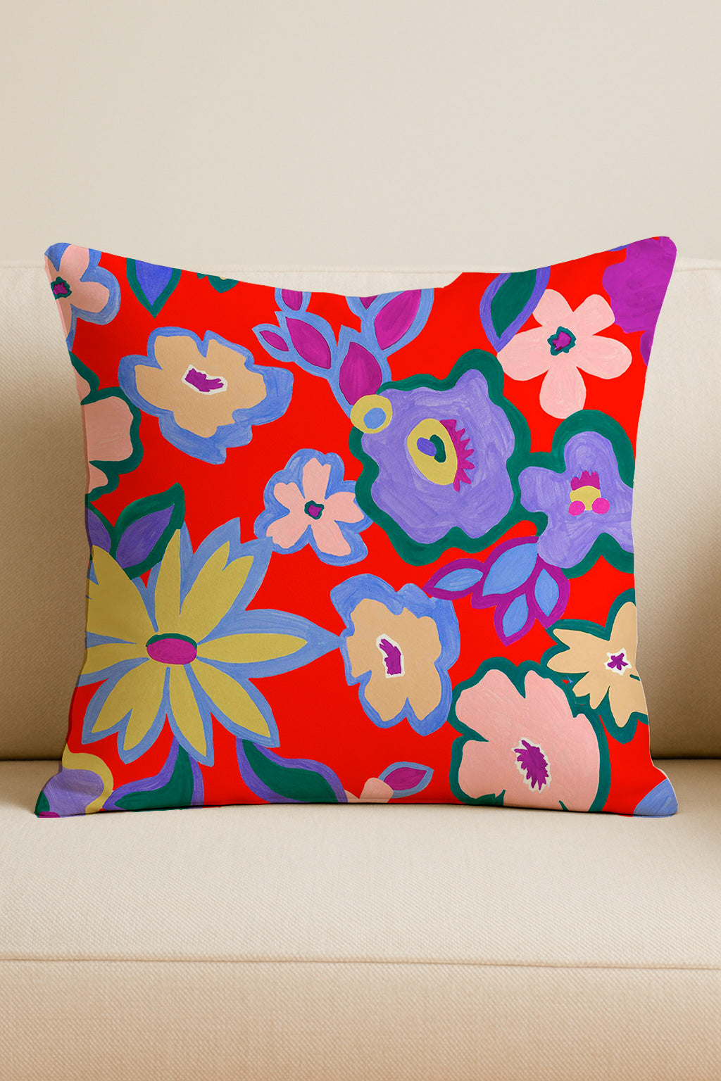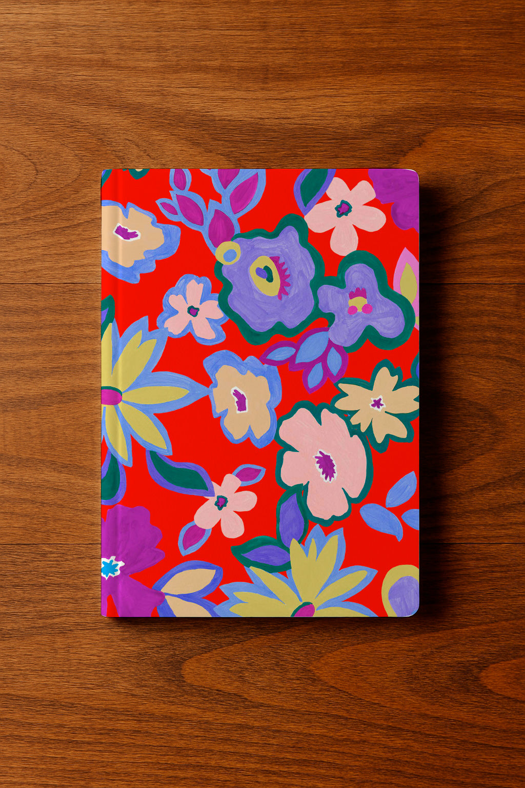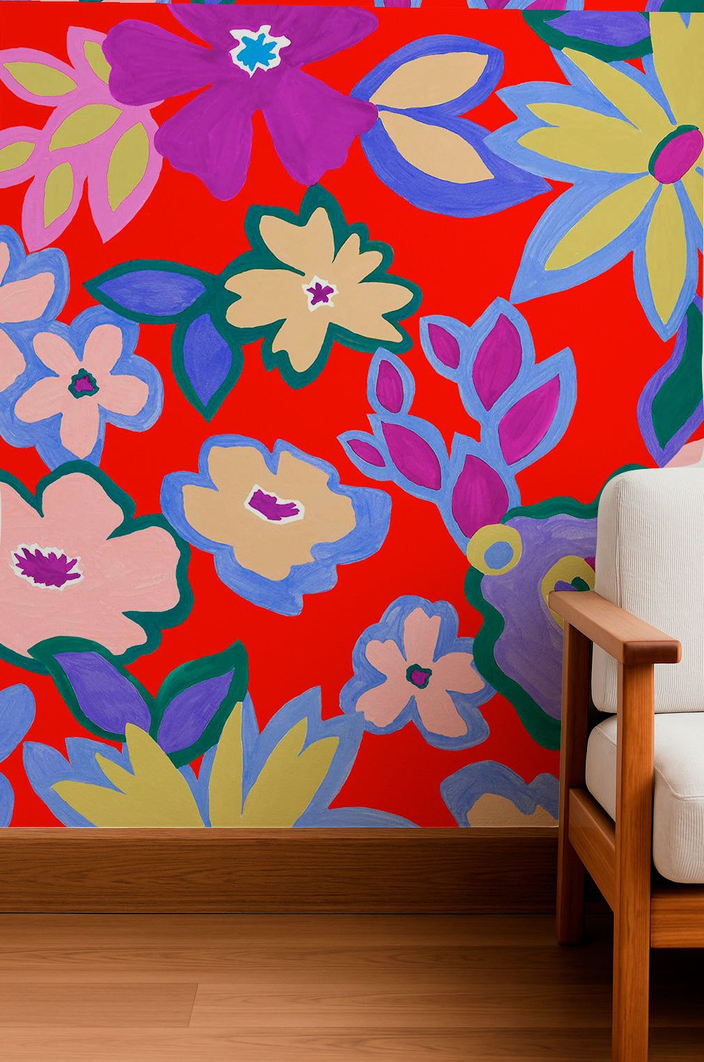 Large, colorful floral shapes painted in flat gouache style bloom over a vibrant red background in a festive and naive design.