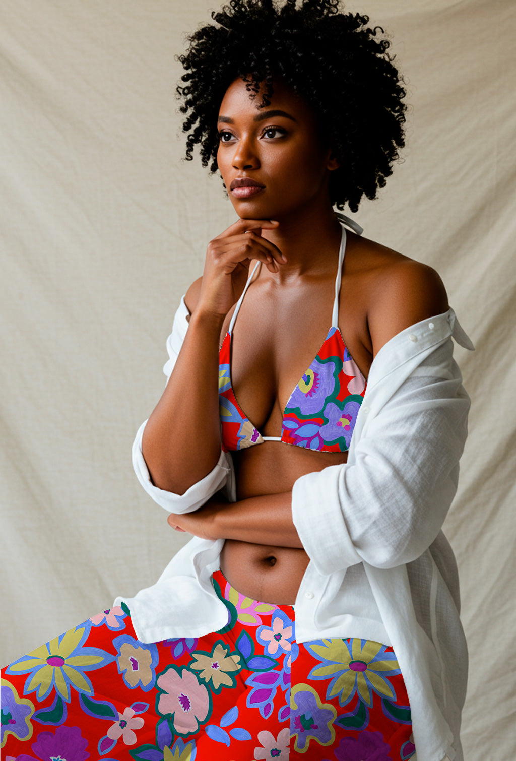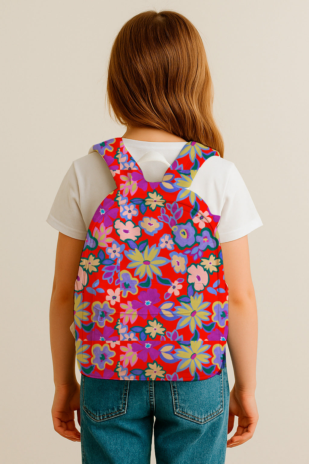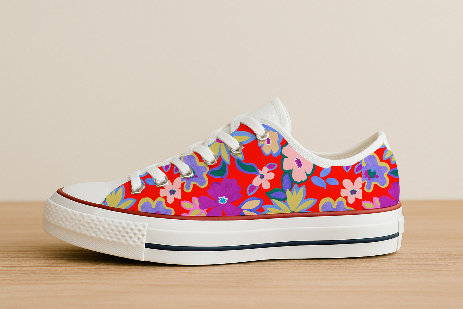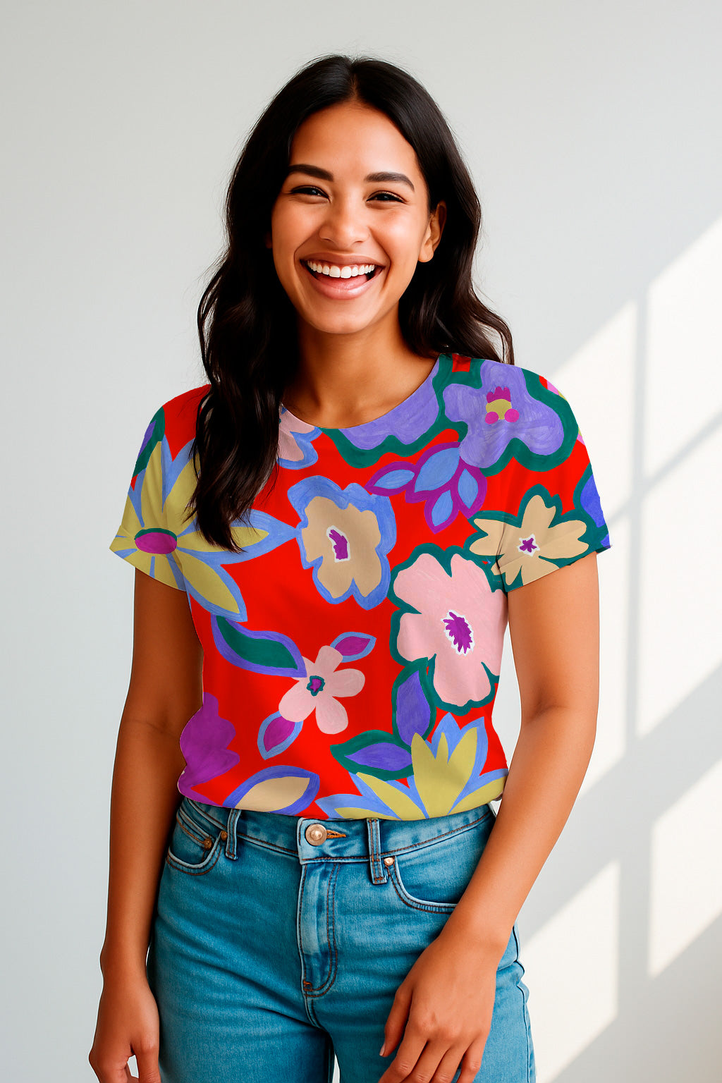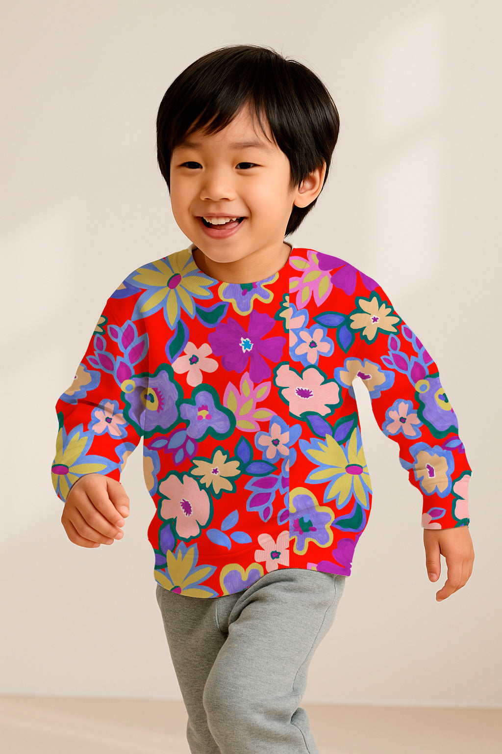 Large, colorful floral shapes painted in flat gouache style bloom over a vibrant red background in a festive and naive design.