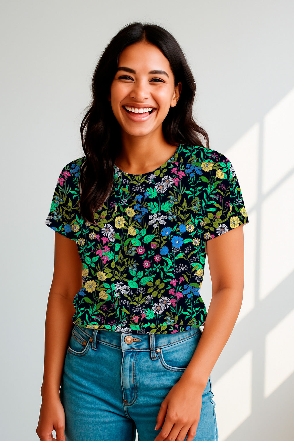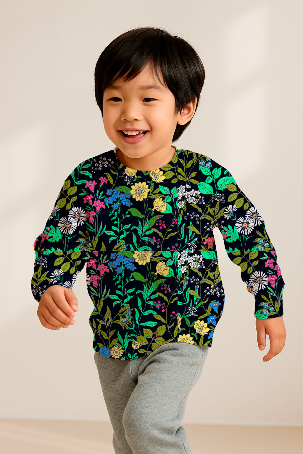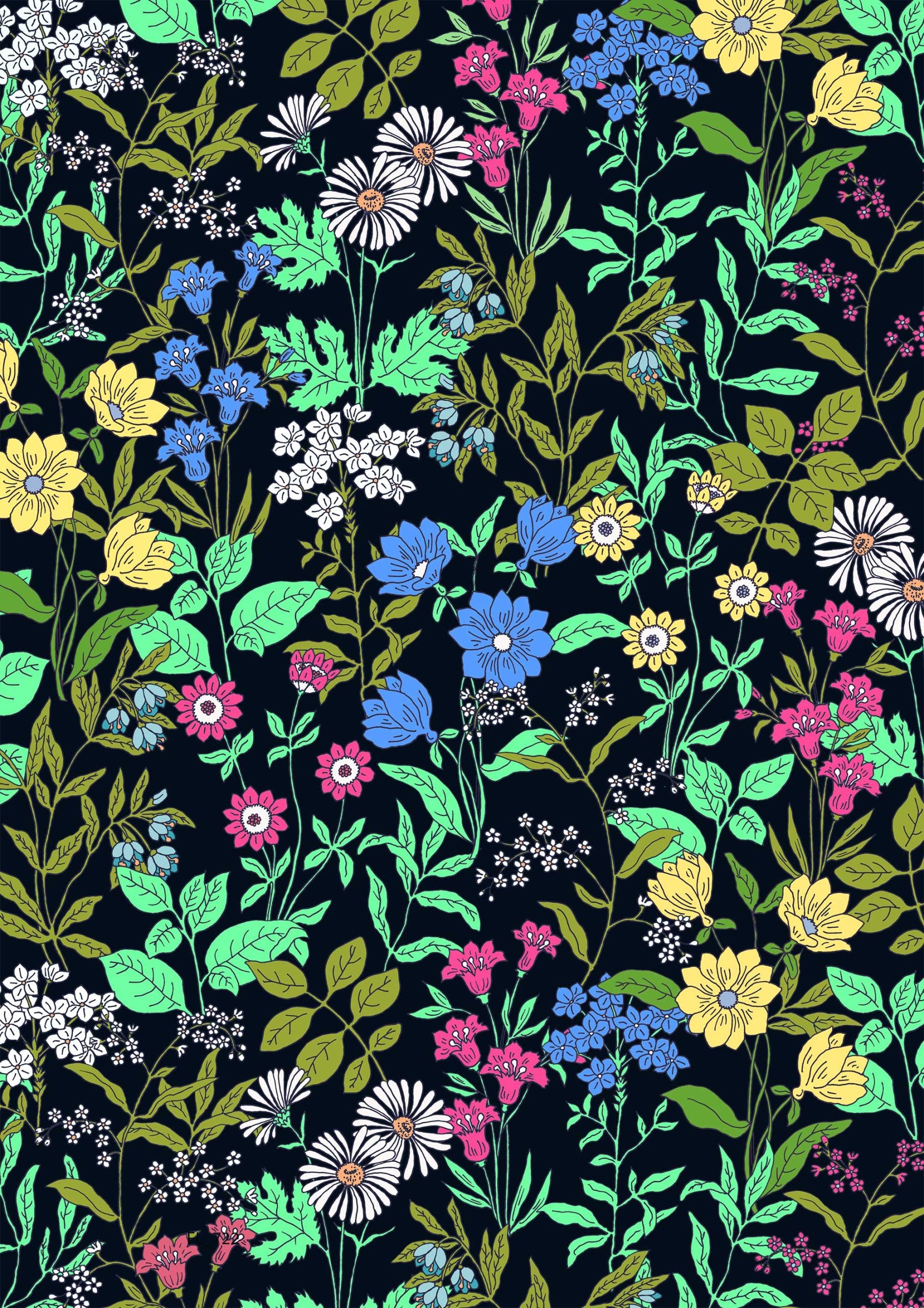 Botanical pattern filled with various small flowers and green leaves on a black base.