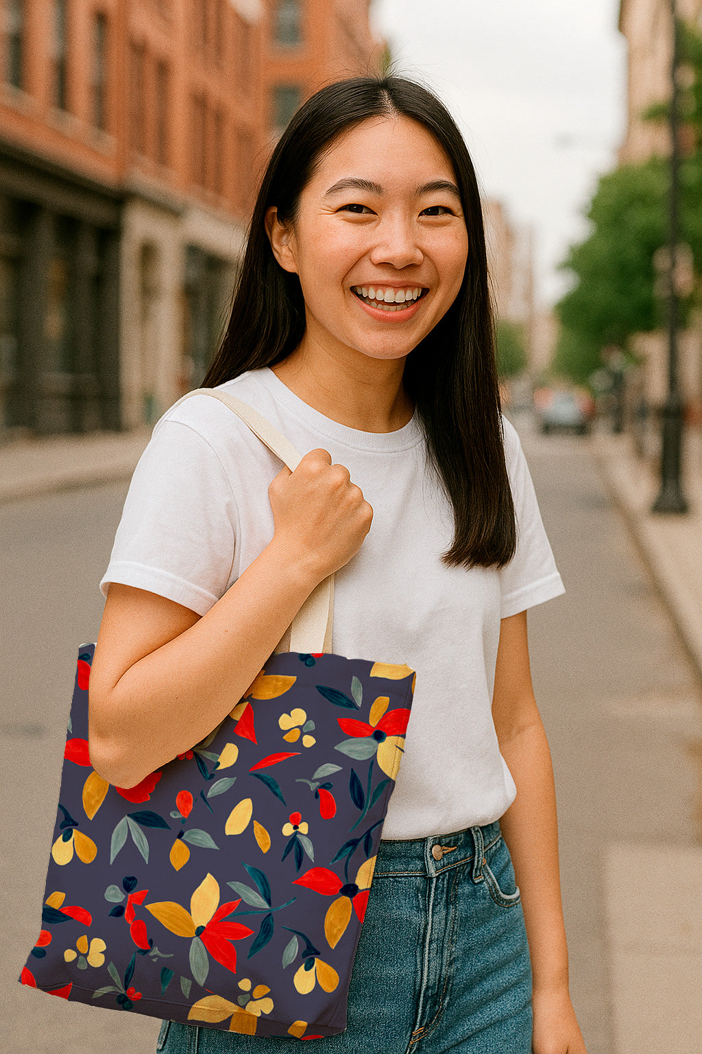 A graphic floral featuring red and golden petals on a deep purple background. Strong and simple, perfect for statement garments and accessories.