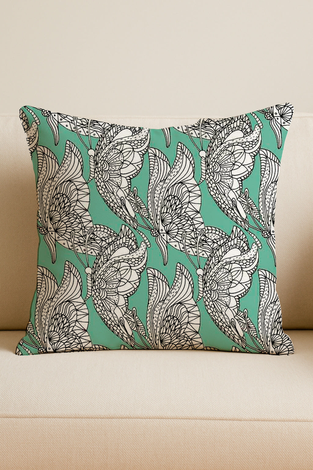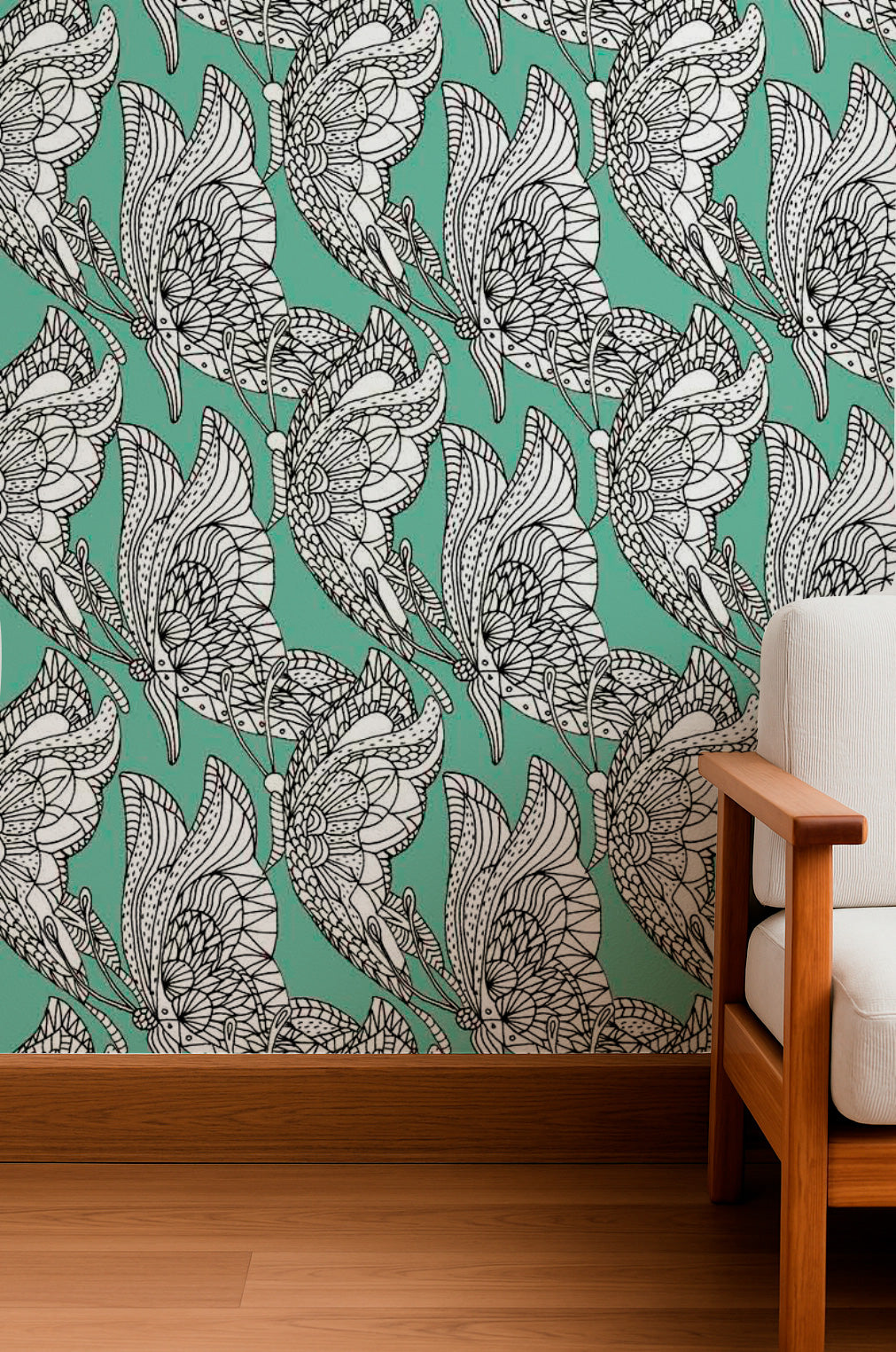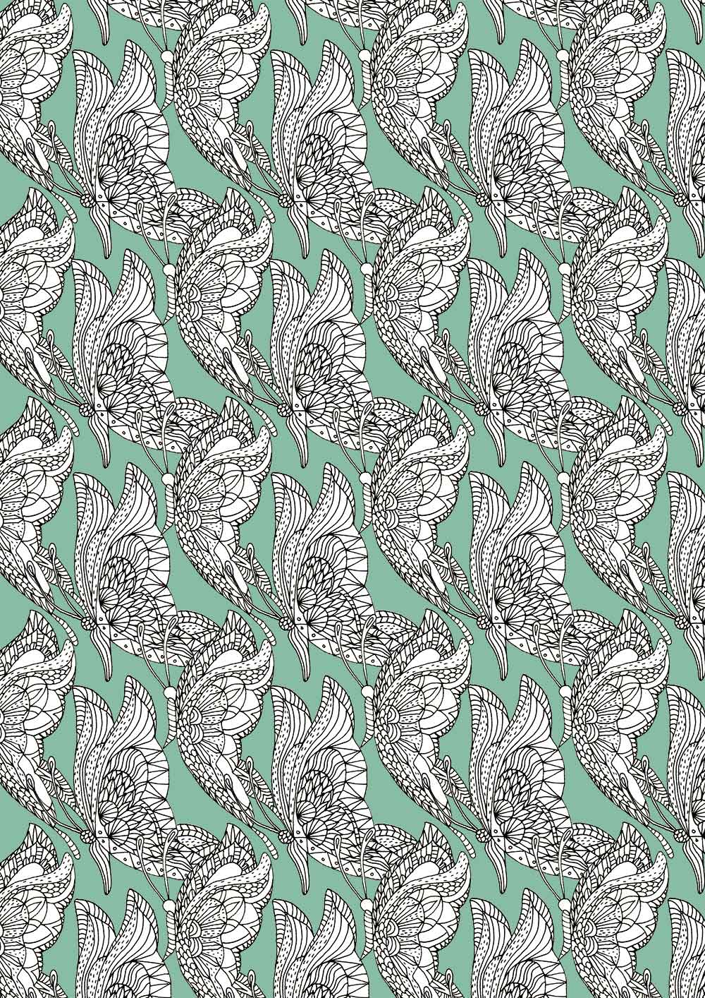 Intricate black and white butterflies repeat over a mint green background in a delicate, detailed style.