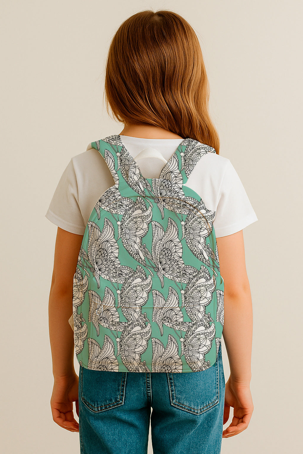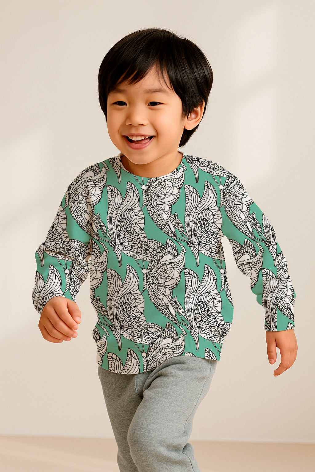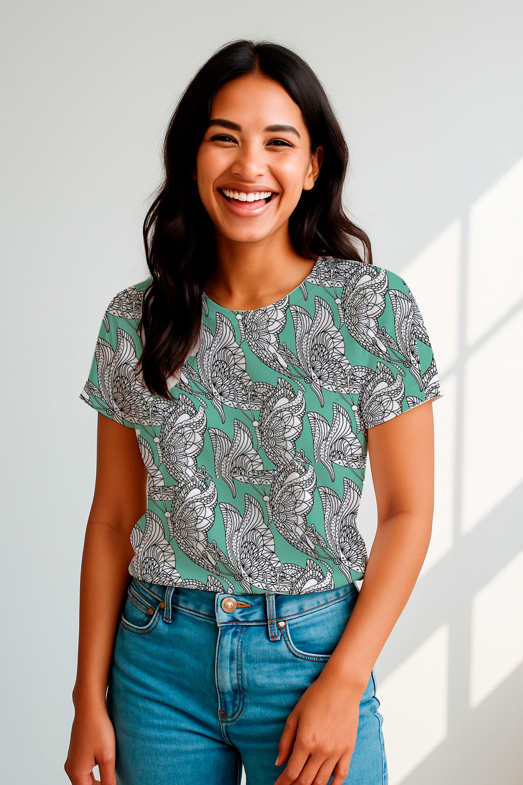 Intricate black and white butterflies repeat over a mint green background in a delicate, detailed style.