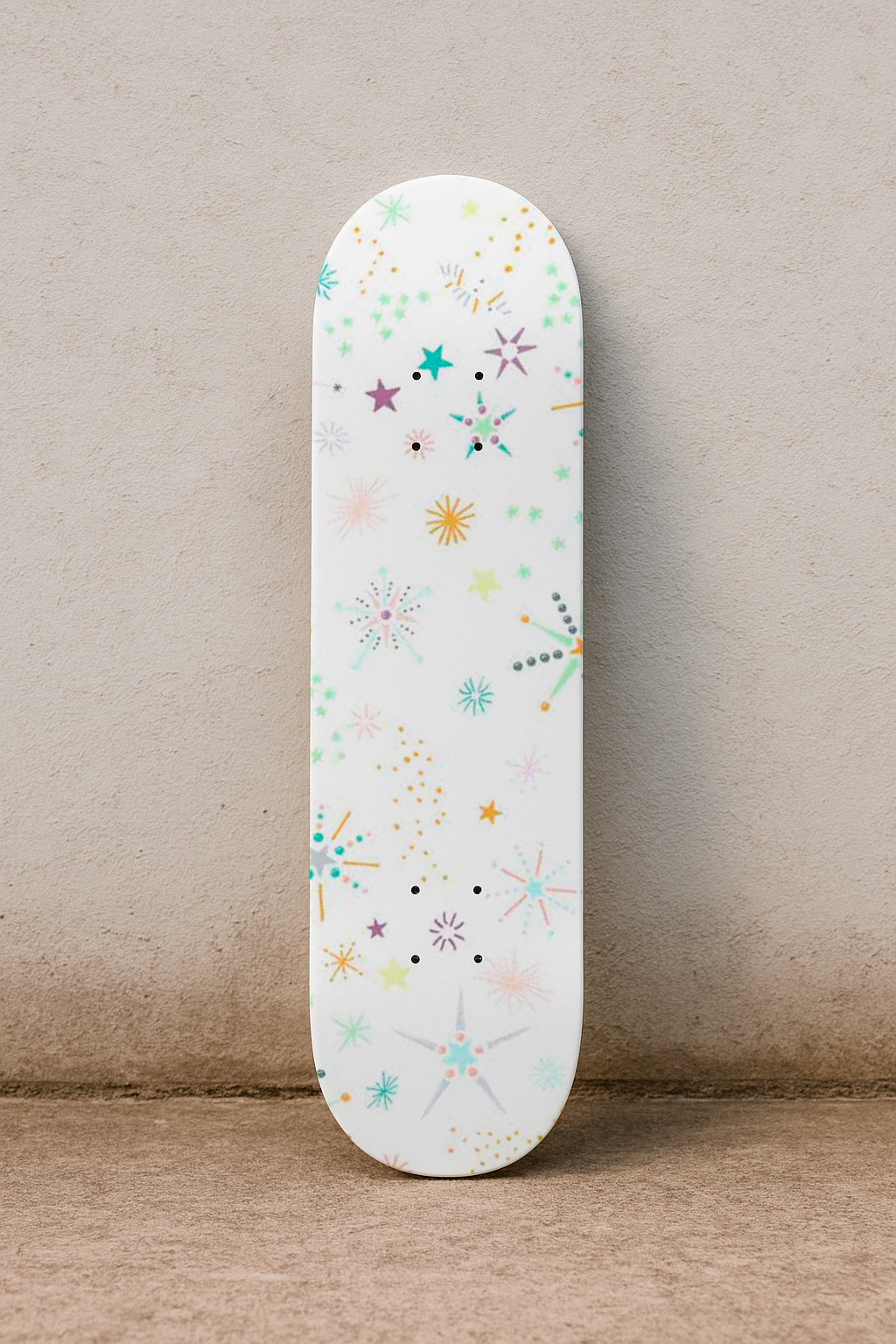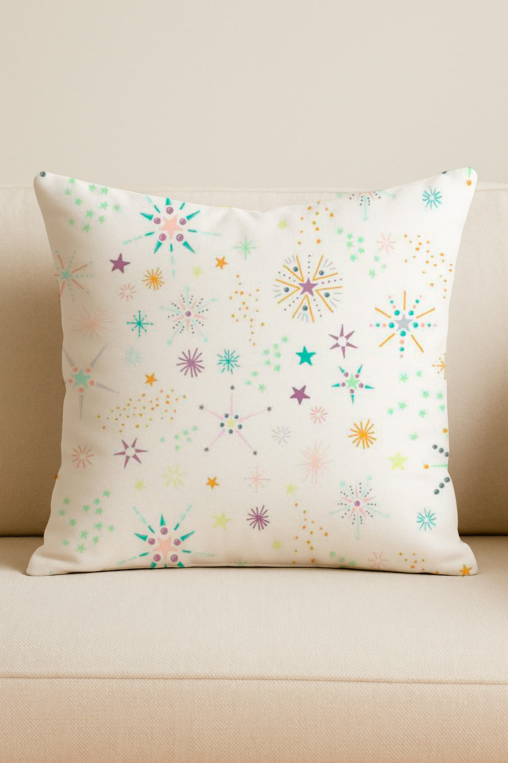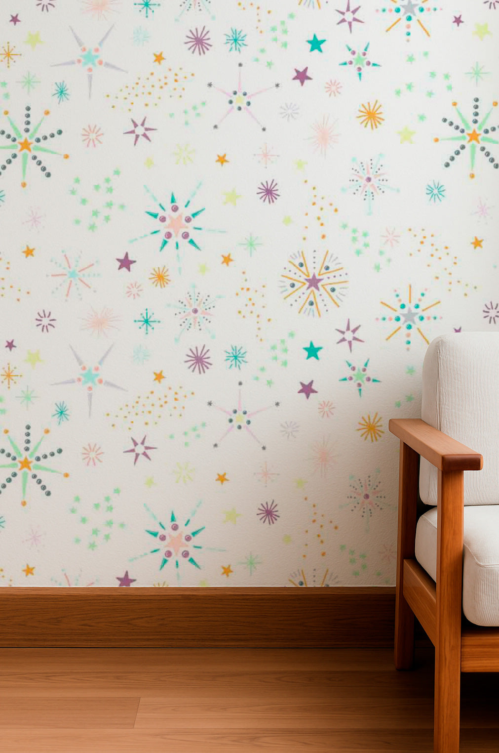 Mid-century style fireworks and stars in pastel tones scatter over a white background in playful bursts.