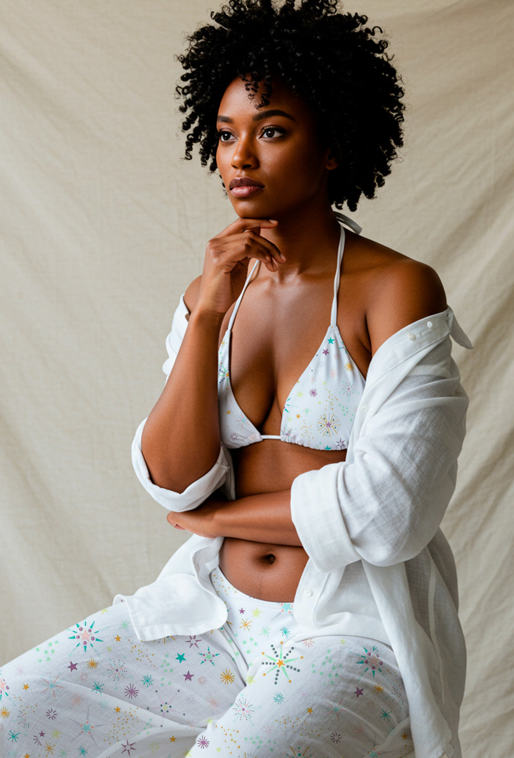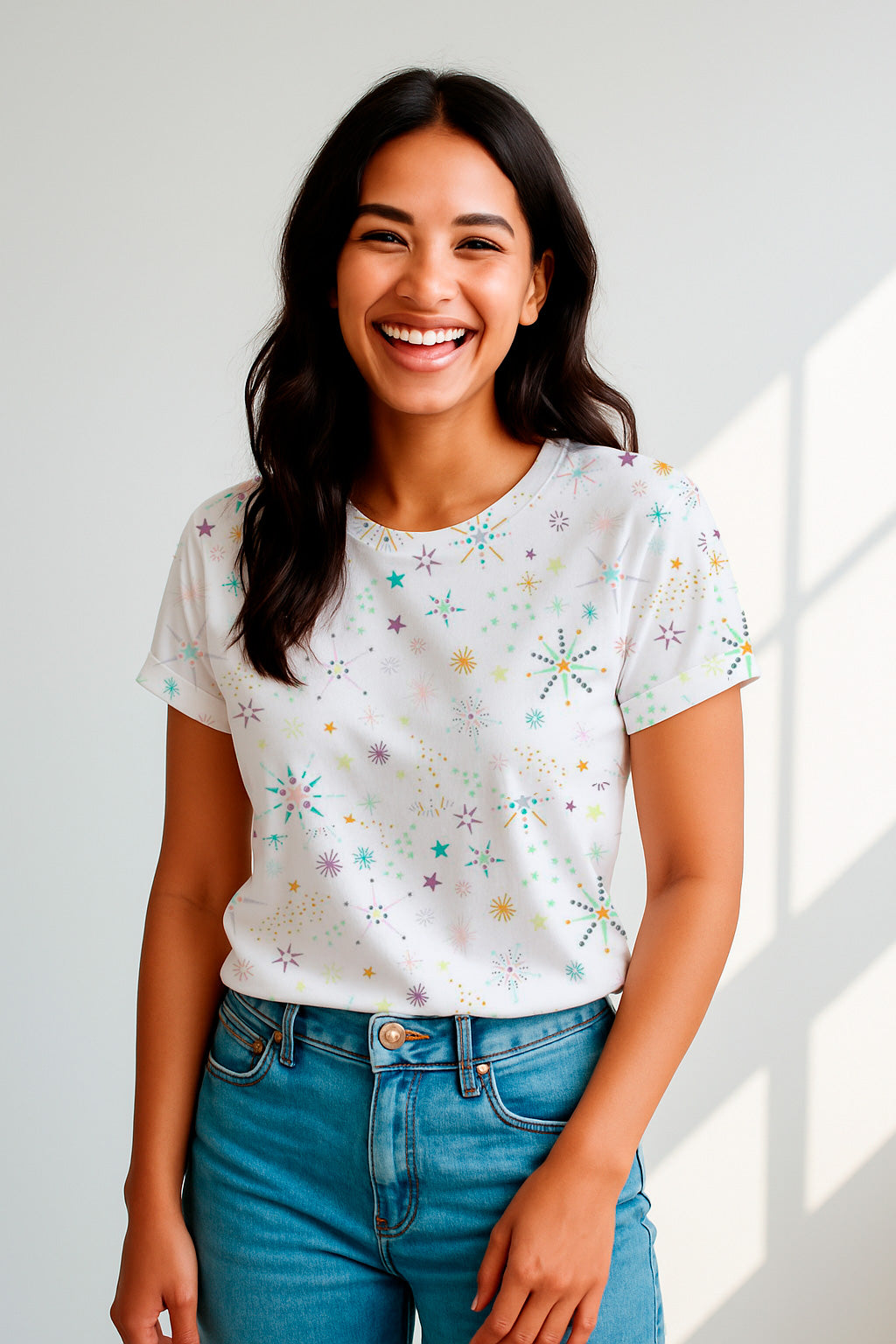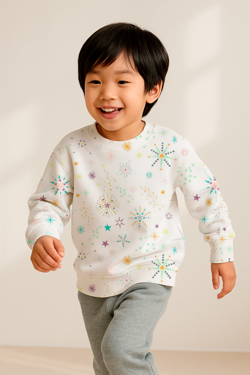 Mid-century style fireworks and stars in pastel tones scatter over a white background in playful bursts.