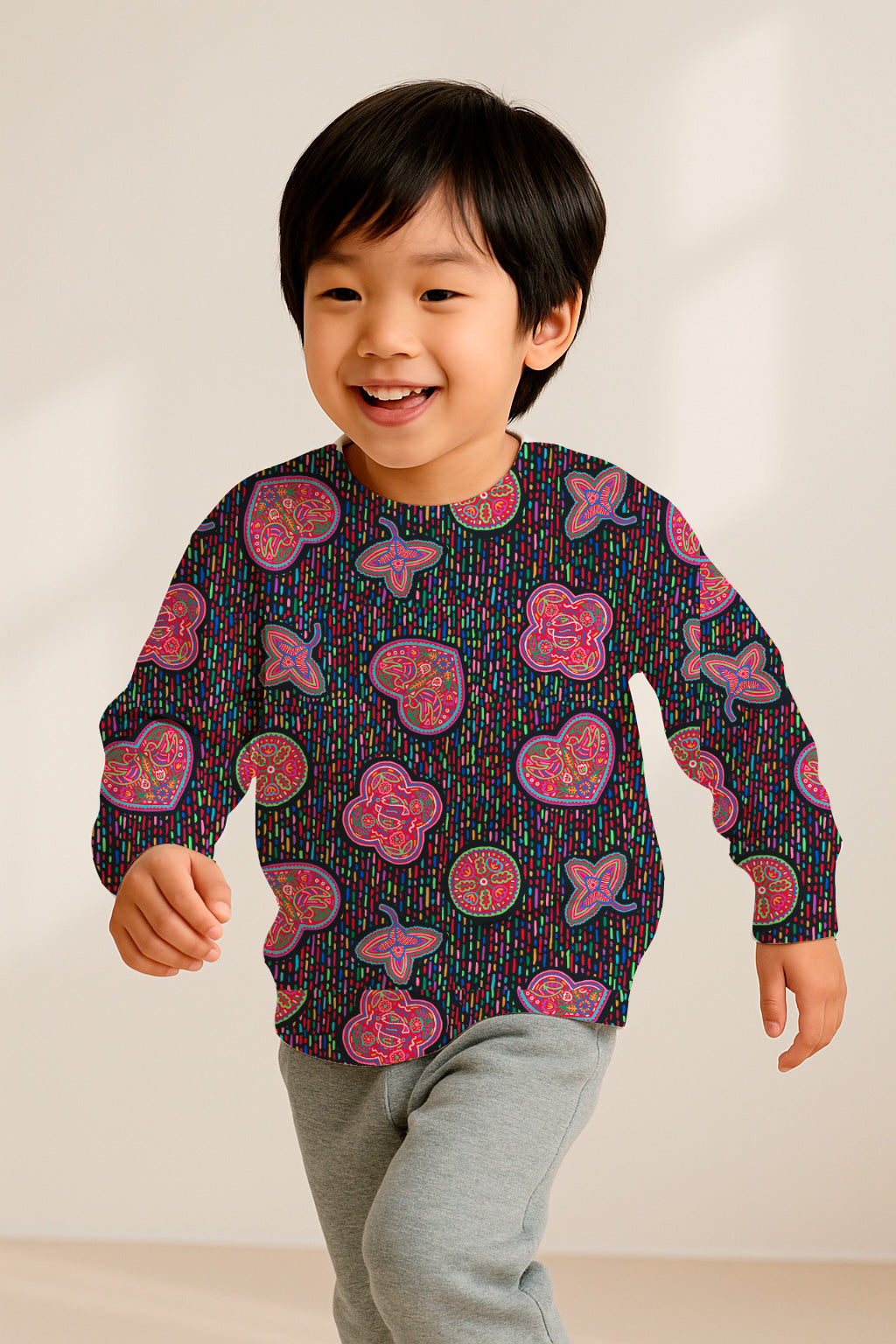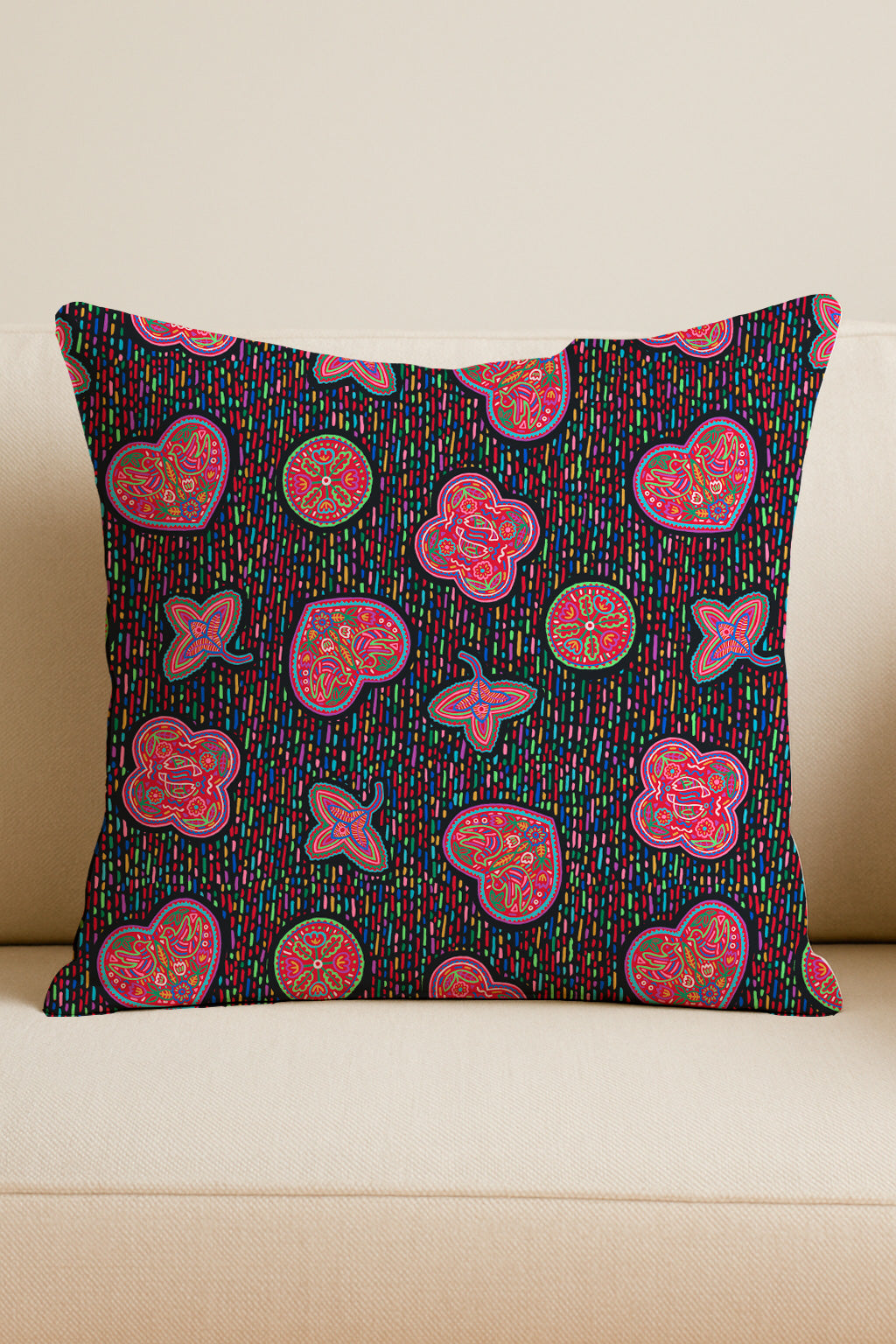 Playful pattern of stylized fruit slice motifs in pink and red with colorful dotted background, giving it a fun, energetic, and festive vibe.