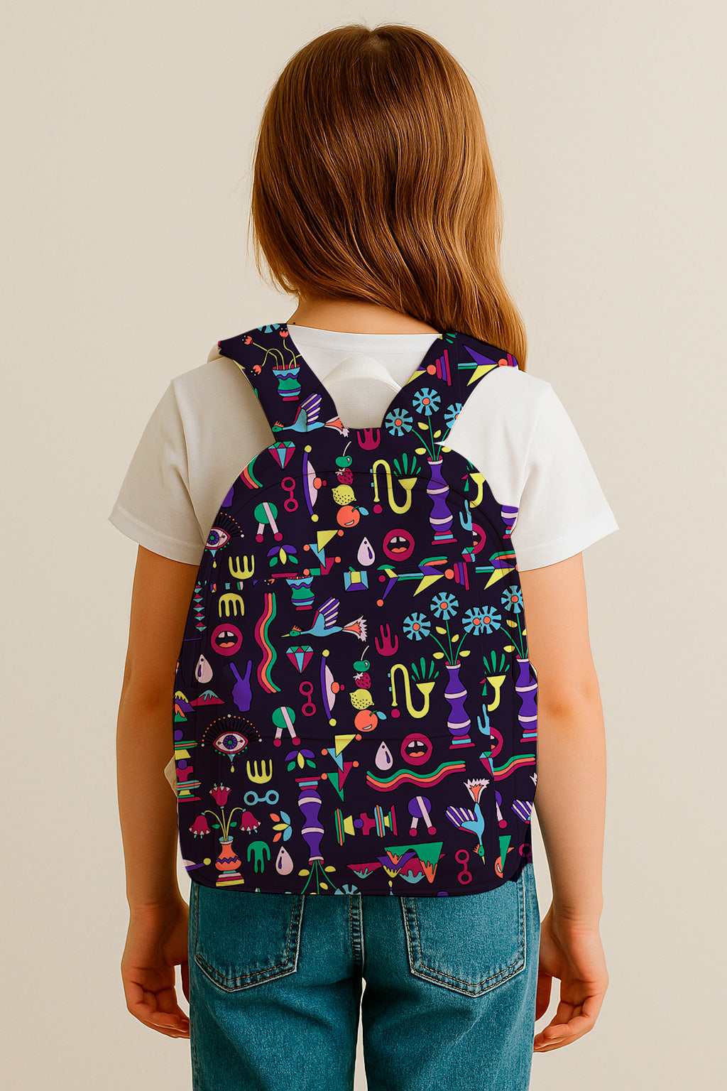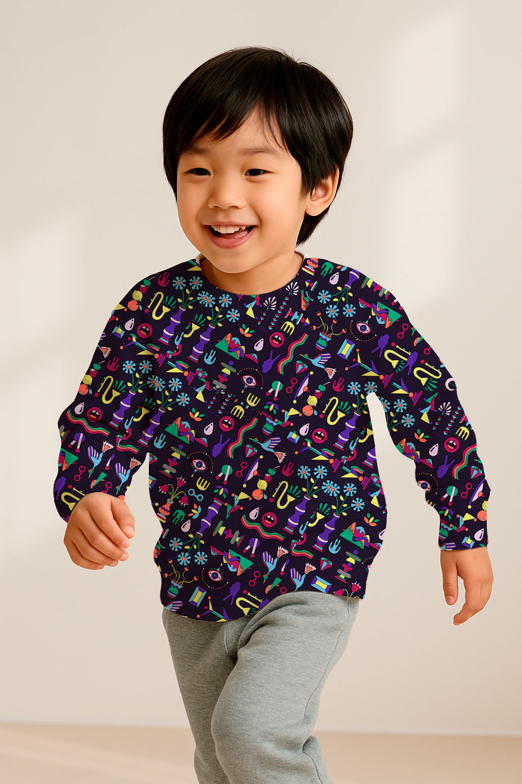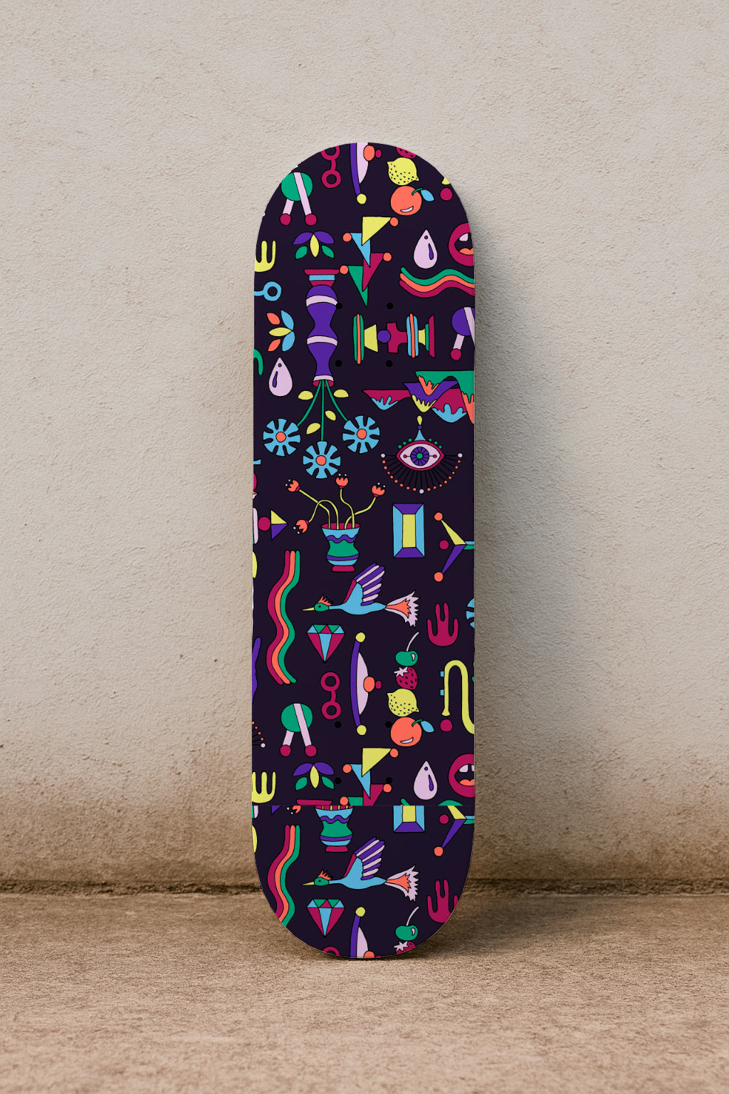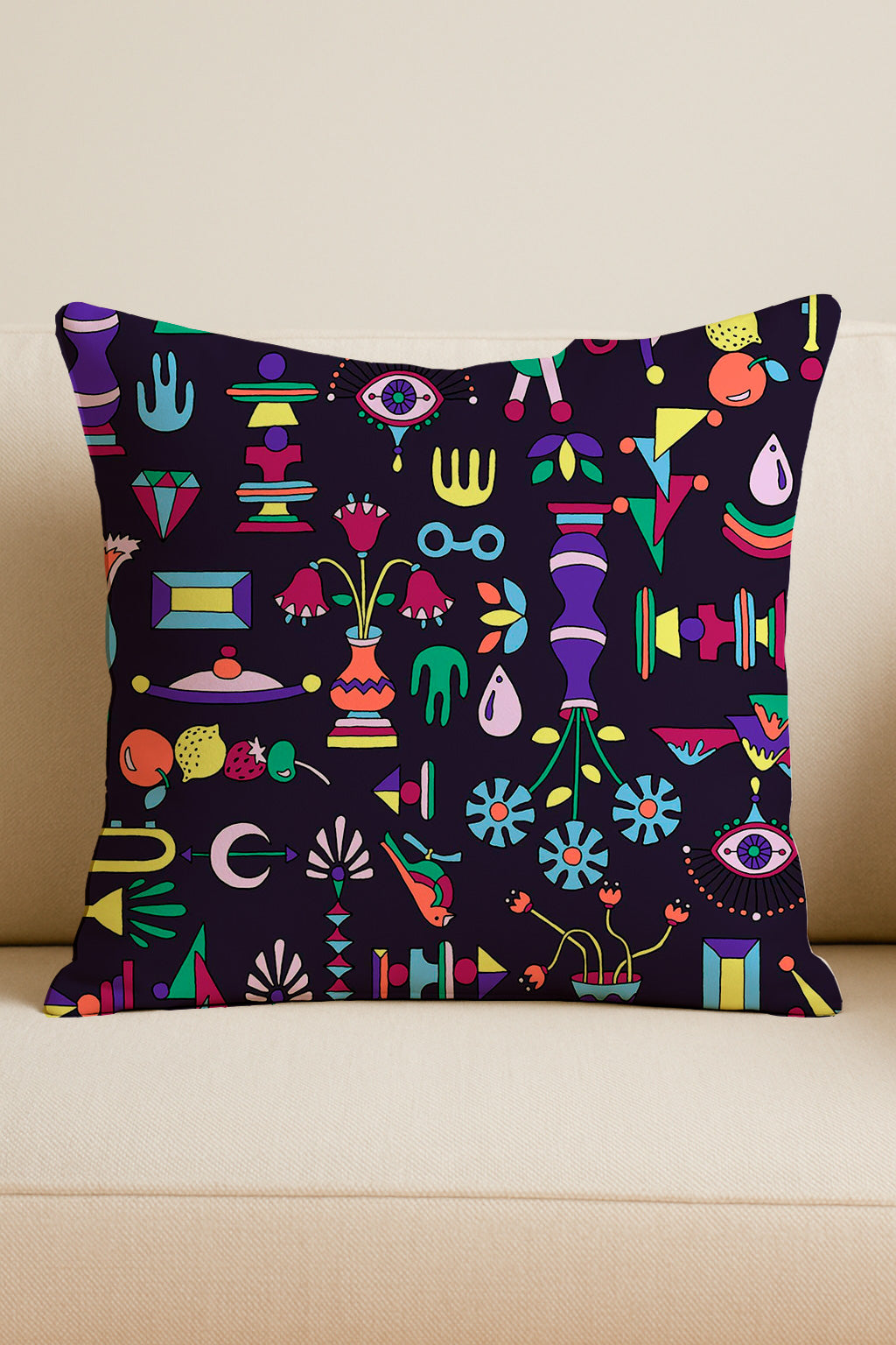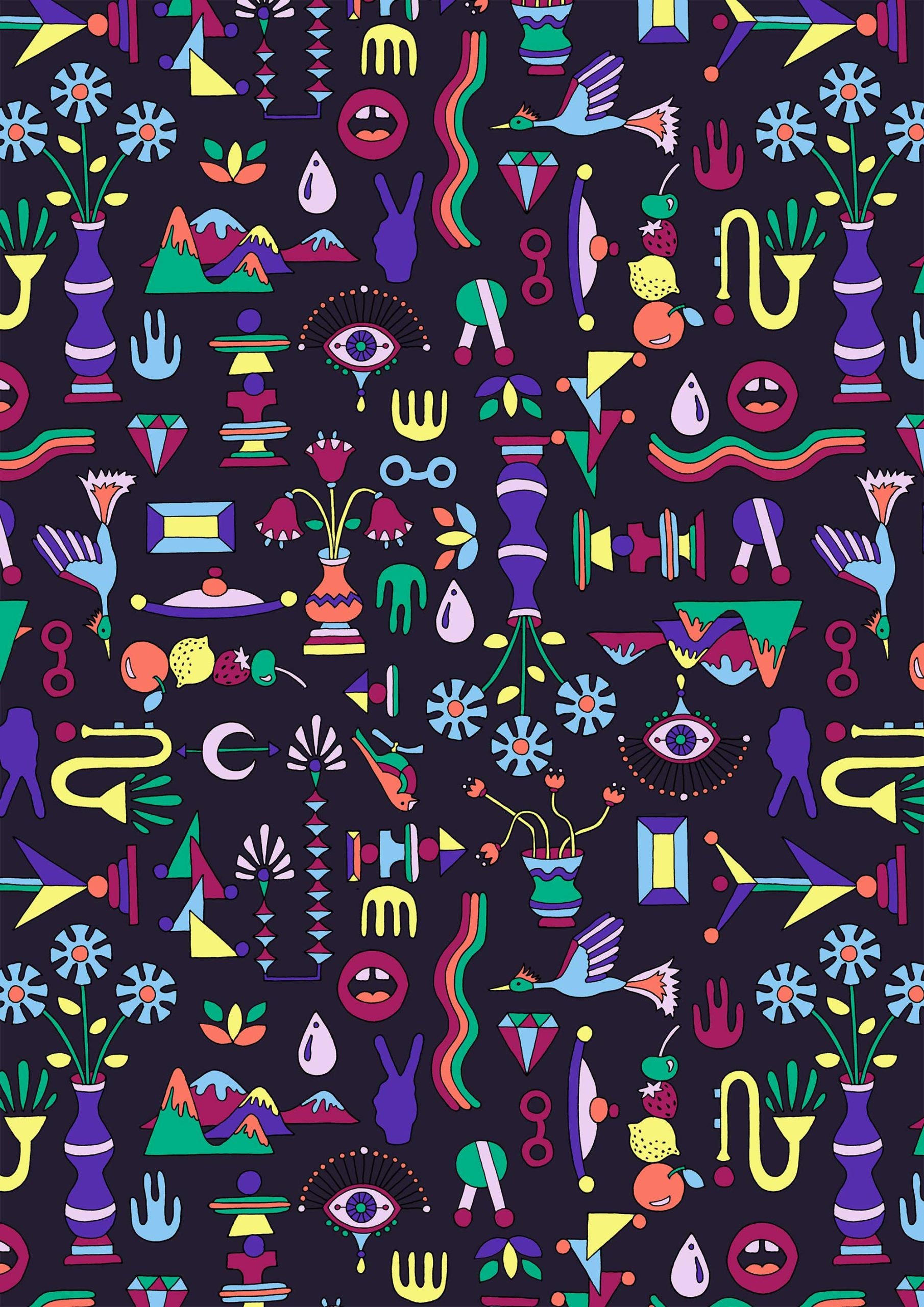 Bright, colorful doodles of geometric shapes, eyes, plants and symbols arranged over a black background. Eclectic and modern vibe.
