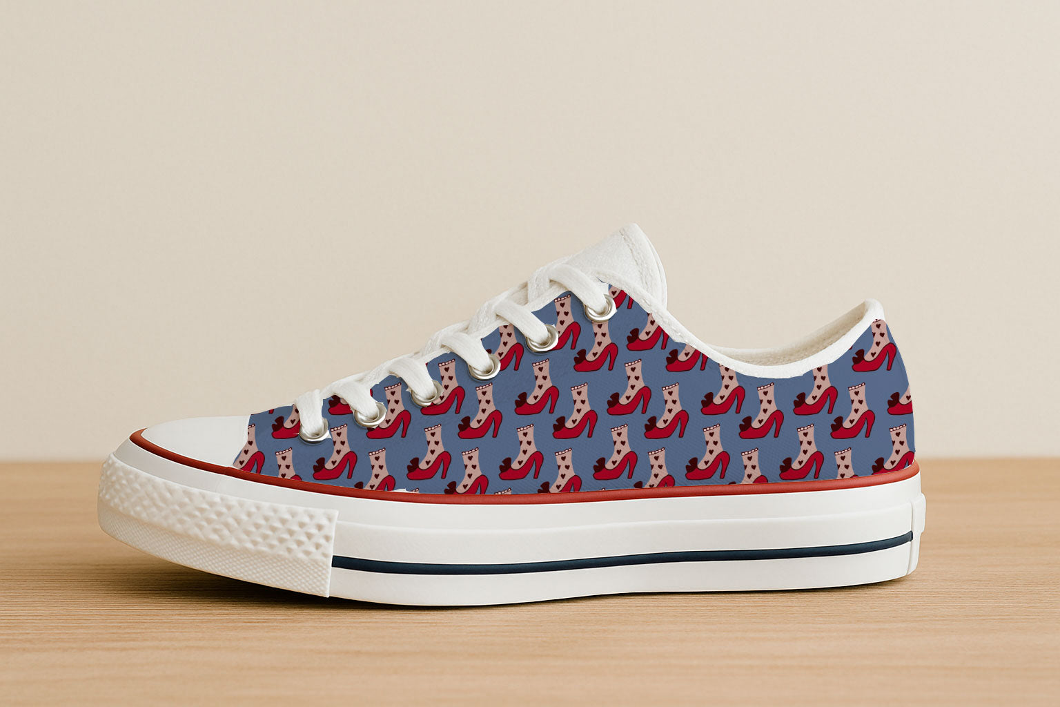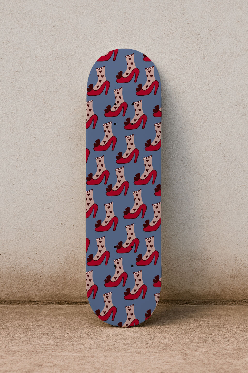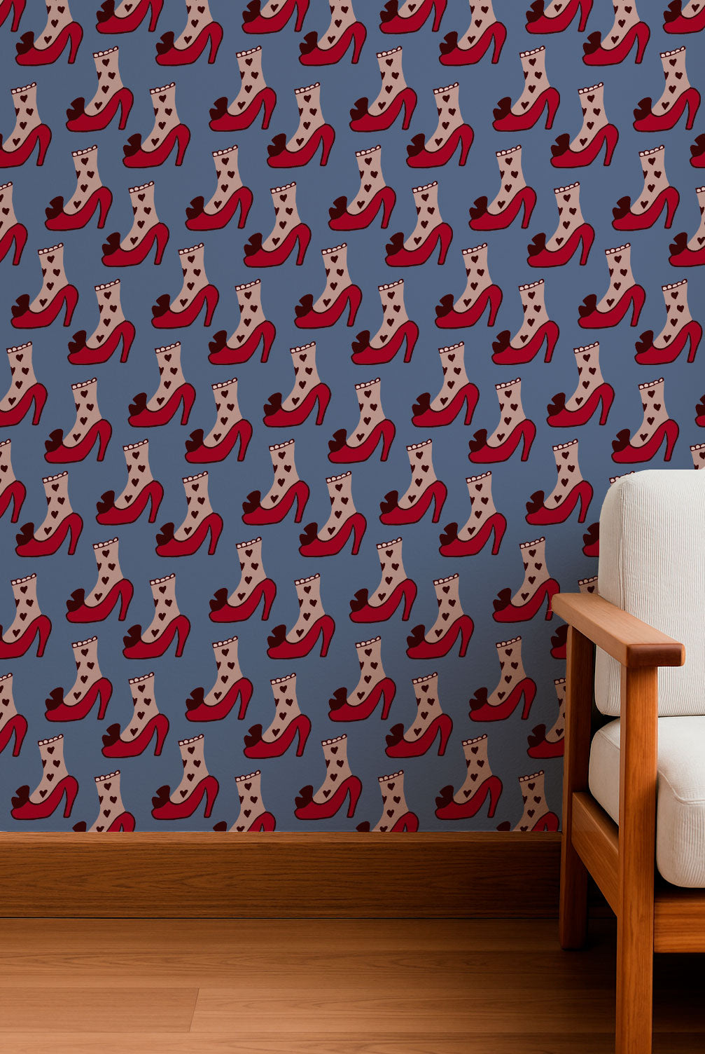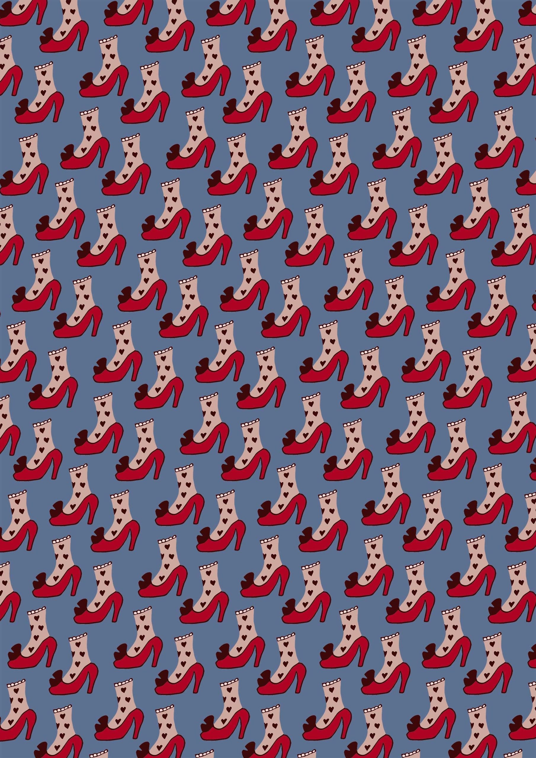 Funky pattern featuring red high heels with frilly socks in nude tones with hearts, inspired by quirky fashion statements.