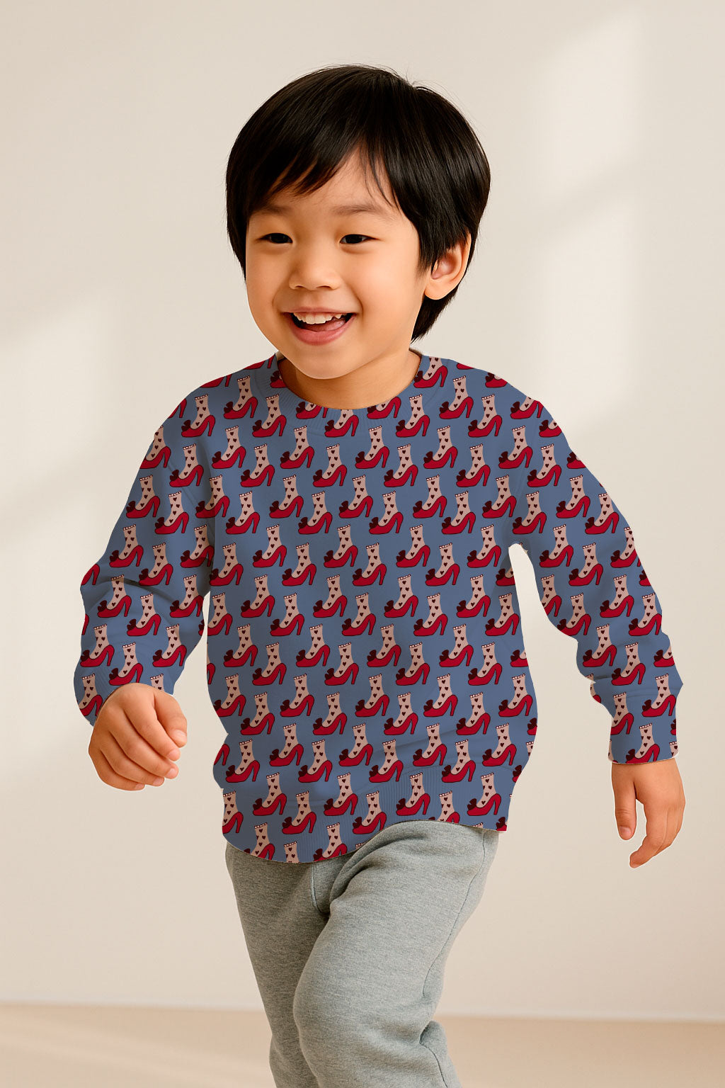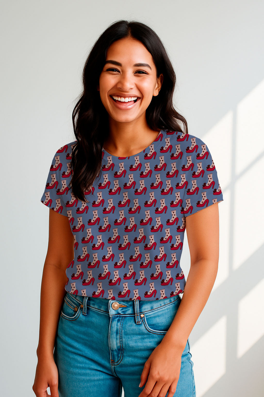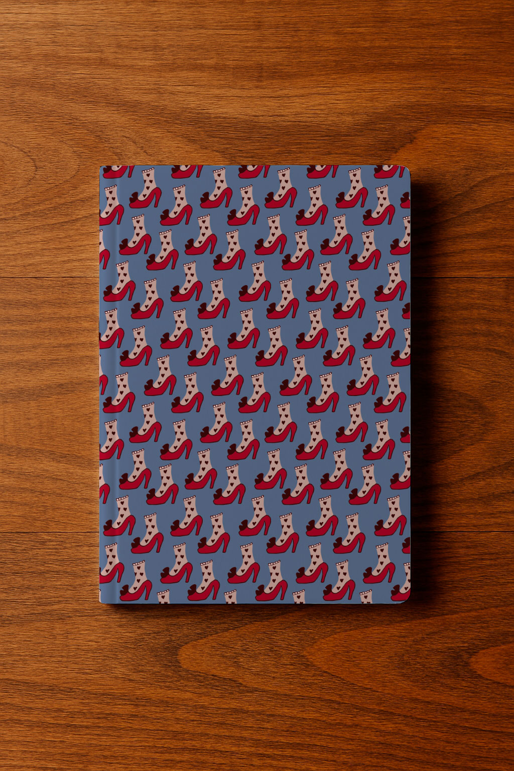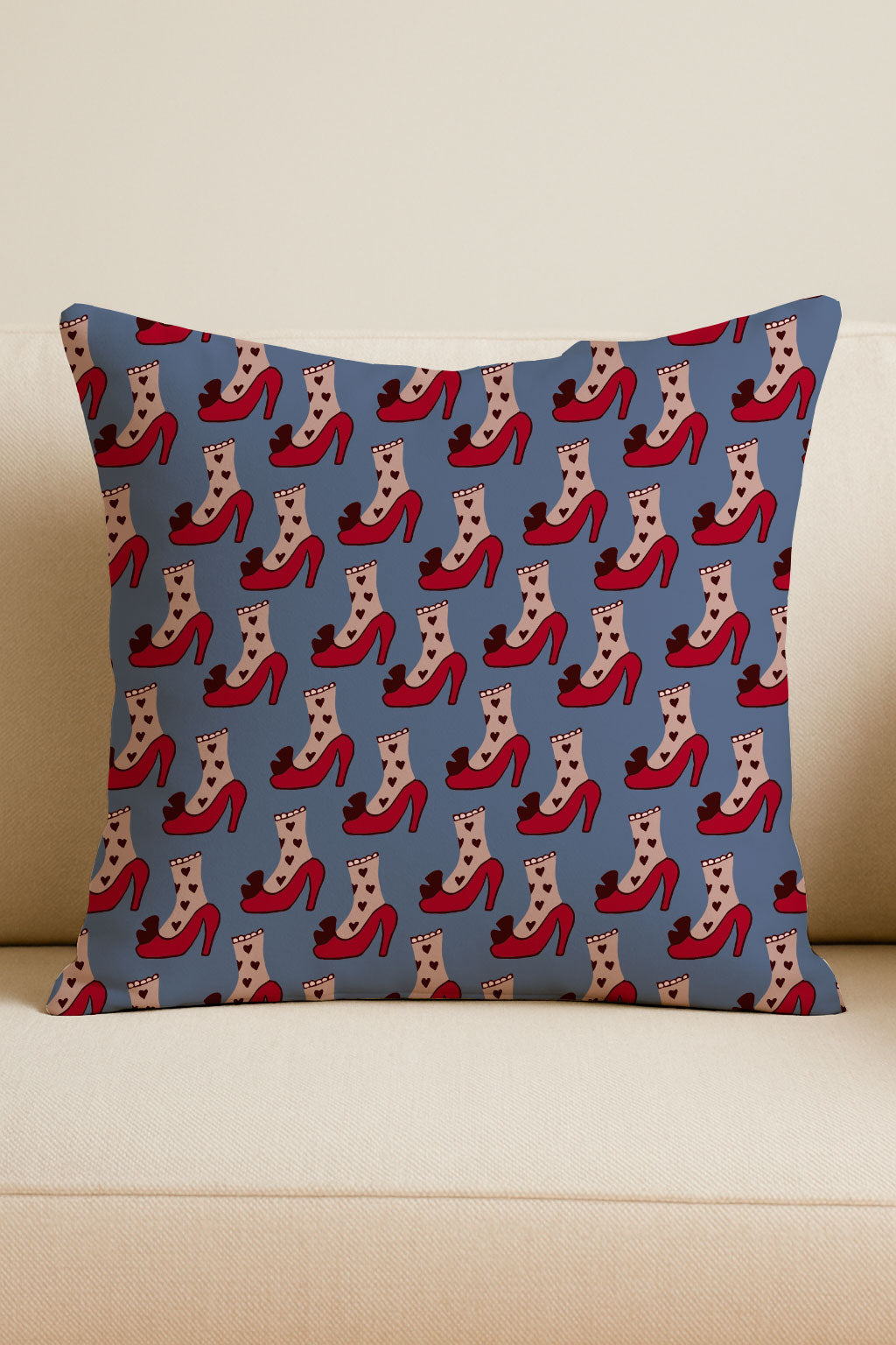Funky pattern featuring red high heels with frilly socks in nude tones with hearts, inspired by quirky fashion statements.