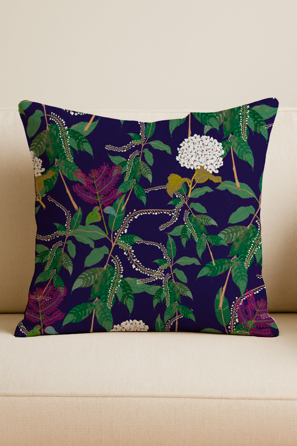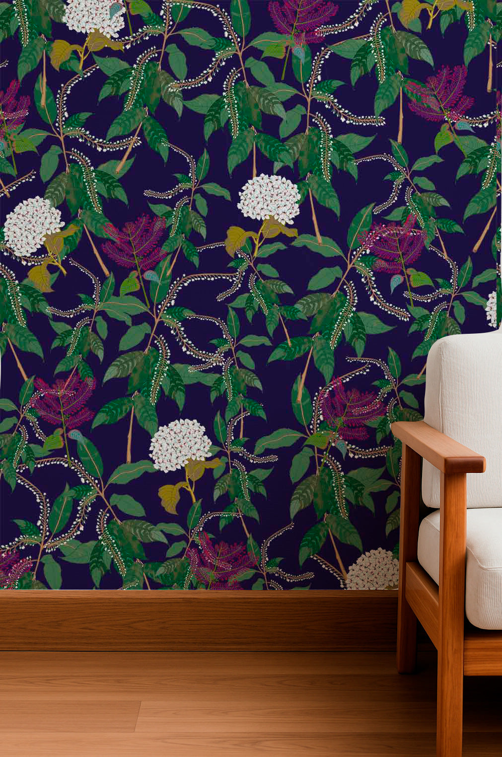 Elegant white floral clusters and pink blooms with trailing green vines over a deep purple background.
