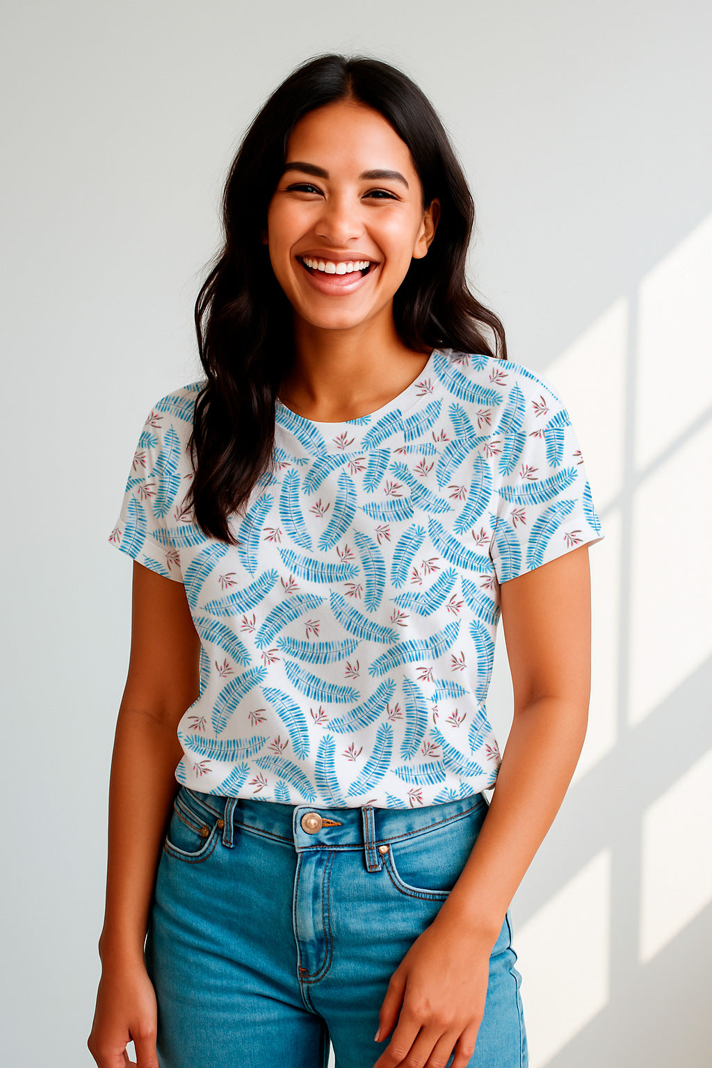 Light and airy pattern of blue ferns and small sprigs with a hand-painted watercolor effect.