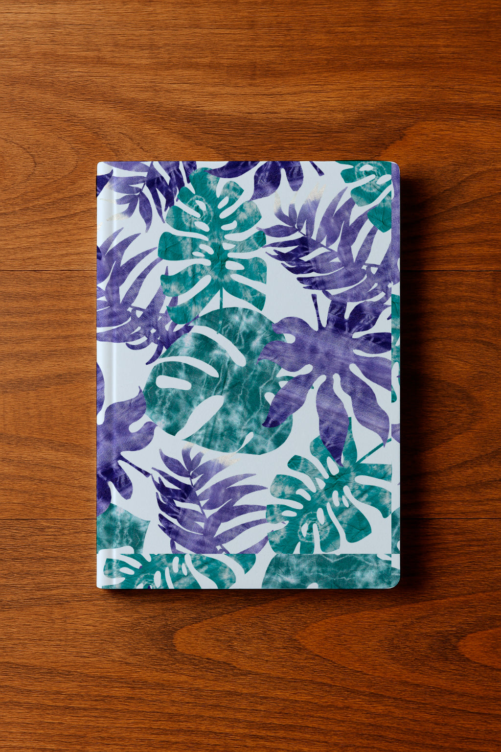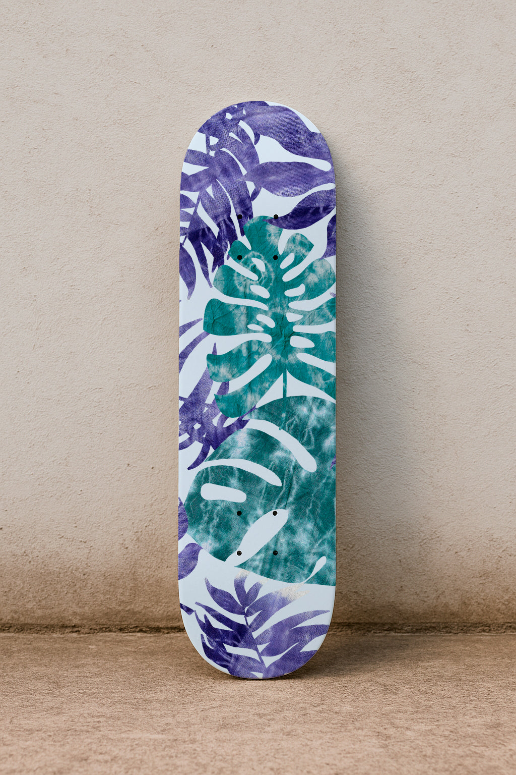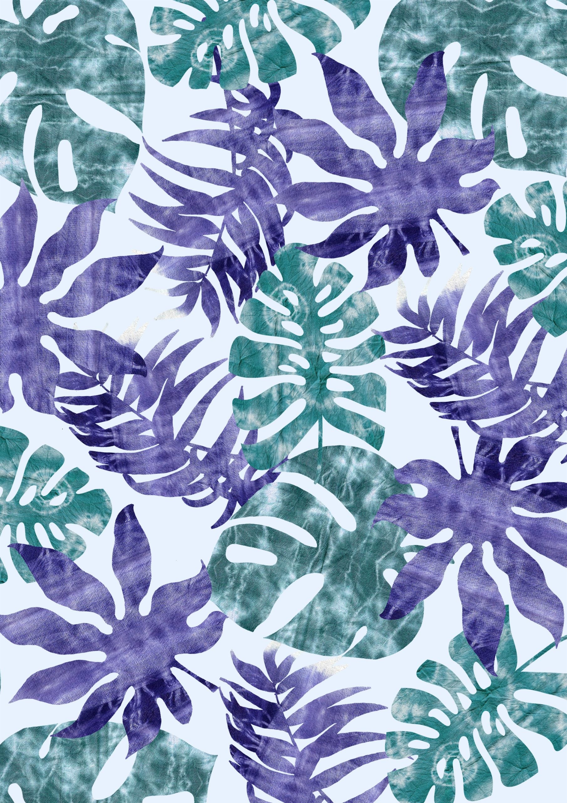 Oversized monstera and palm leaves in teal and purple hues with a textured effect on a light pastel blue base.