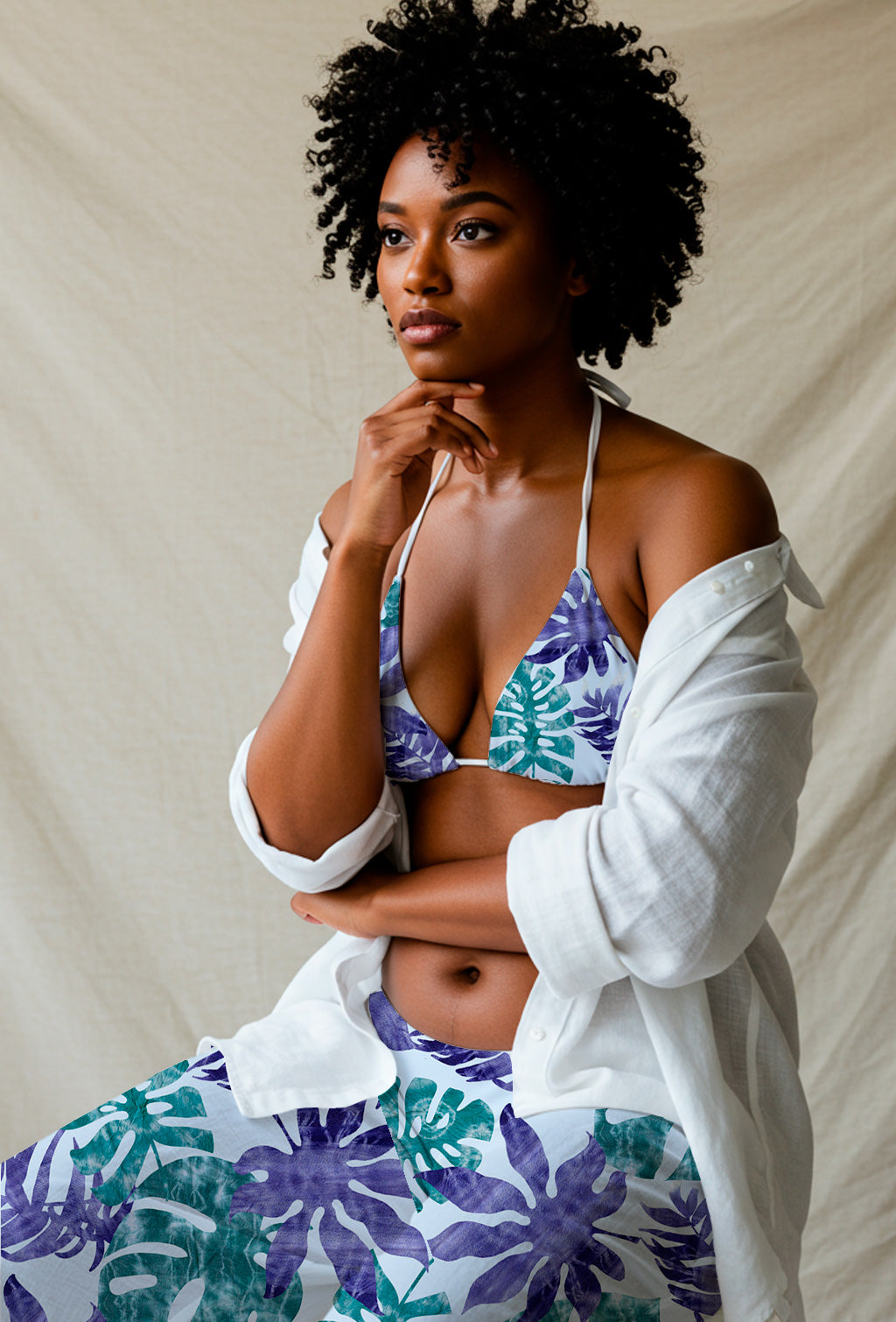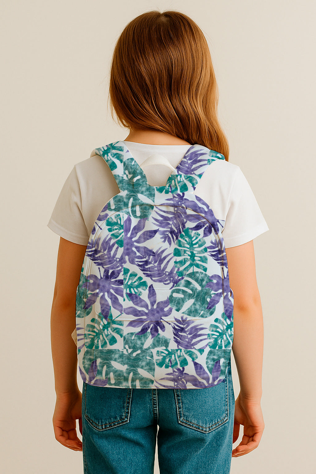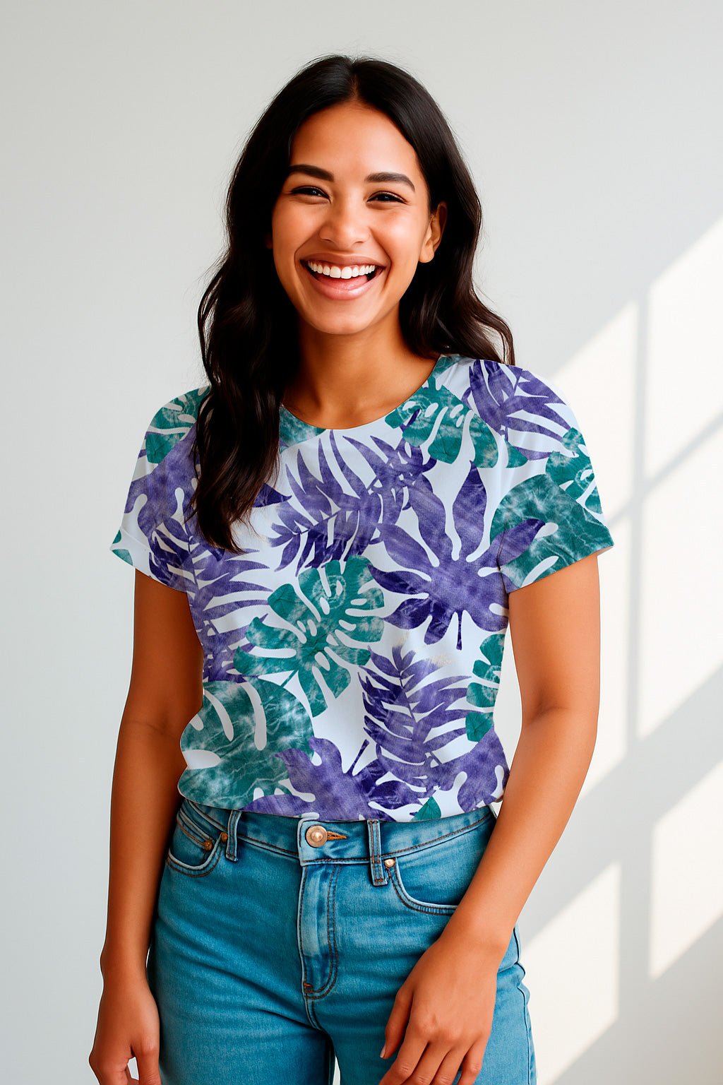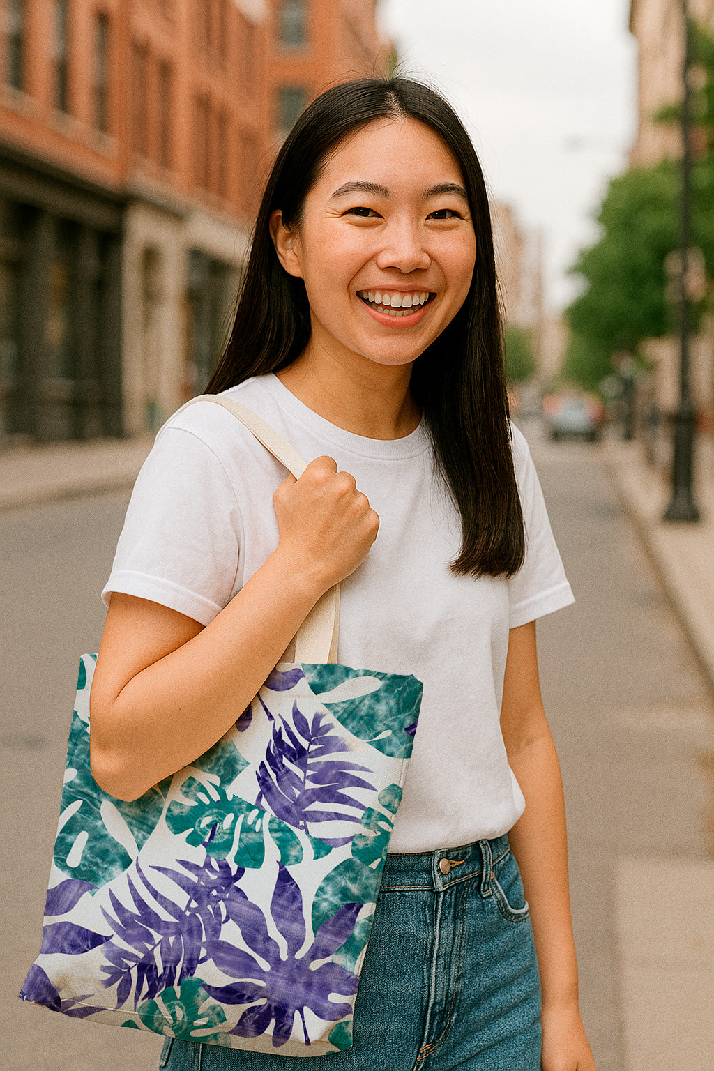 Oversized monstera and palm leaves in teal and purple hues with a textured effect on a light pastel blue base.