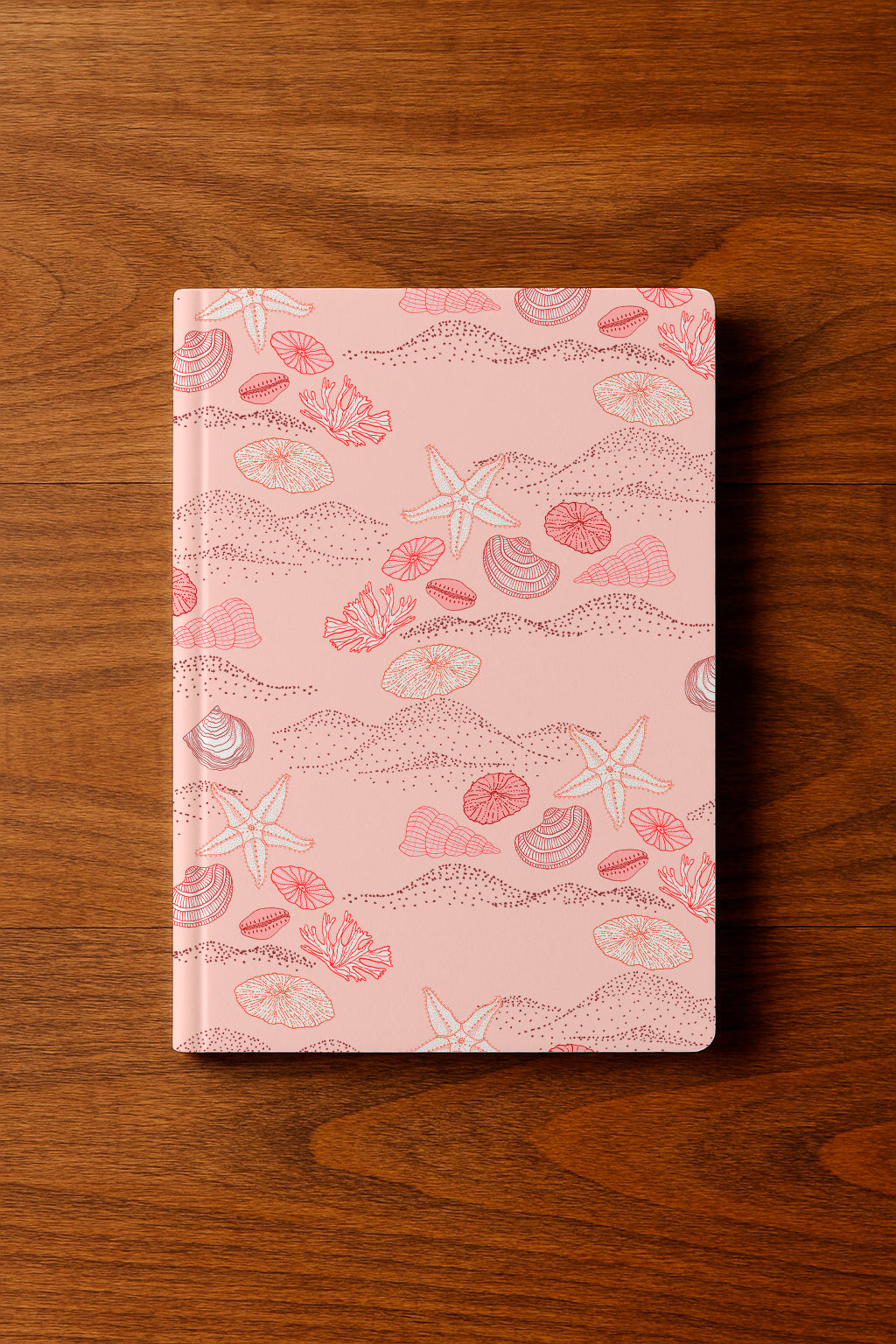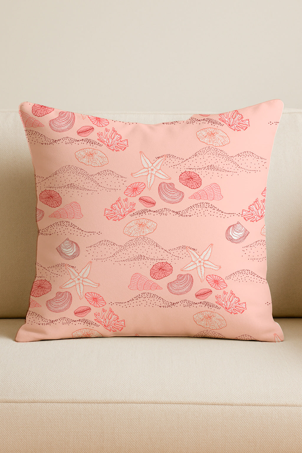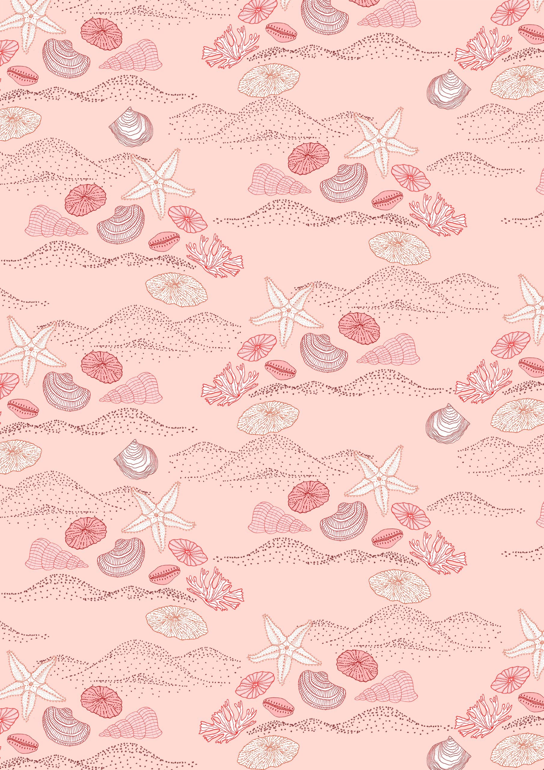 A soft pink backdrop scattered with shells, coral, and sand patterns for a serene beach vibe.