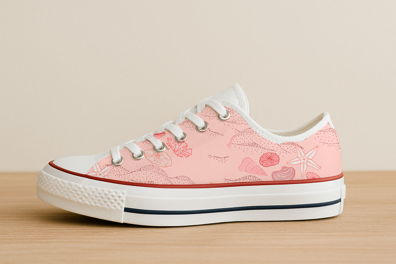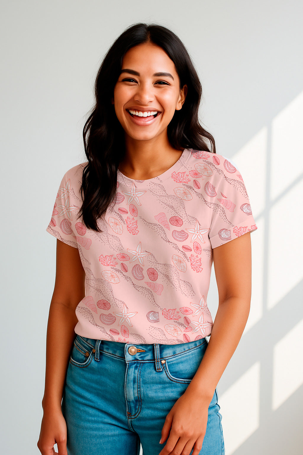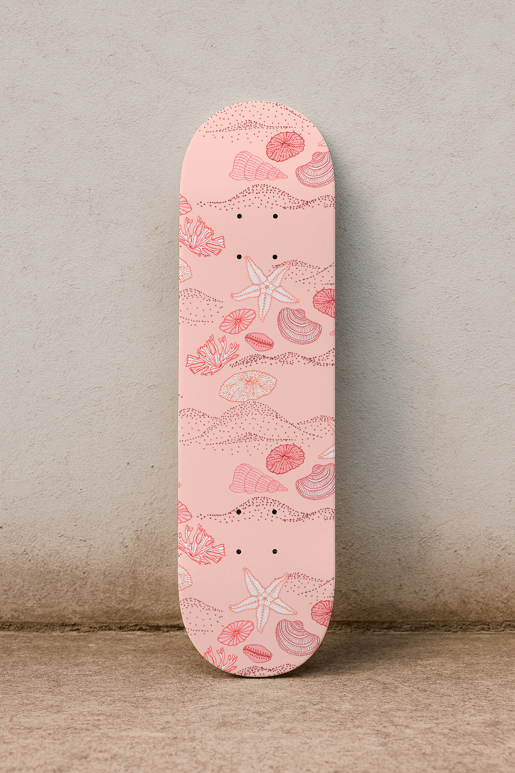 A soft pink backdrop scattered with shells, coral, and sand patterns for a serene beach vibe.