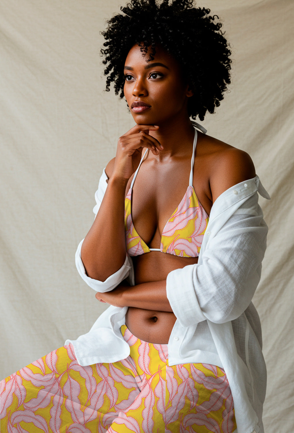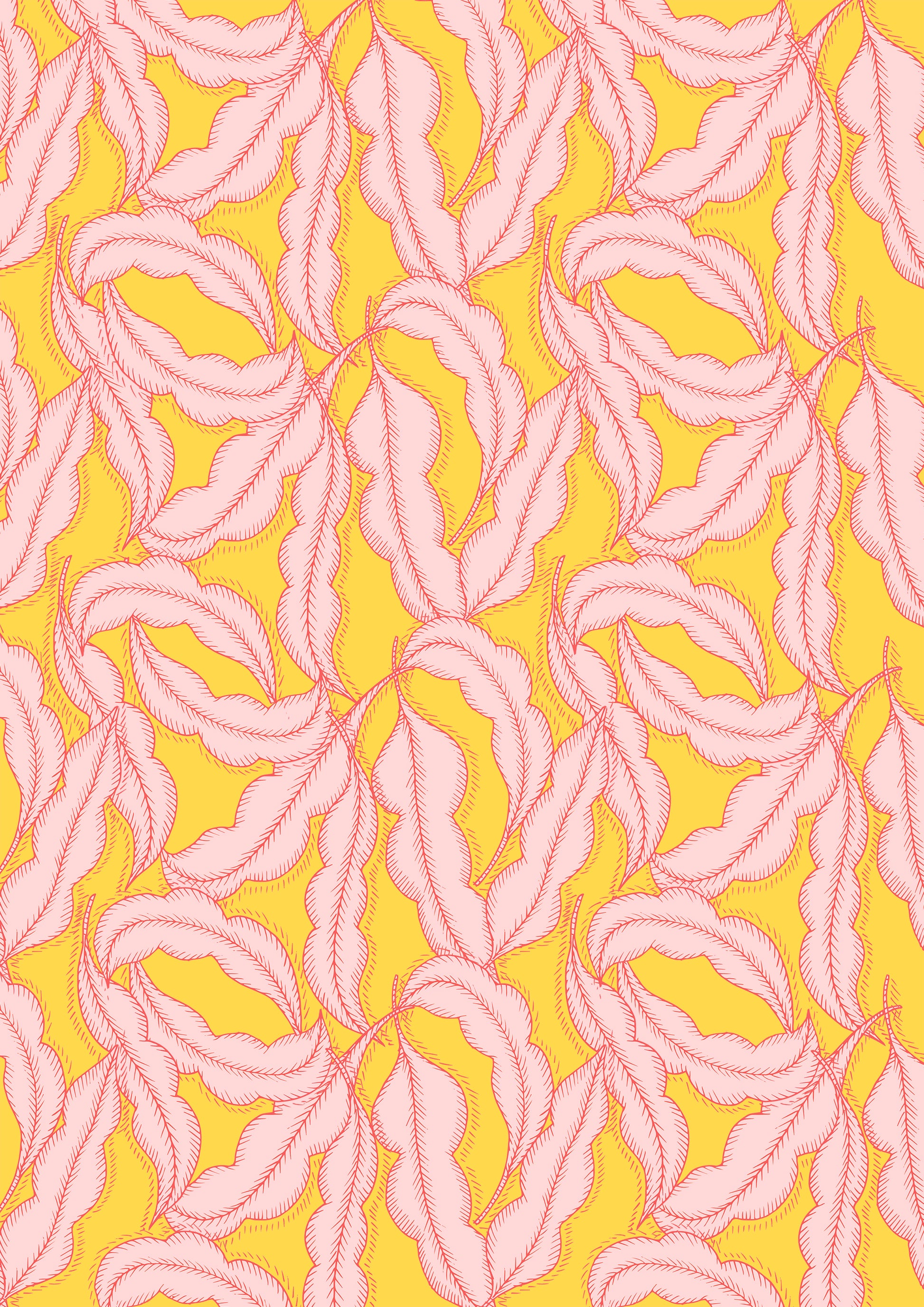 Feathery hand-drawn leaves in soft pink on a vivid yellow background with fluid movement.
