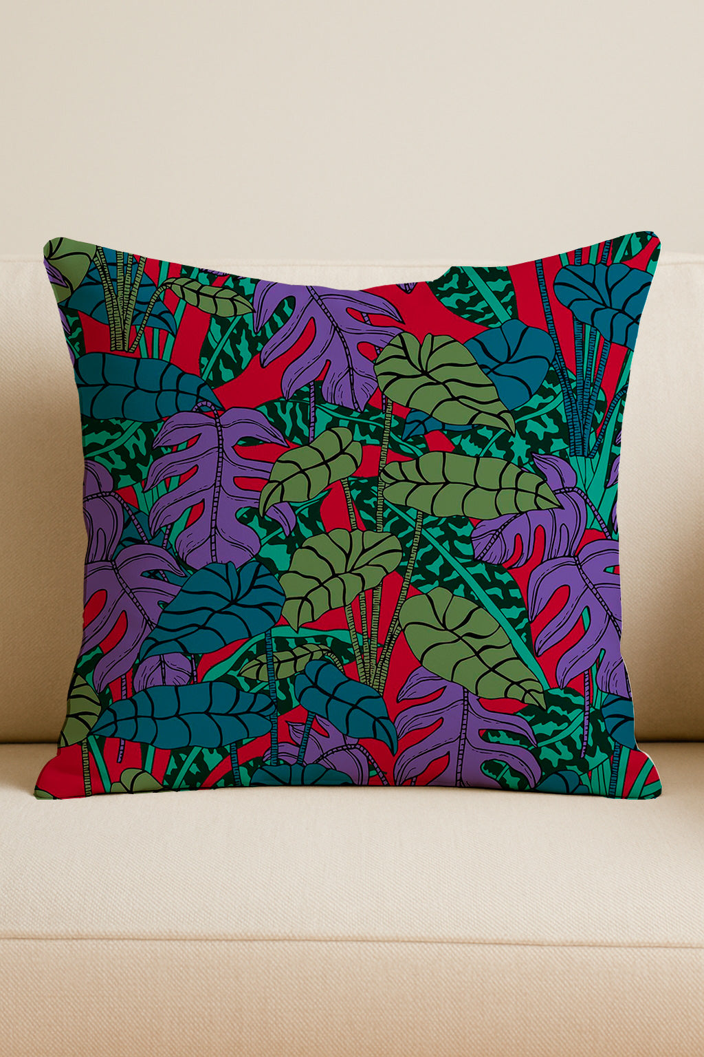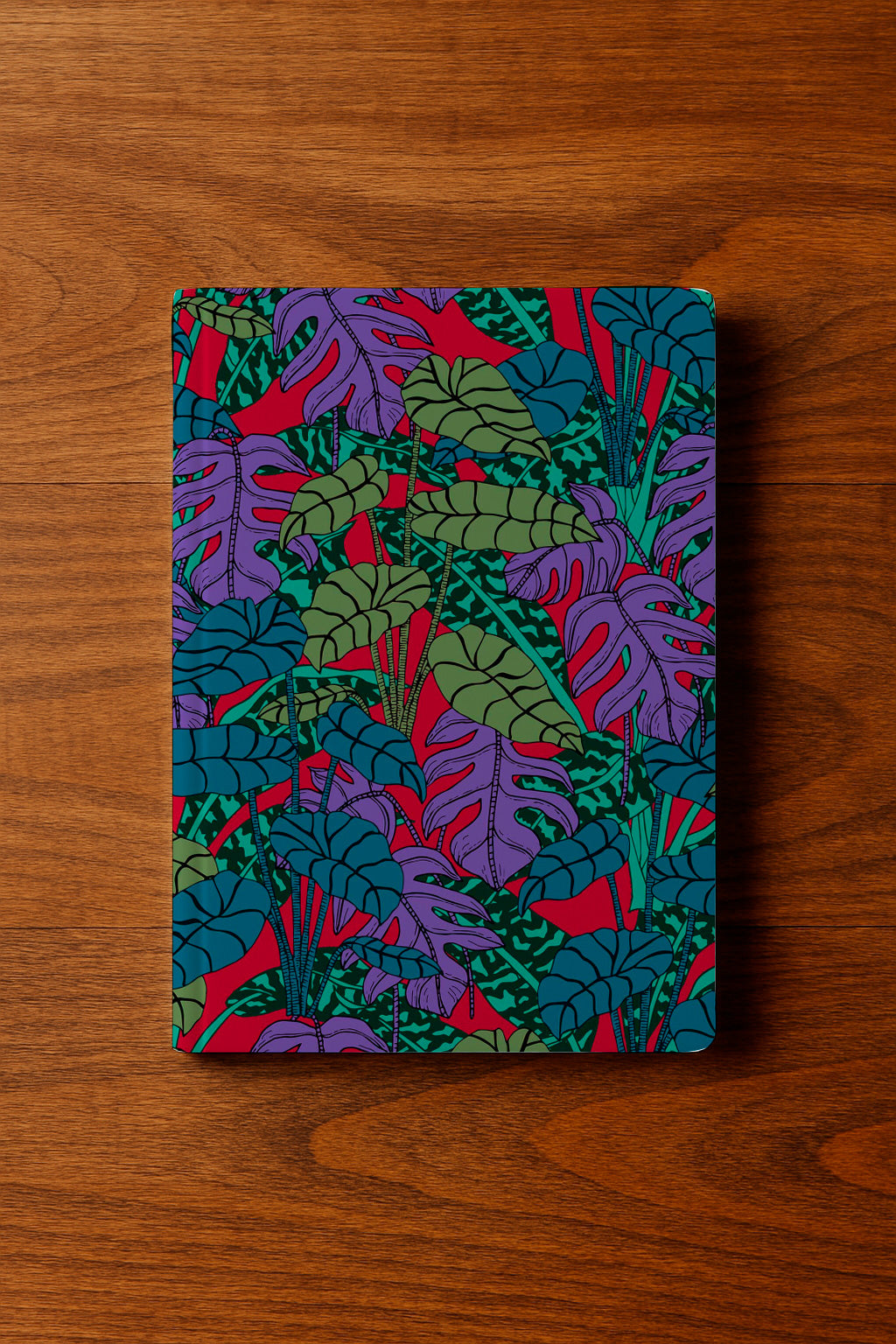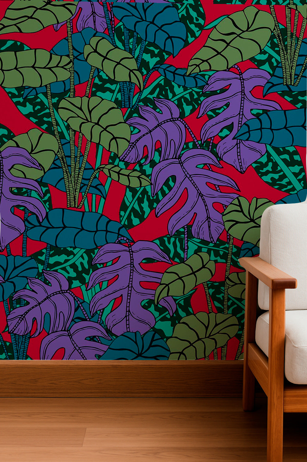 Overlapping tropical leaves in bold green, purple, and teal on a deep red background.