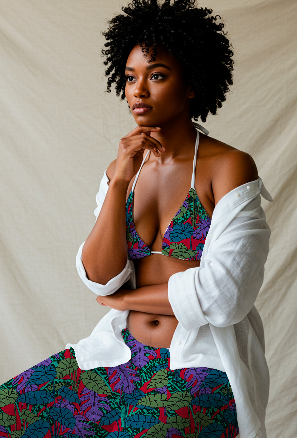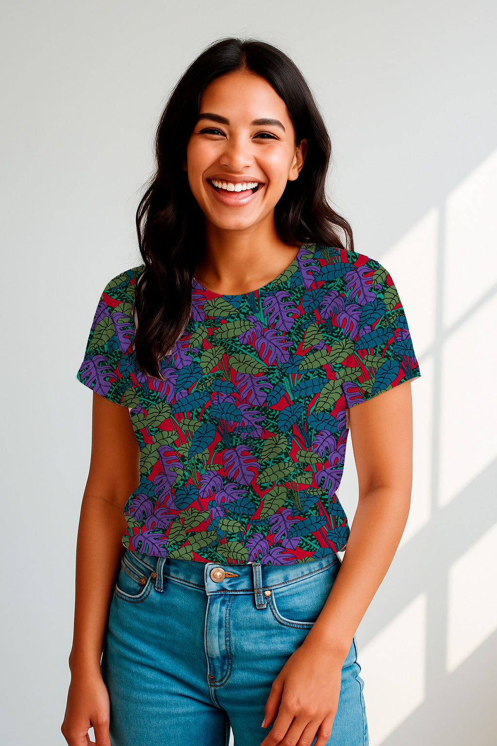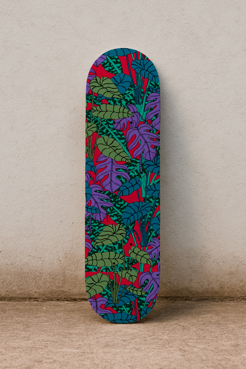 Overlapping tropical leaves in bold green, purple, and teal on a deep red background.