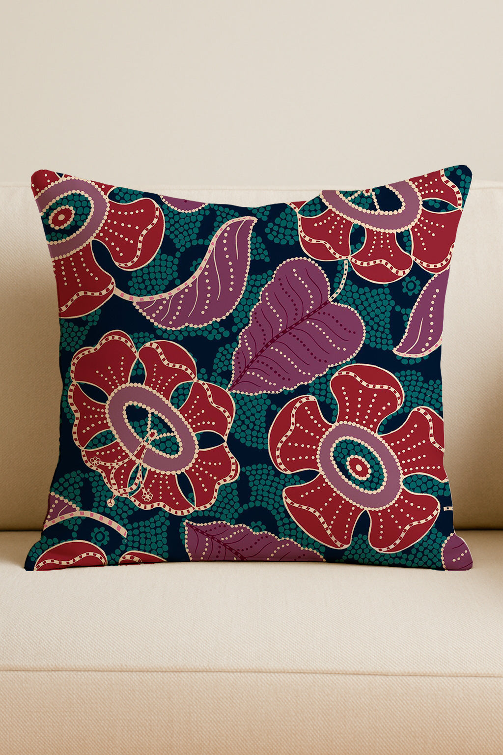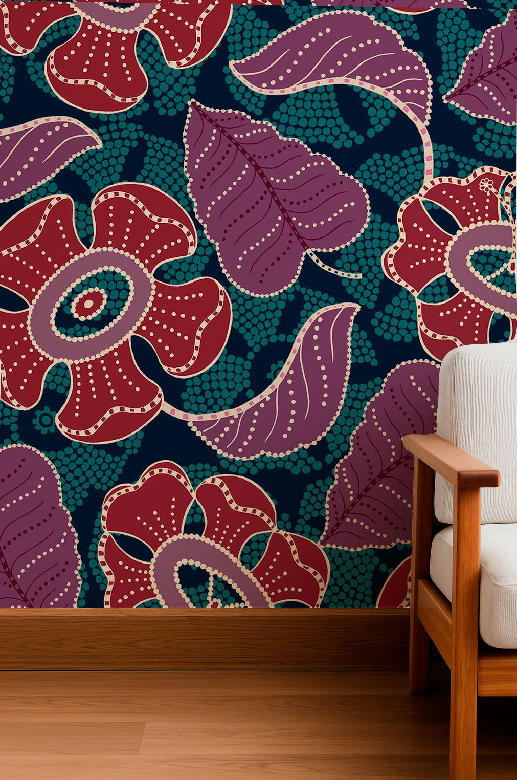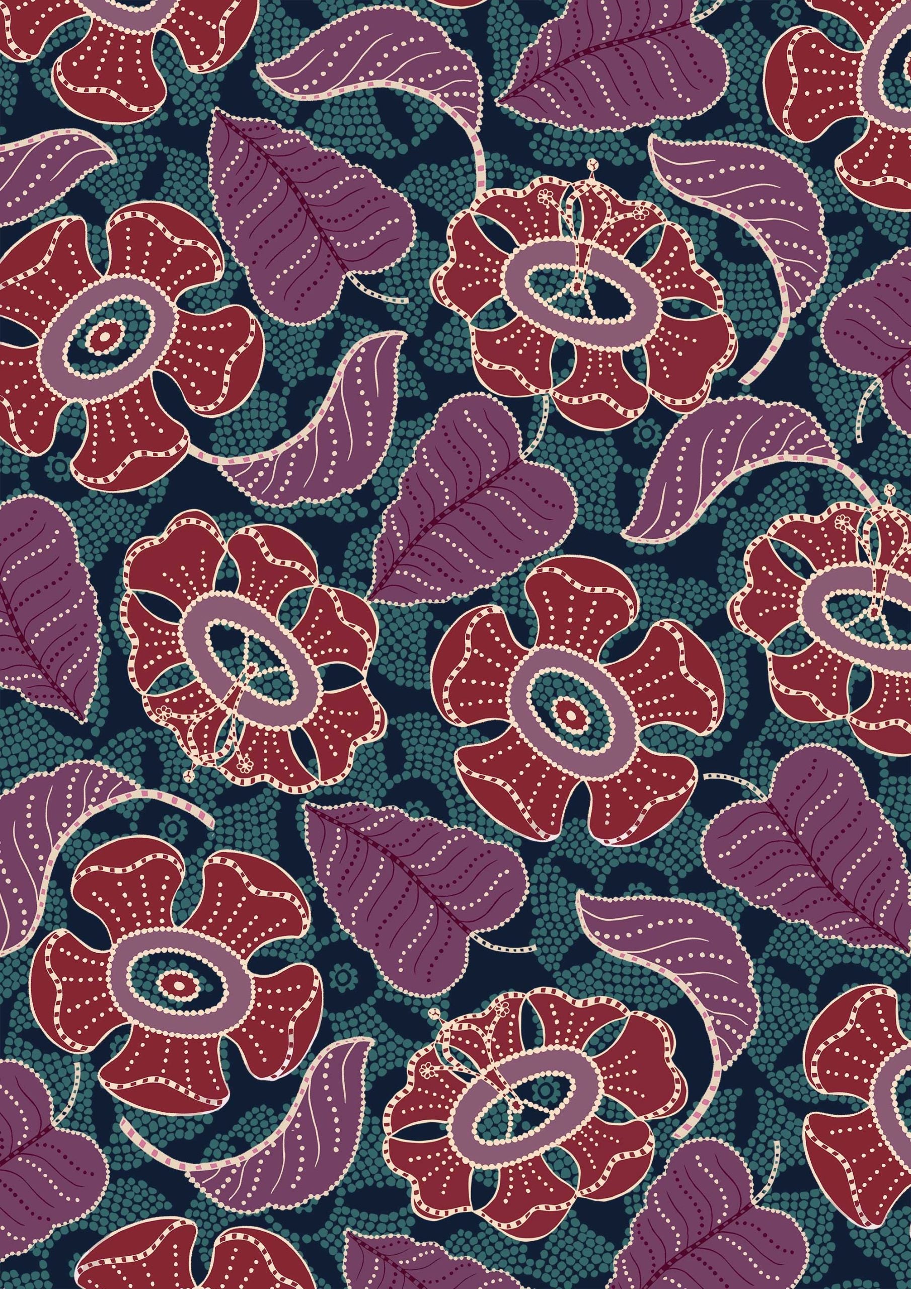 Repeating pattern of red stylized flowers with dot detailing, paired with purple leaves over textured teal. Tribal and ornamental influences.