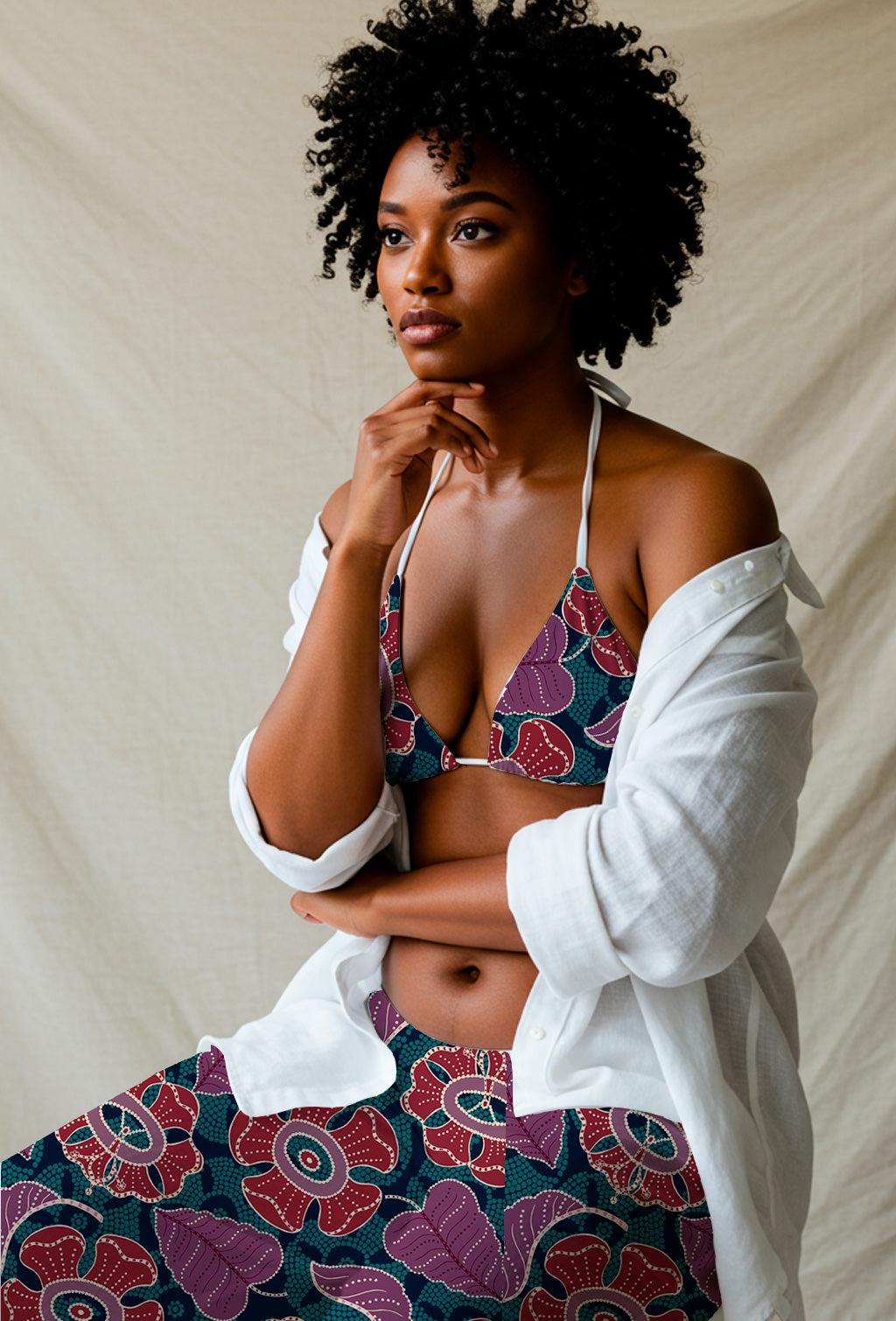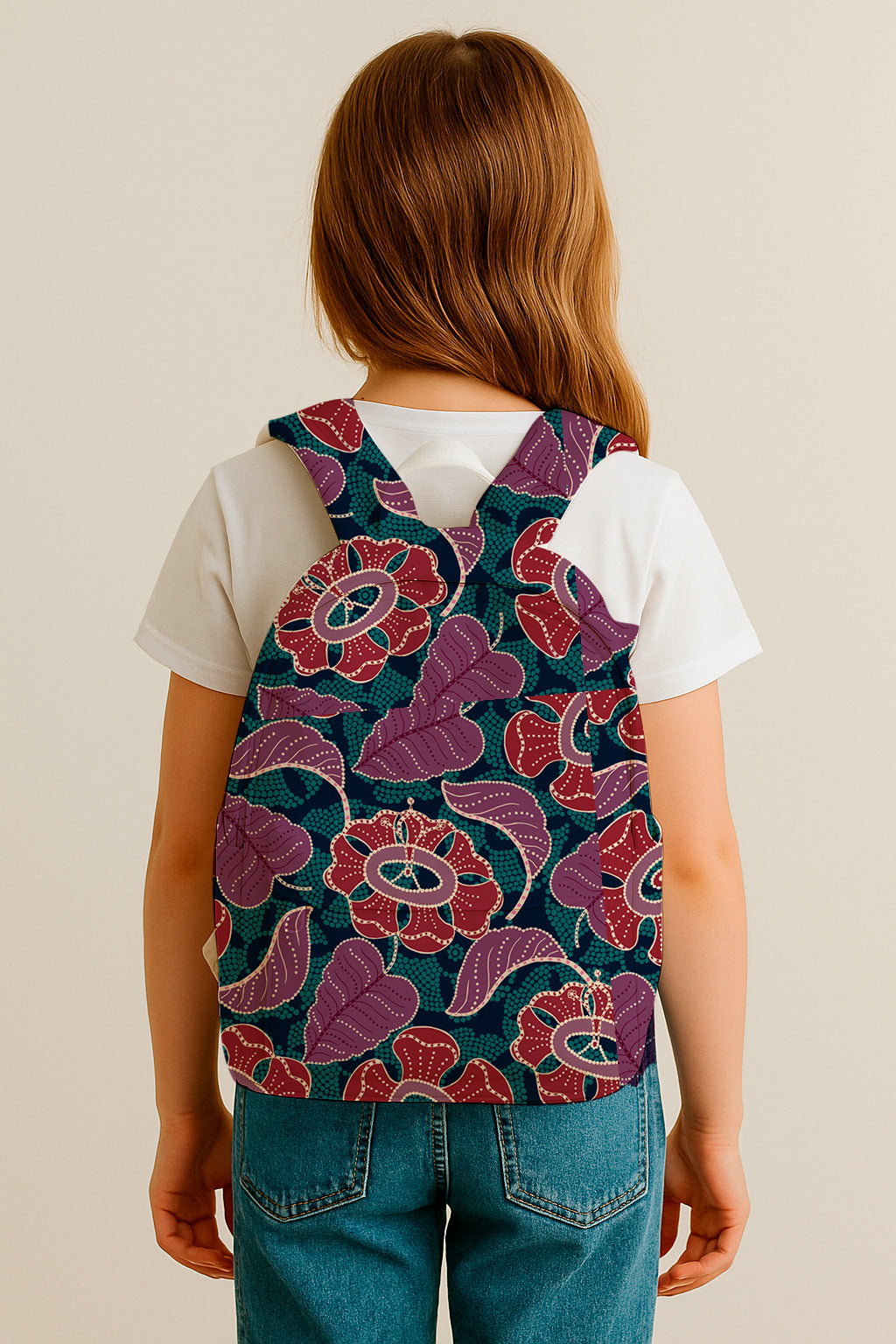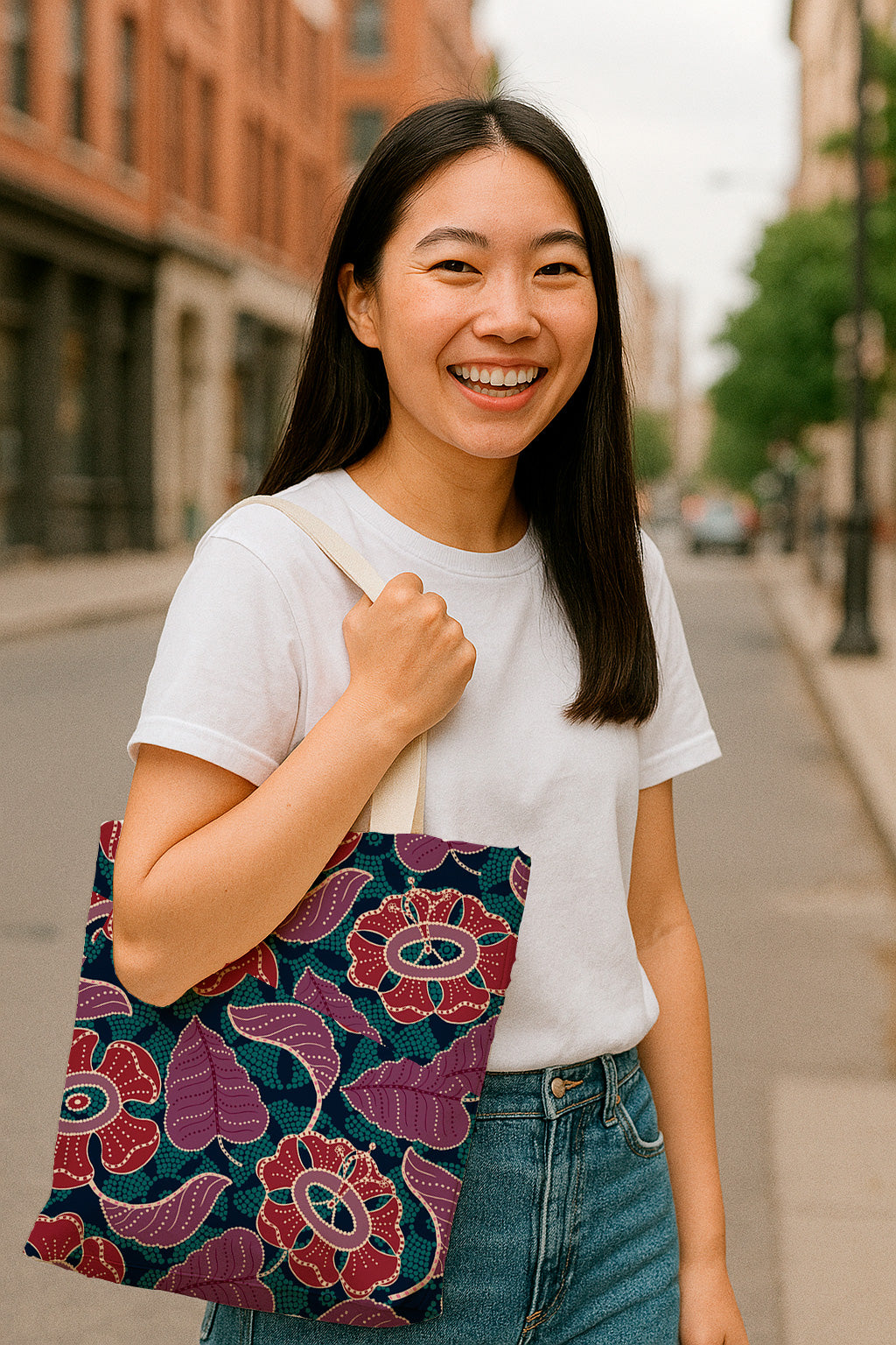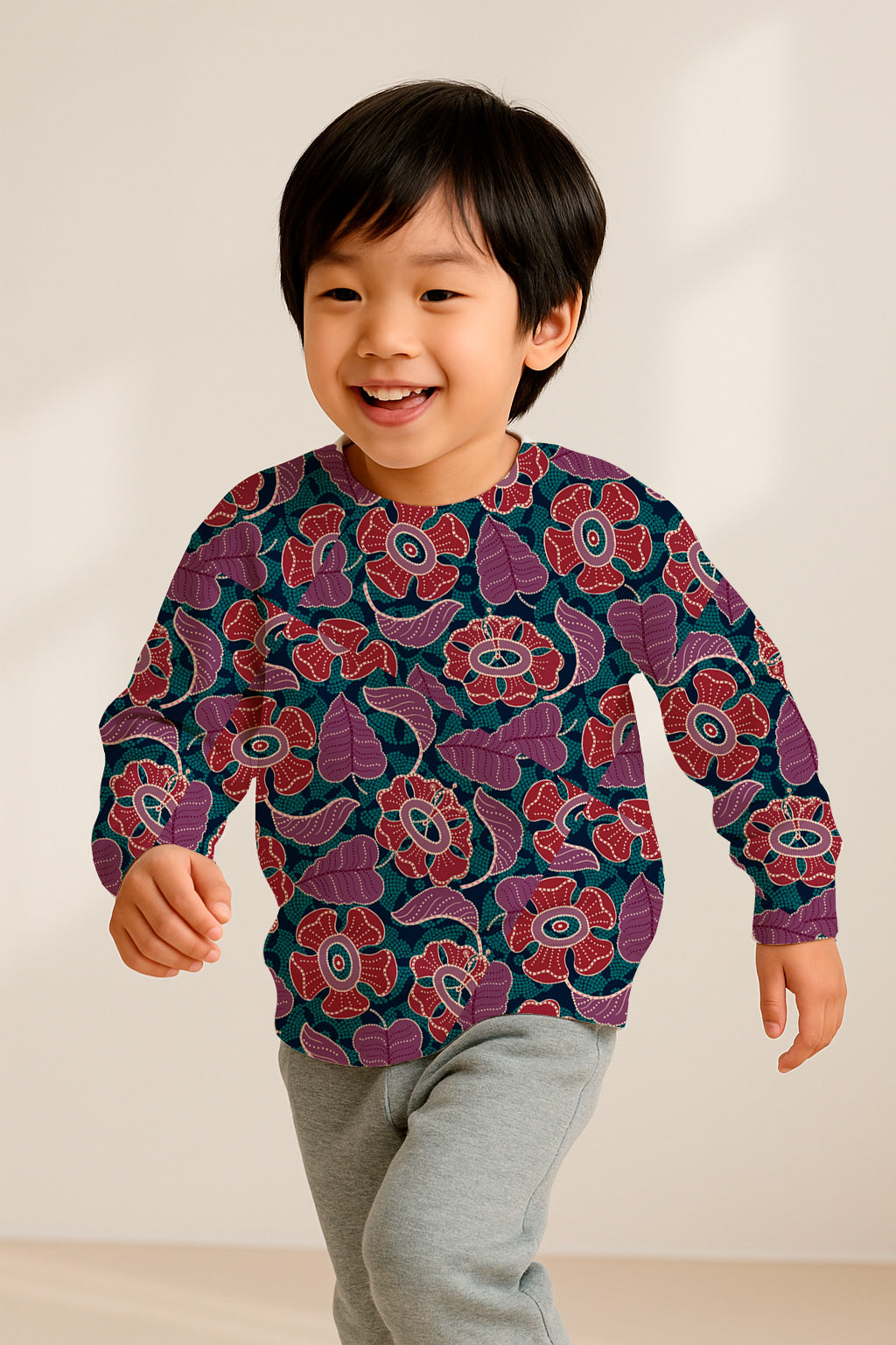 Repeating pattern of red stylized flowers with dot detailing, paired with purple leaves over textured teal. Tribal and ornamental influences.