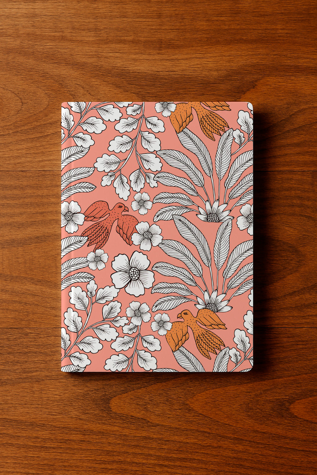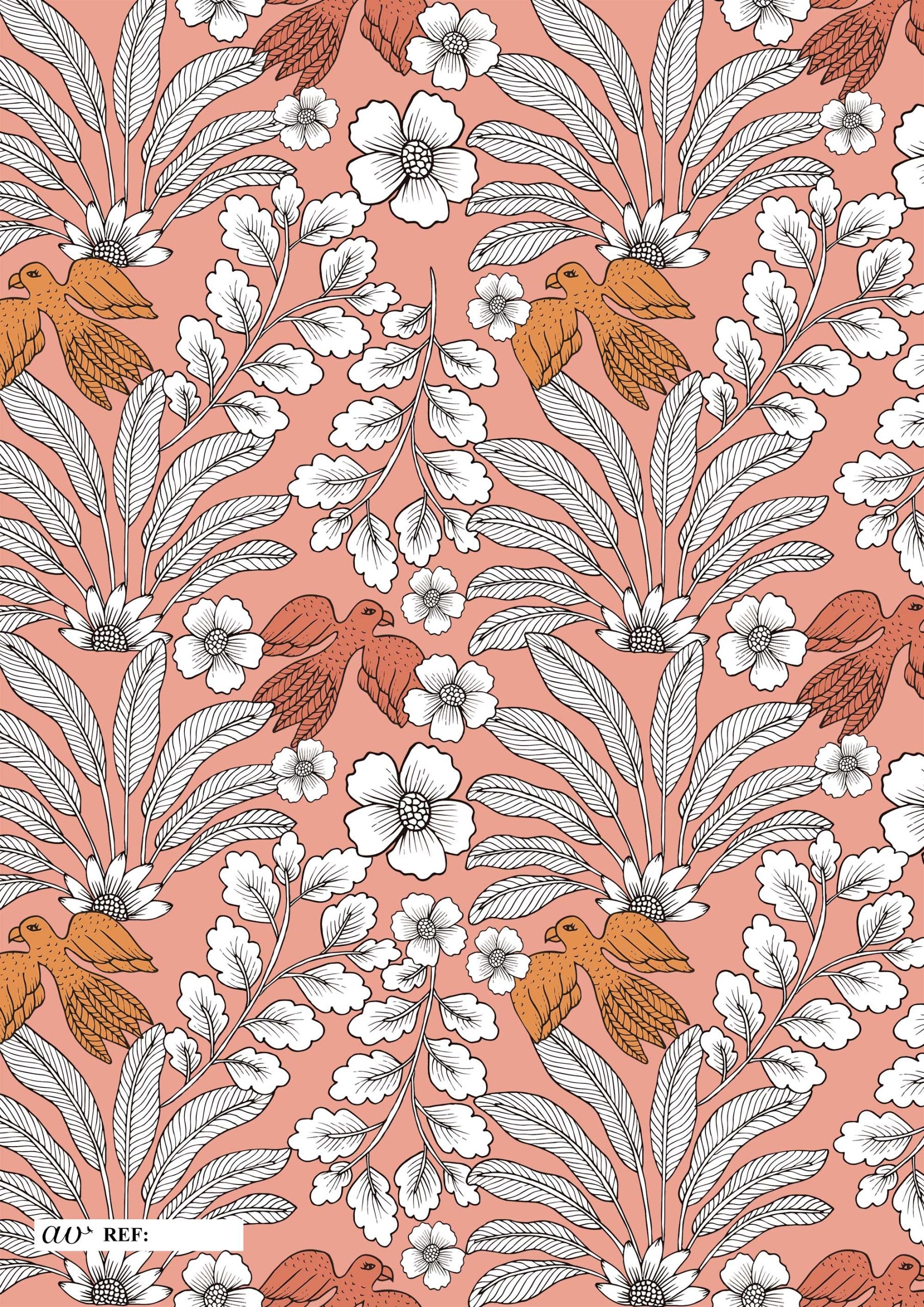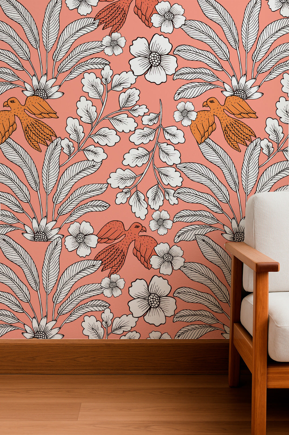 Elegant birds and detailed flowers on a soft coral background. A delicate, vintage-inspired pattern suitable for romantic and feminine designs.