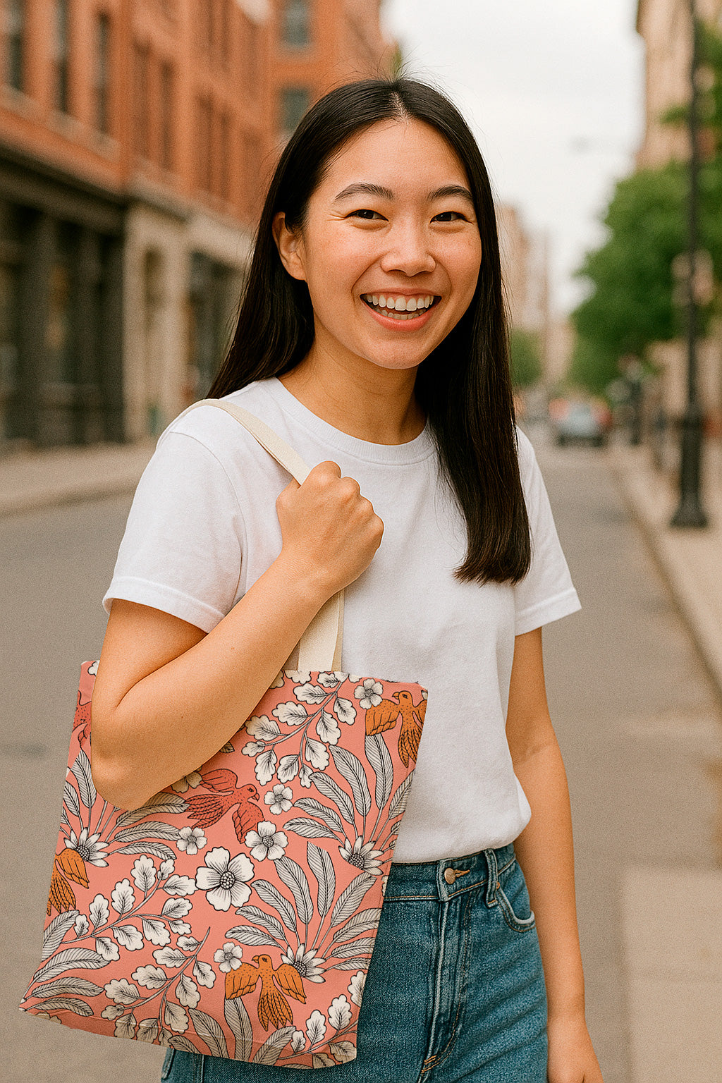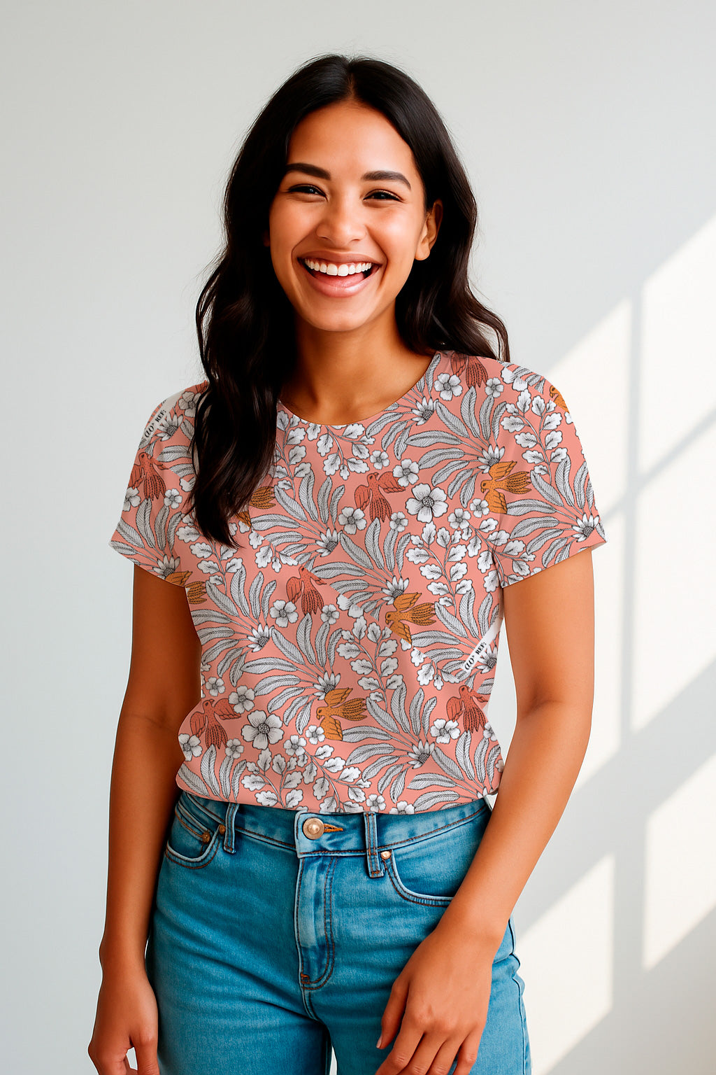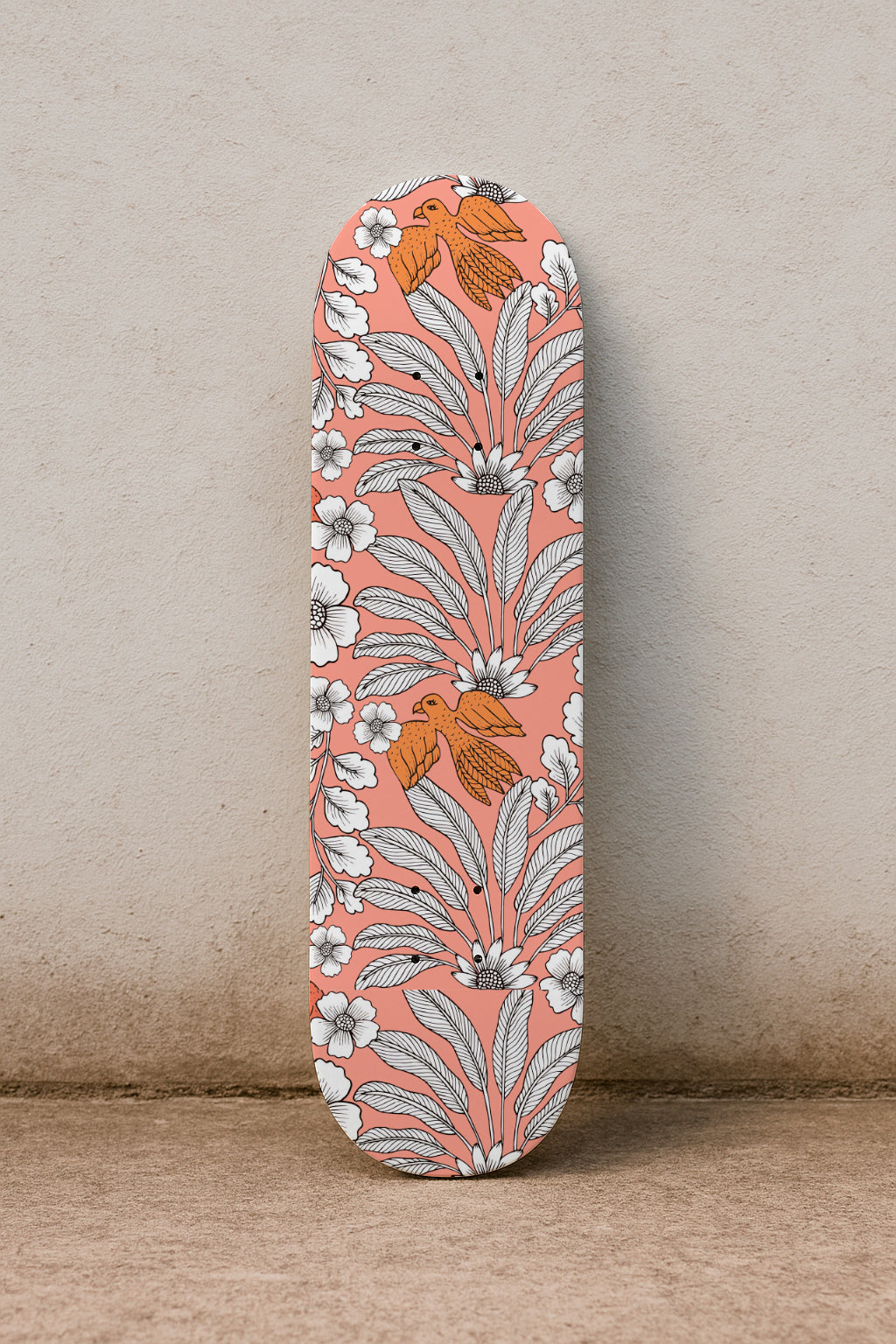 Elegant birds and detailed flowers on a soft coral background. A delicate, vintage-inspired pattern suitable for romantic and feminine designs.