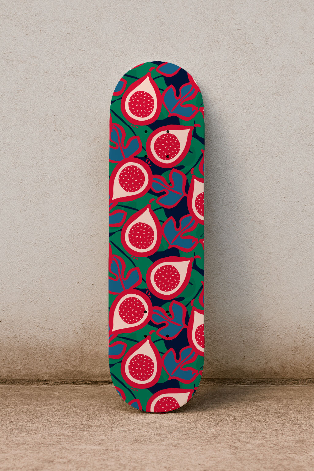 Bold and graphic fig fruit illustrations in red and cream, paired with contrasting green and blue leaves. A striking organic pattern full of energy.